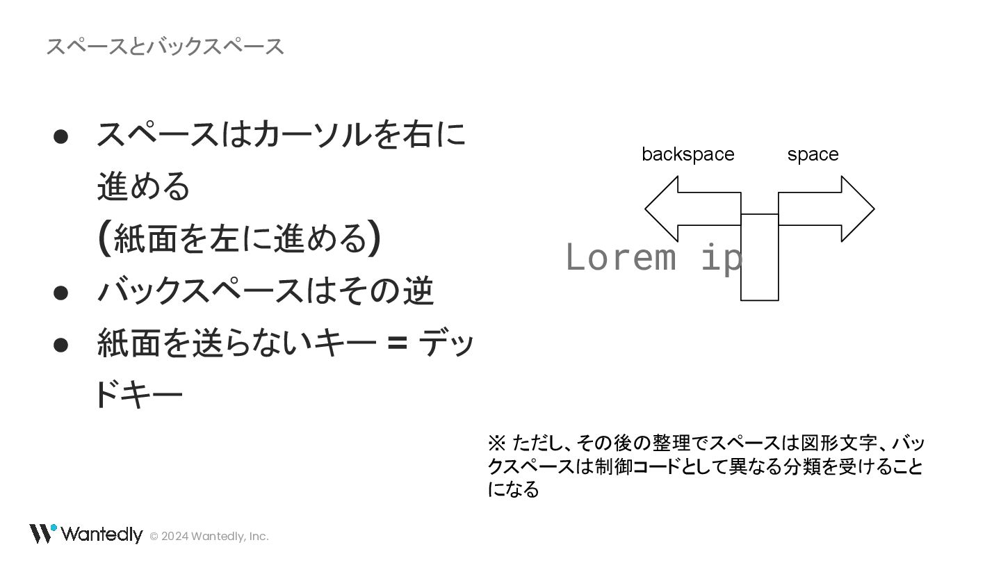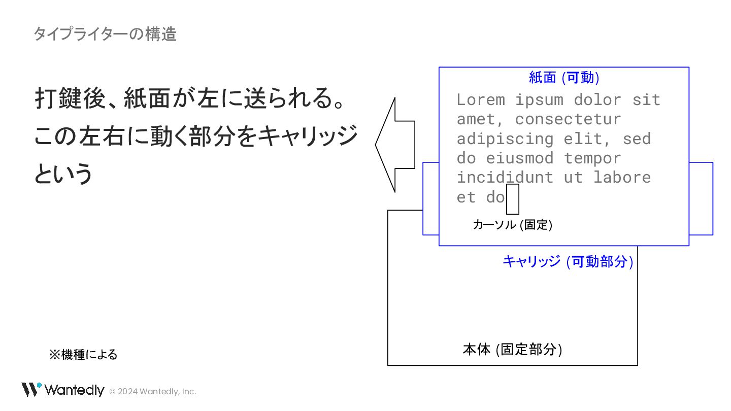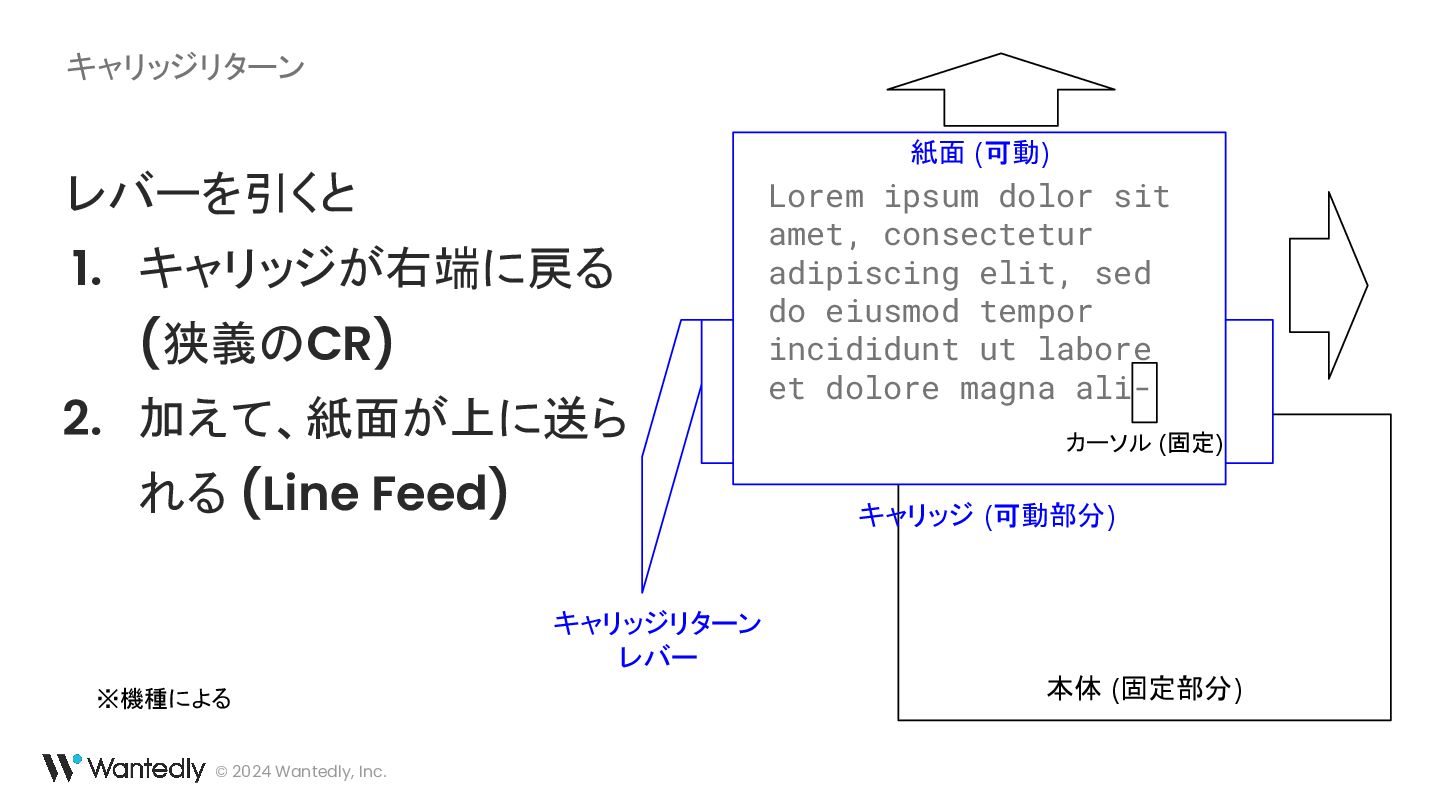 加えて、紙面が上に送ら れる (Line Feed) Lorem ipsum dolor sit amet, consectetur adipiscing elit, sed do eiusmod tempor incididunt ut labore et dolore magna ali- 紙面 (可動) 本体 (固定部分) キャリッジ (可動部分) カーソル (固定) キャリッジリターン レバー ※機種による