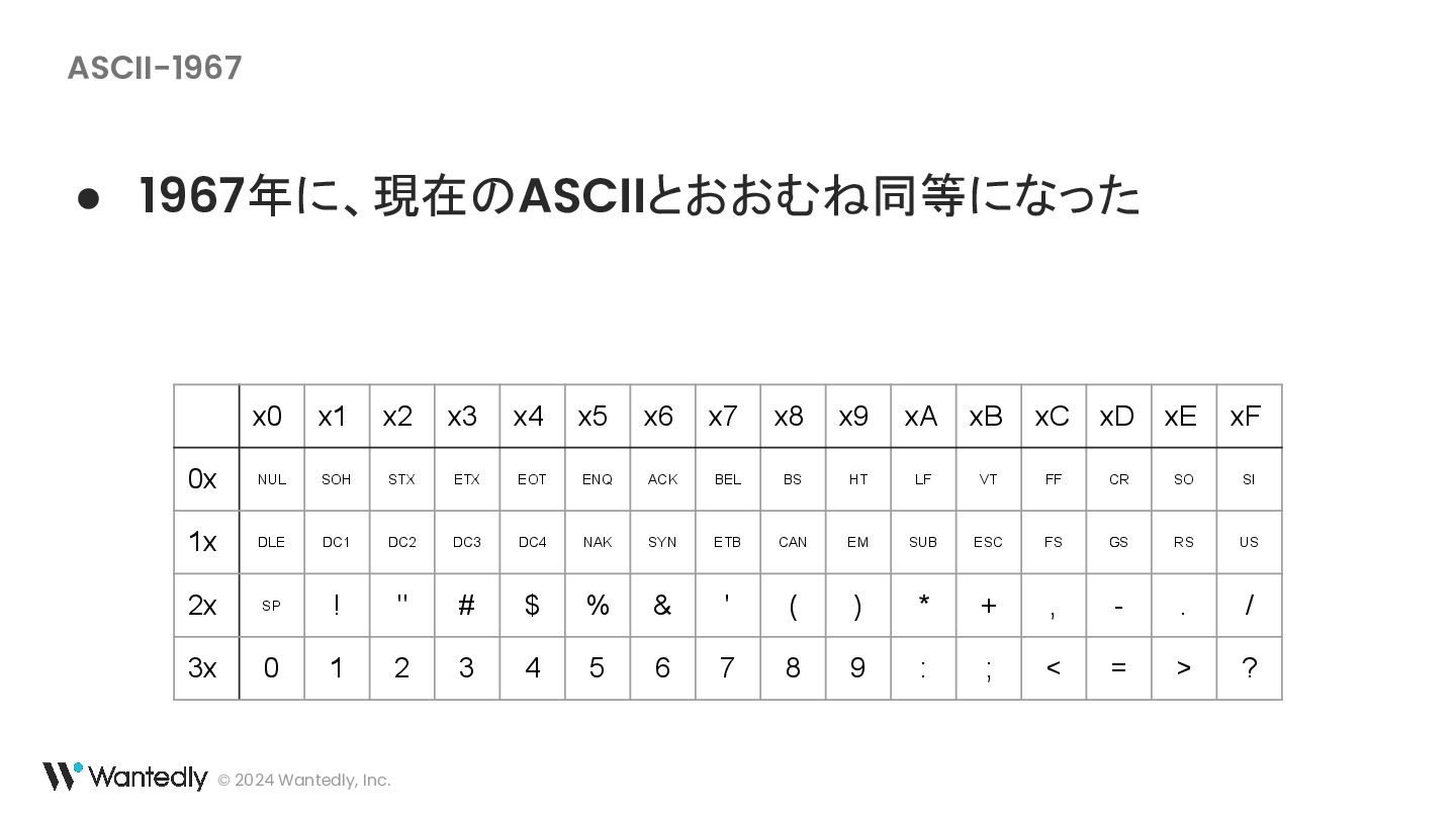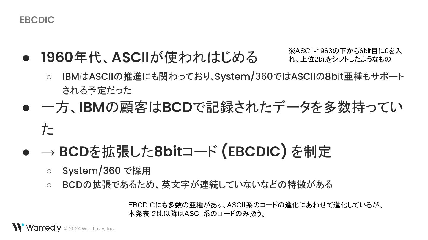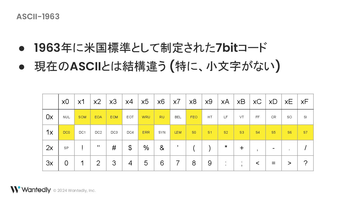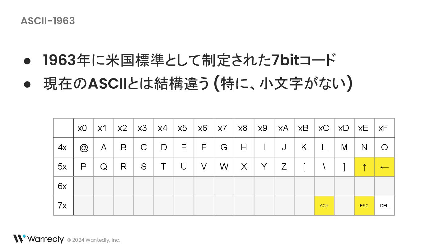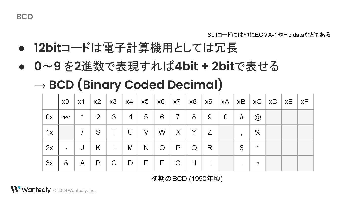 + 2bitで表せる → BCD (Binary Coded Decimal) x0 x1 x2 x3 x4 x5 x6 x7 x8 x9 xA xB xC xD xE xF 0x space 1 2 3 4 5 6 7 8 9 0 # @ 1x / S T U V W X Y Z , % 2x - J K L M N O P Q R $ * 3x & A B C D E F G H I . ⌑ 初期のBCD (1950年頃) 6bitコードには他にECMA-1やFieldataなどもある