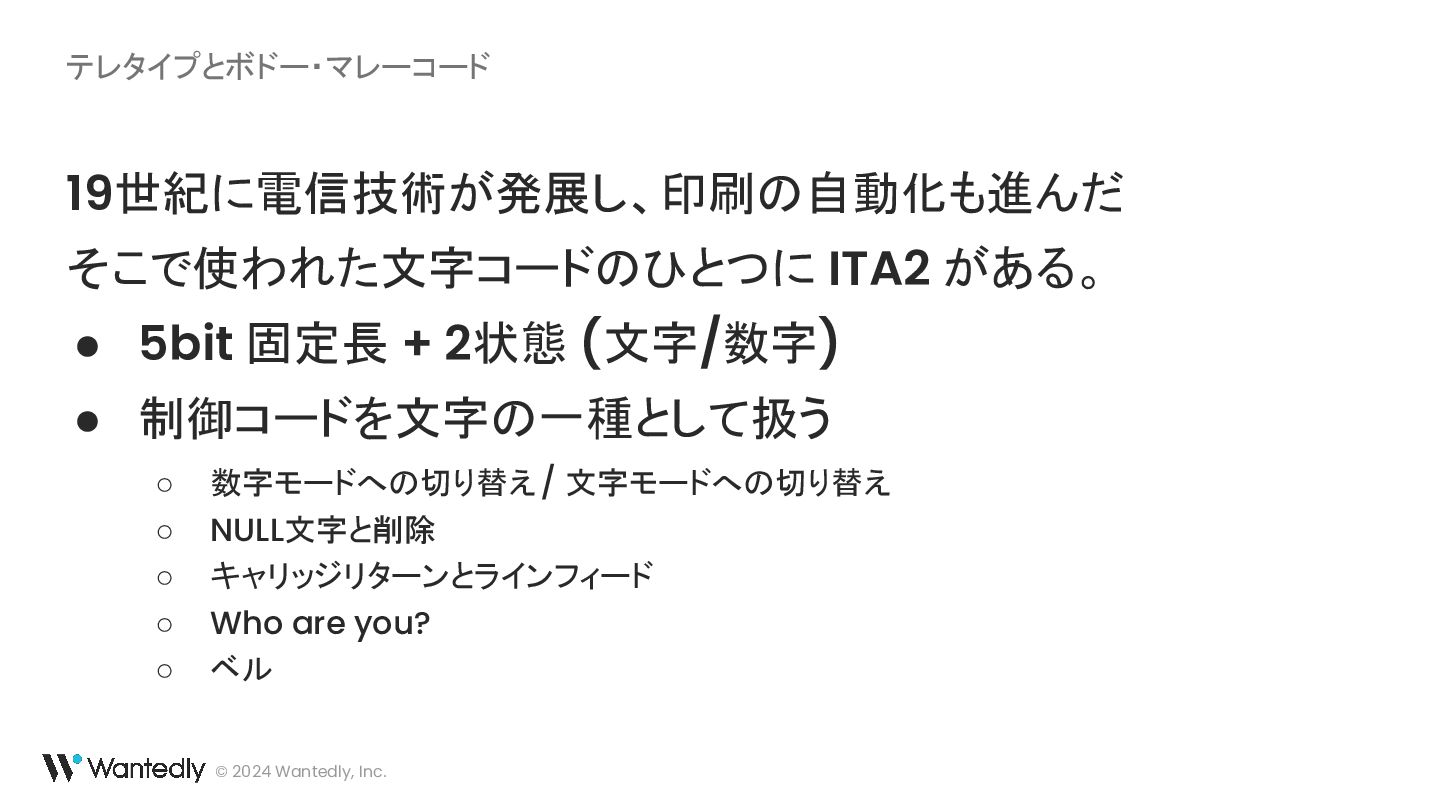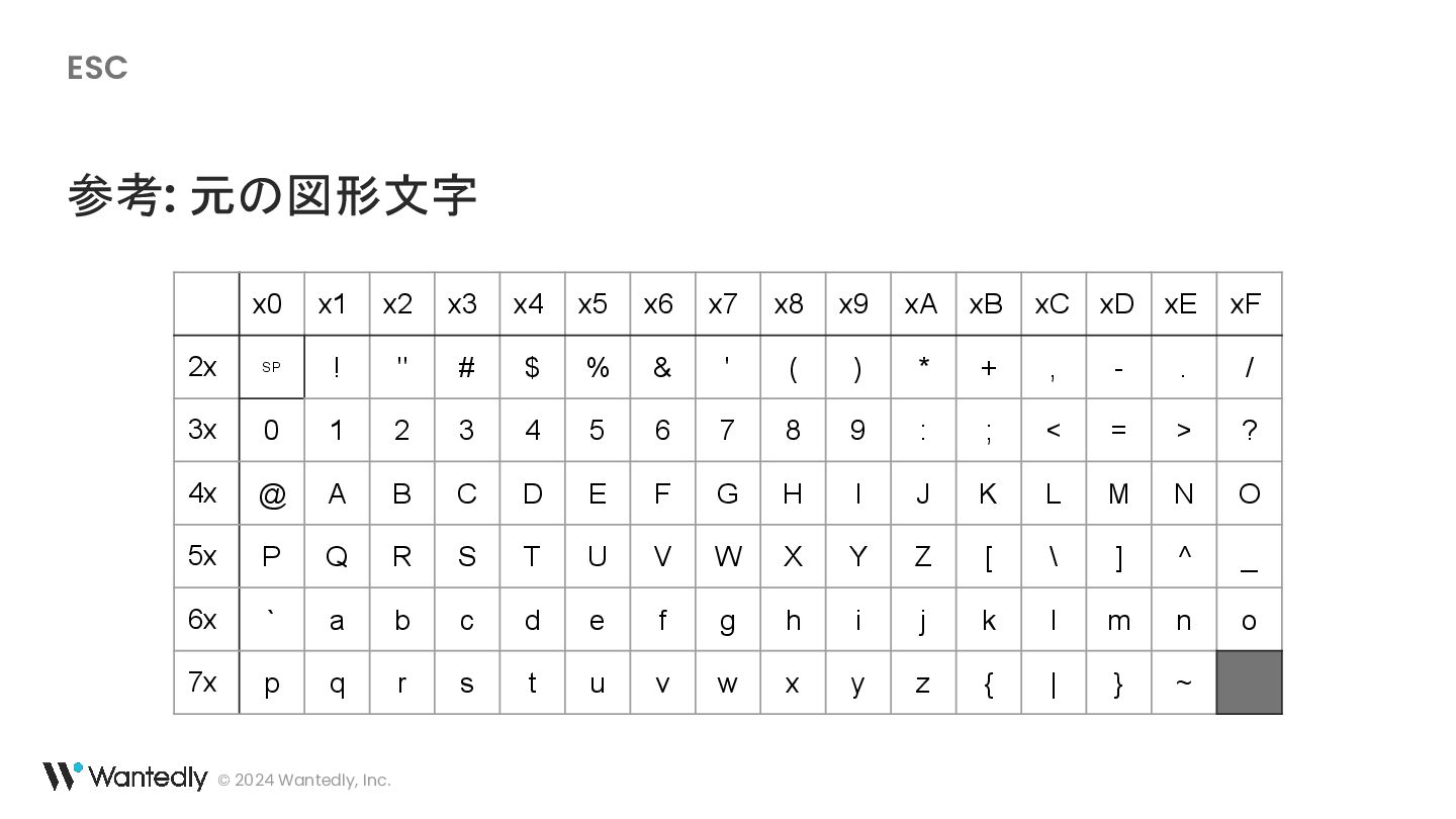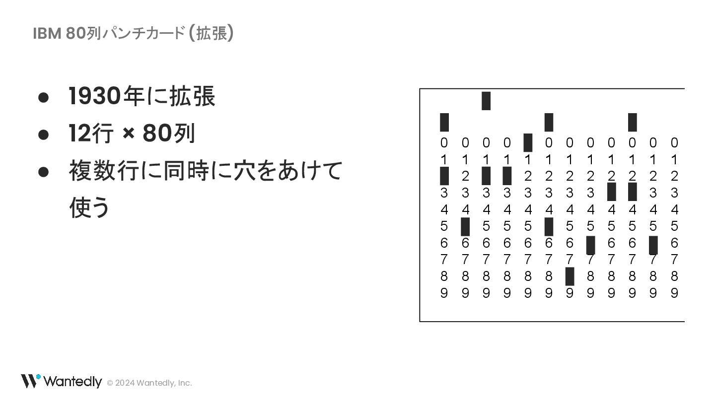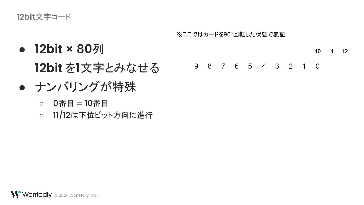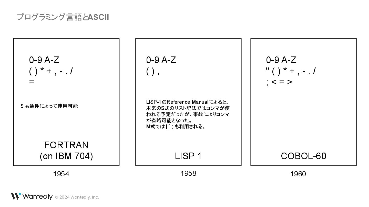 + 2bitで表せる → BCD (Binary Coded Decimal) x0 x1 x2 x3 x4 x5 x6 x7 x8 x9 xA xB xC xD xE xF 0x space 1 2 3 4 5 6 7 8 9 0 # @ 1x / S T U V W X Y Z , % 2x - J K L M N O P Q R $ * 3x & A B C D E F G H I . ⌑ 初期のBCD (1950年頃) 6bitコードには他にECMA-1やFieldataなどもある