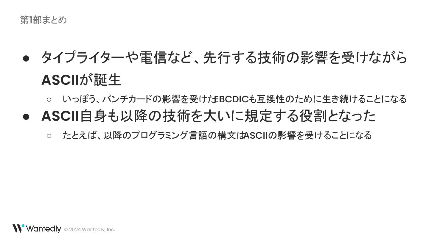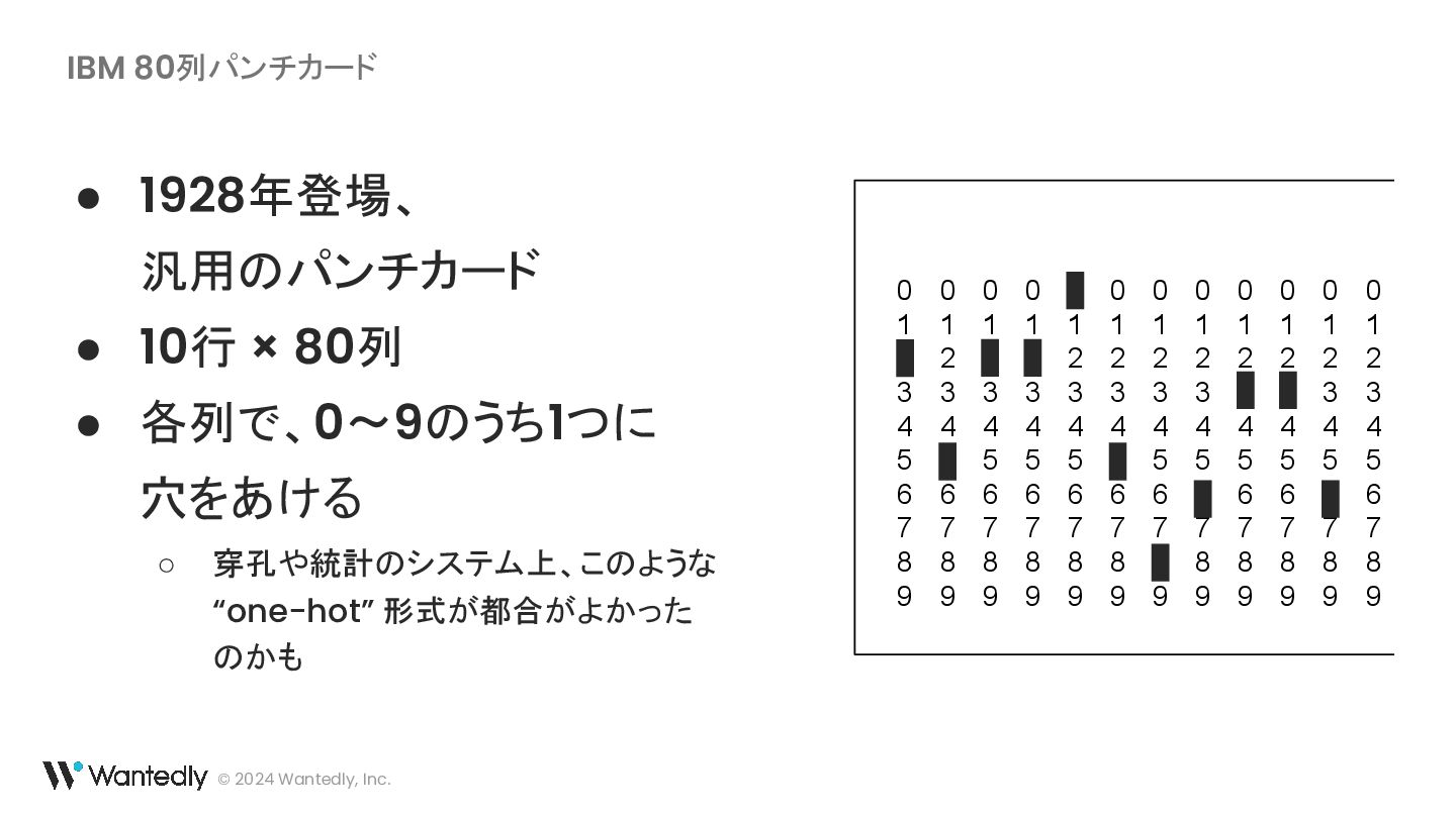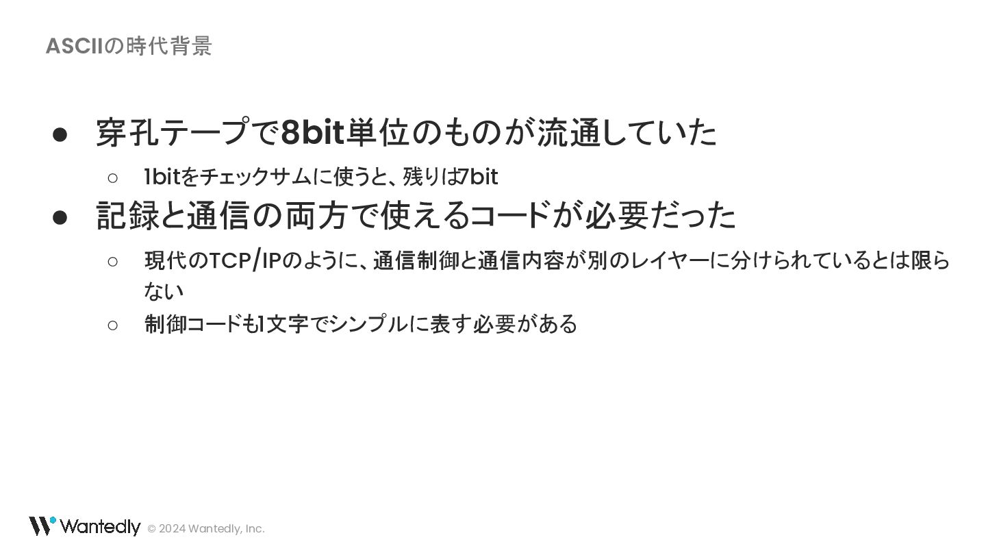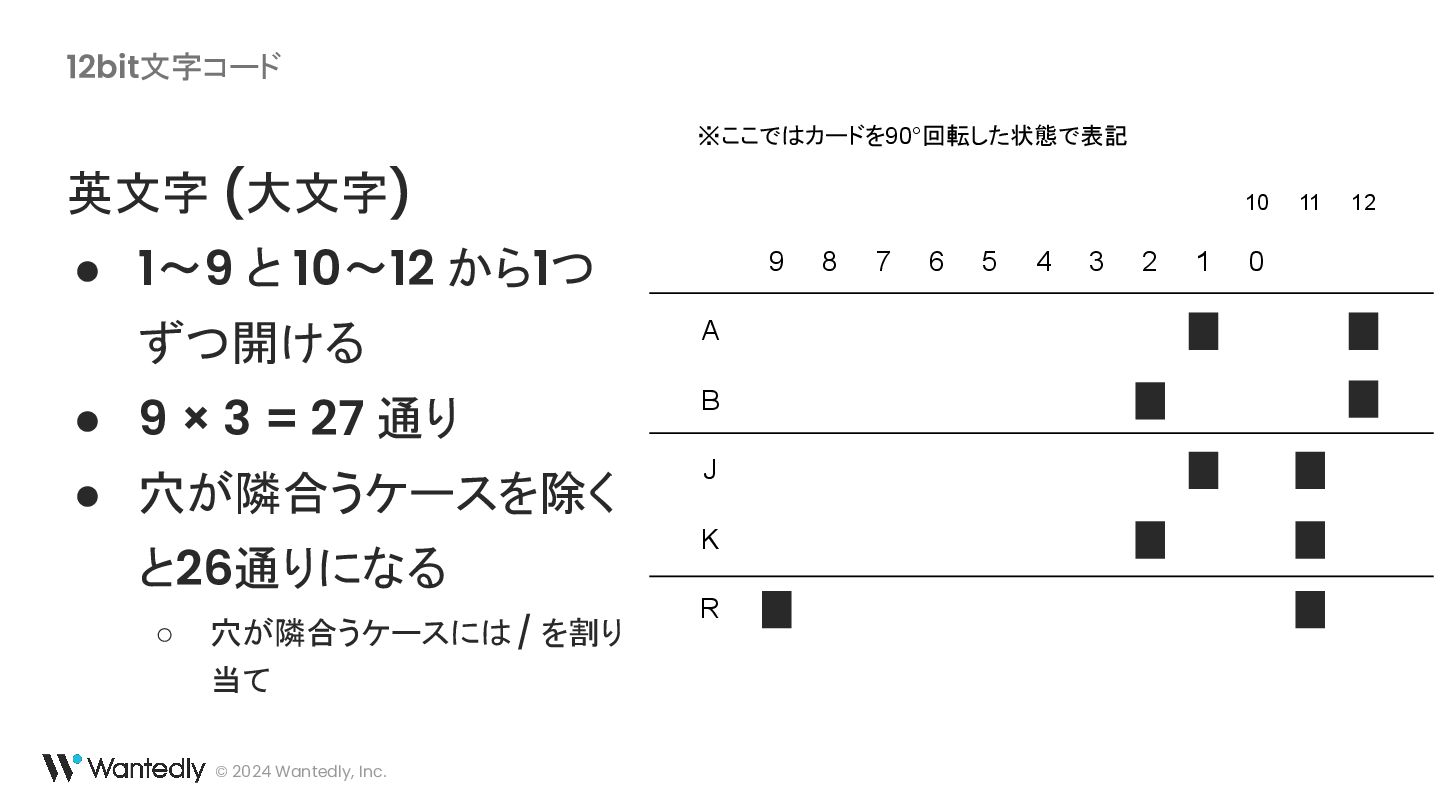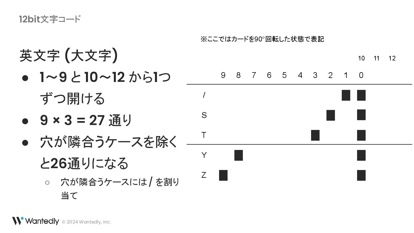 + 2bitで表せる → BCD (Binary Coded Decimal) x0 x1 x2 x3 x4 x5 x6 x7 x8 x9 xA xB xC xD xE xF 0x space 1 2 3 4 5 6 7 8 9 0 # @ 1x / S T U V W X Y Z , % 2x - J K L M N O P Q R $ * 3x & A B C D E F G H I . ⌑ 初期のBCD (1950年頃) 6bitコードには他にECMA-1やFieldataなどもある