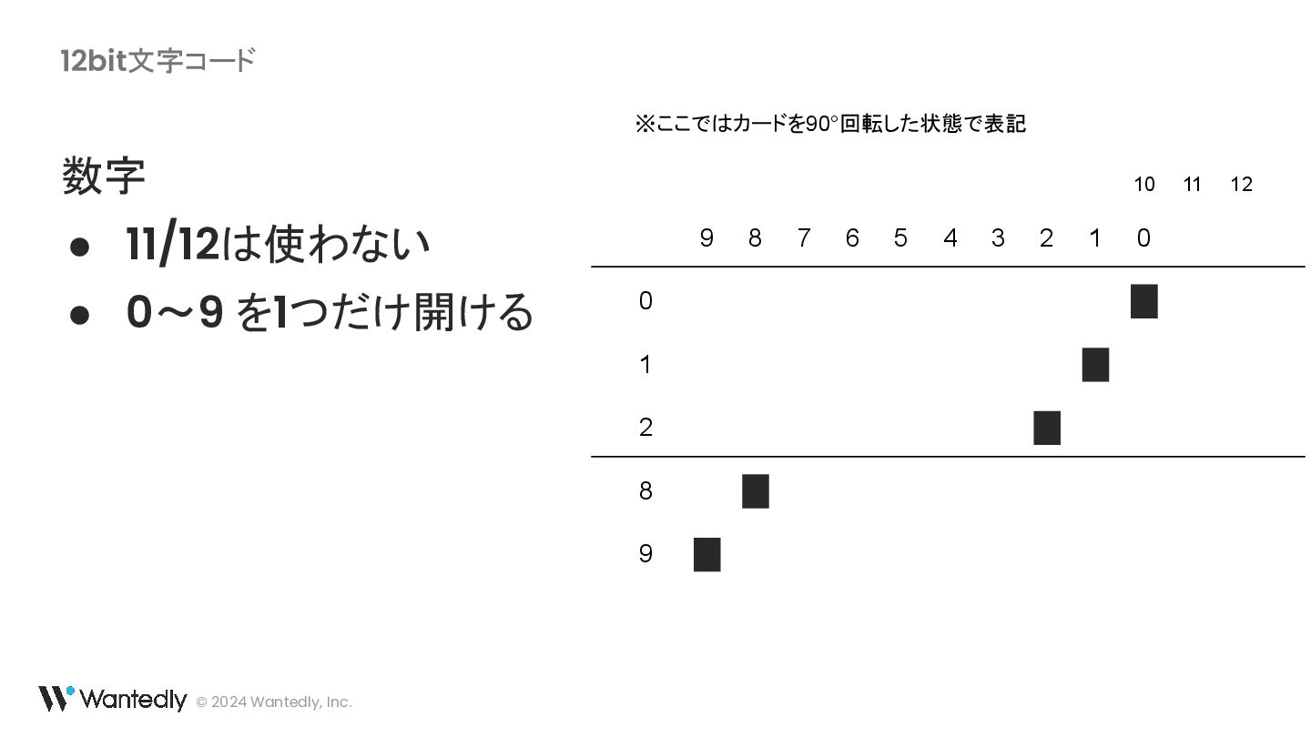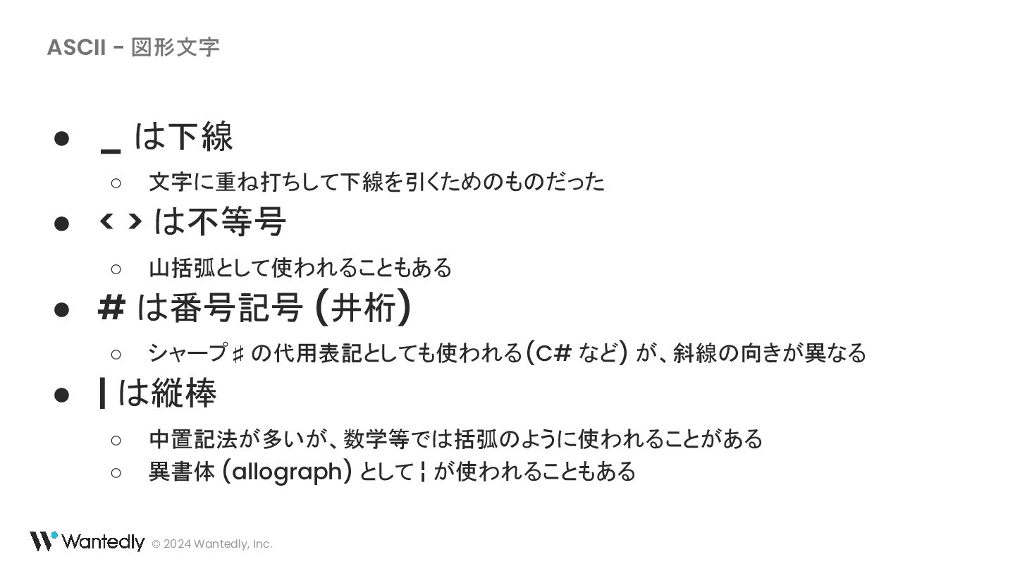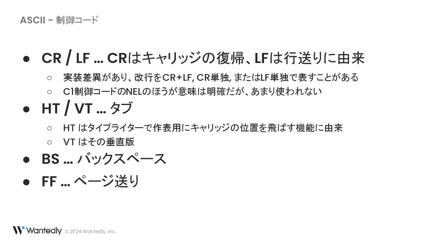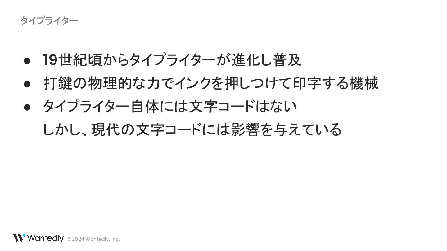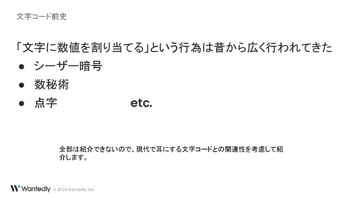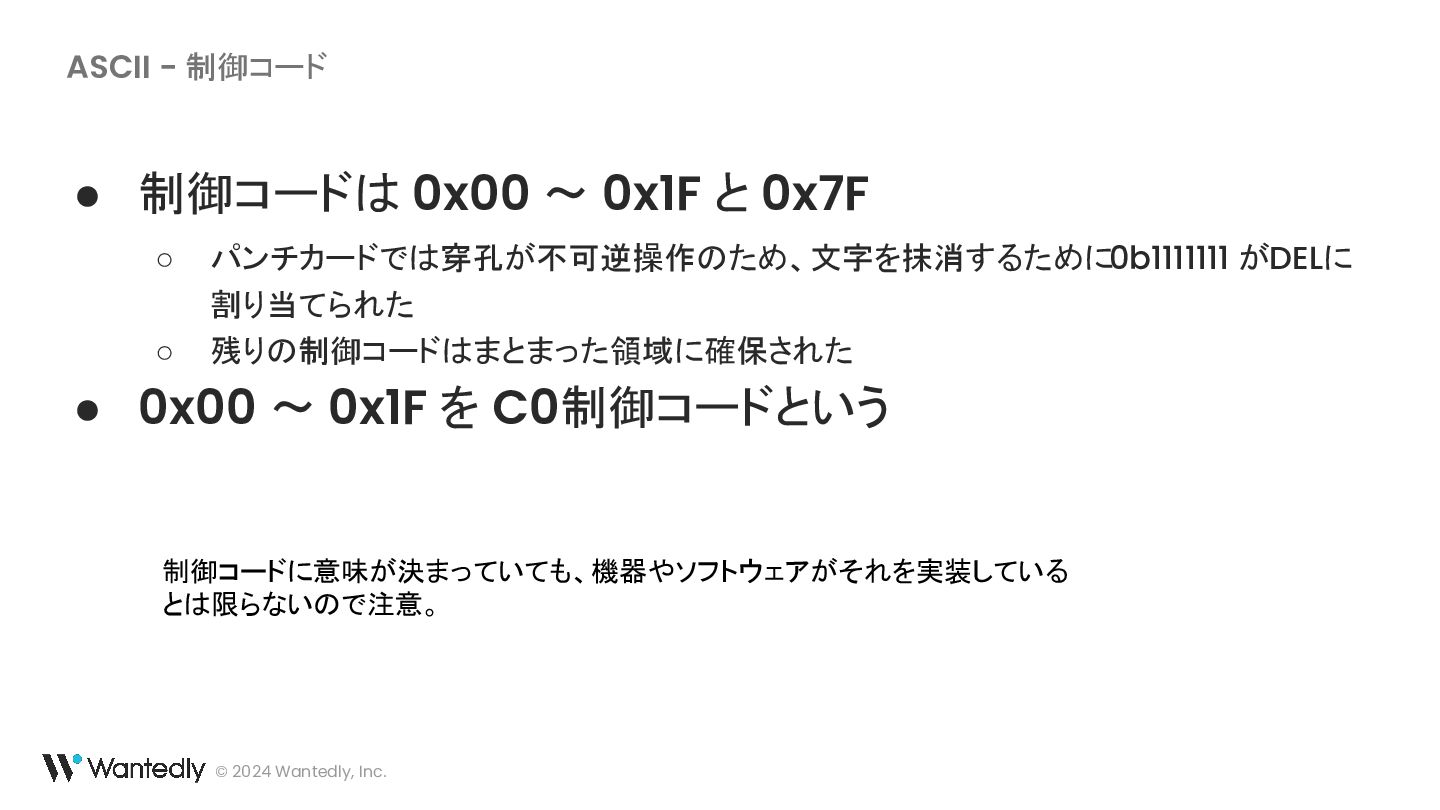 + 2bitで表せる → BCD (Binary Coded Decimal) x0 x1 x2 x3 x4 x5 x6 x7 x8 x9 xA xB xC xD xE xF 0x space 1 2 3 4 5 6 7 8 9 0 # @ 1x / S T U V W X Y Z , % 2x - J K L M N O P Q R $ * 3x & A B C D E F G H I . ⌑ 初期のBCD (1950年頃) 6bitコードには他にECMA-1やFieldataなどもある