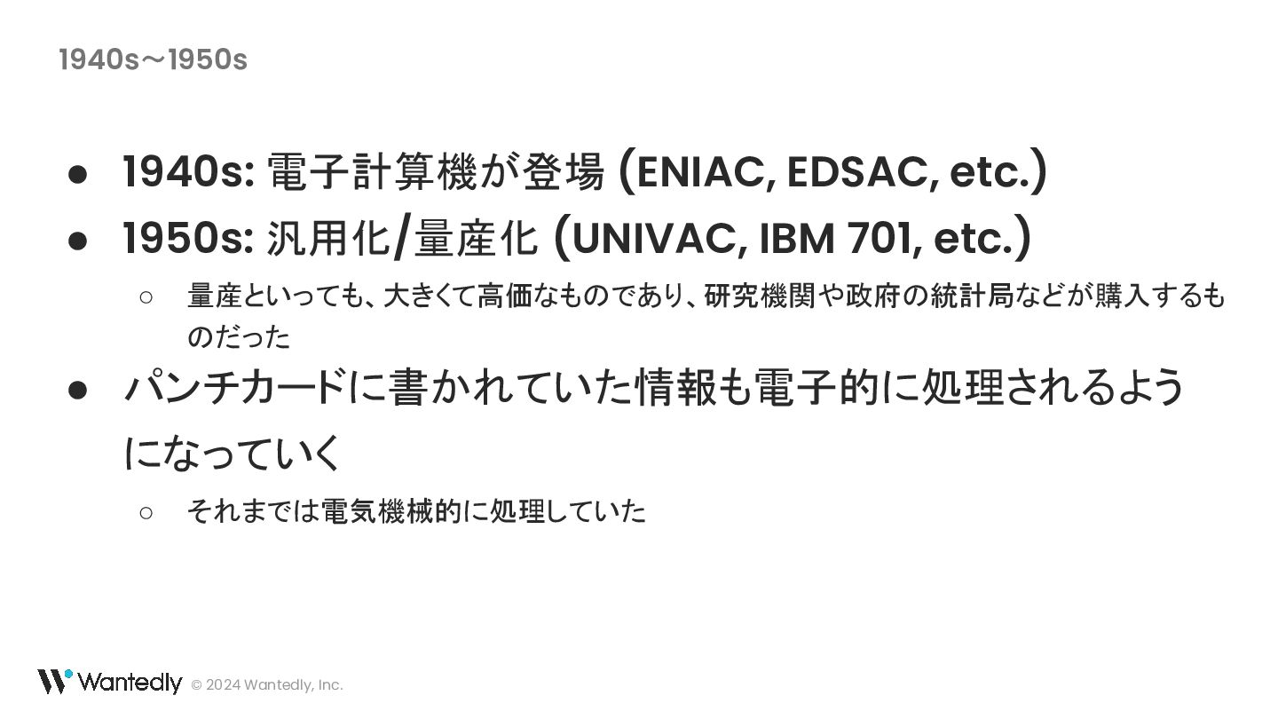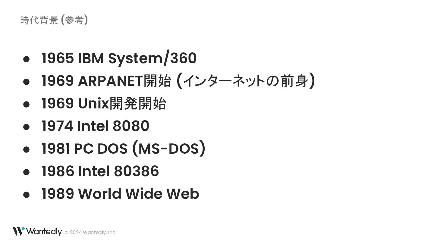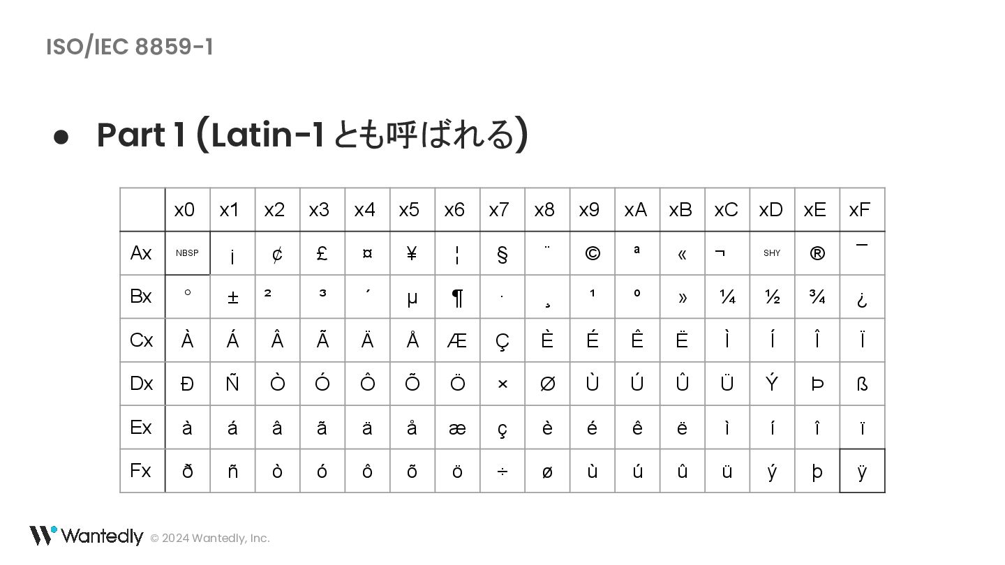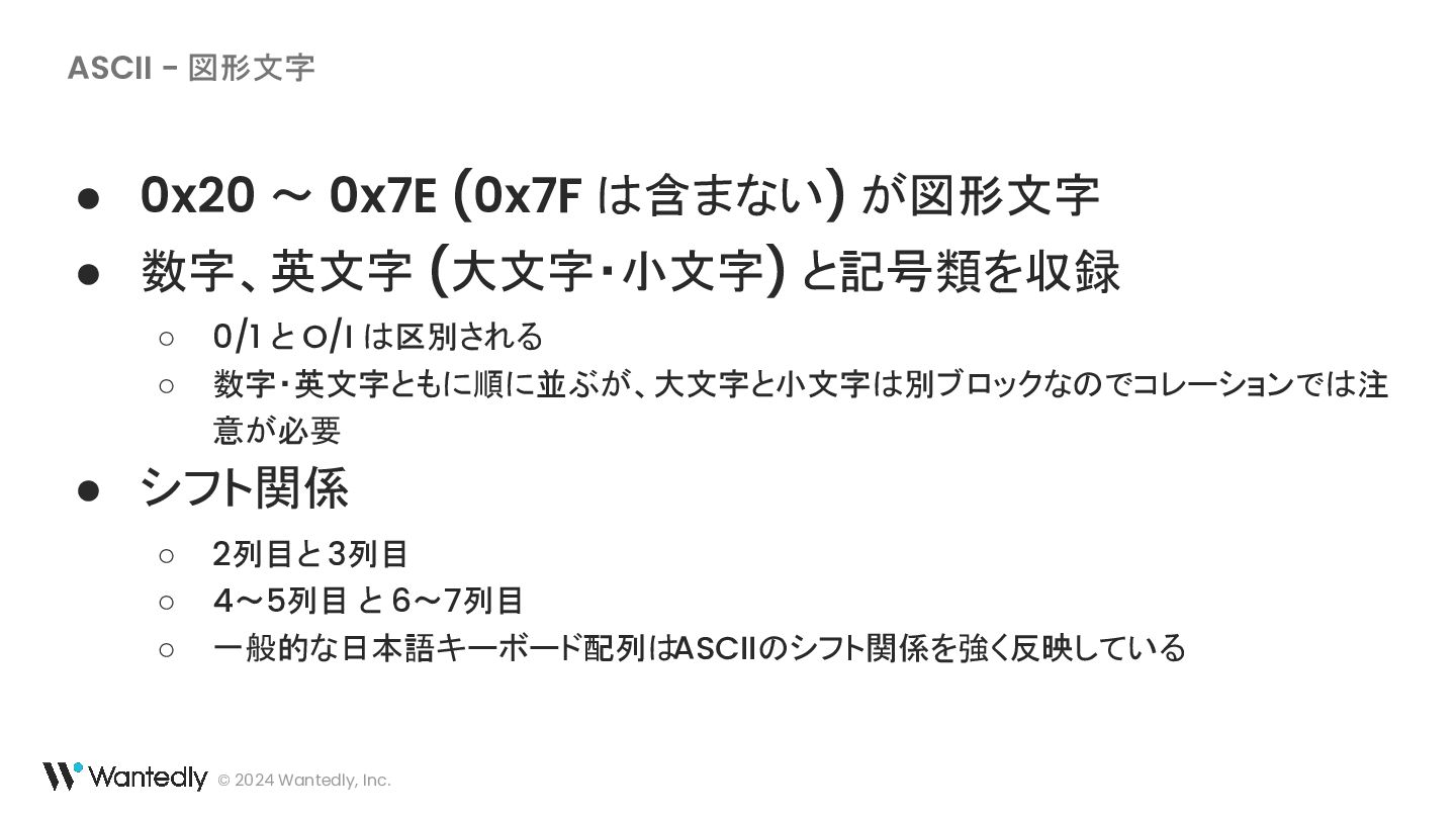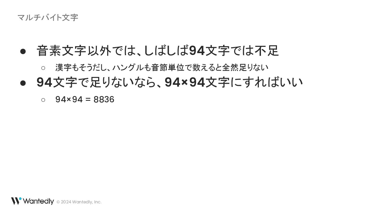 + 2bitで表せる → BCD (Binary Coded Decimal) x0 x1 x2 x3 x4 x5 x6 x7 x8 x9 xA xB xC xD xE xF 0x space 1 2 3 4 5 6 7 8 9 0 # @ 1x / S T U V W X Y Z , % 2x - J K L M N O P Q R $ * 3x & A B C D E F G H I . ⌑ 初期のBCD (1950年頃) 6bitコードには他にECMA-1やFieldataなどもある