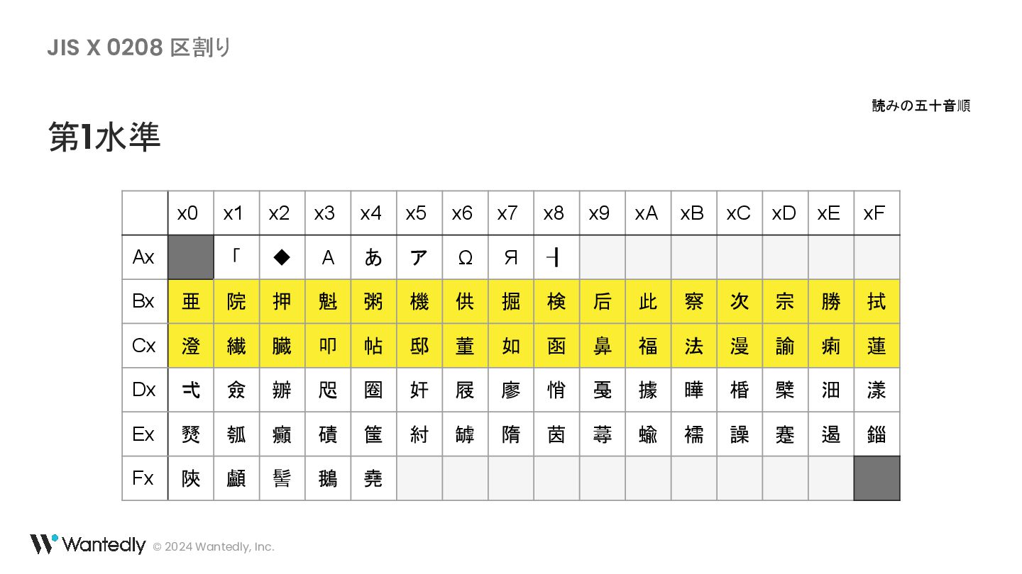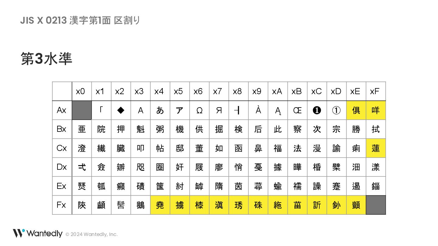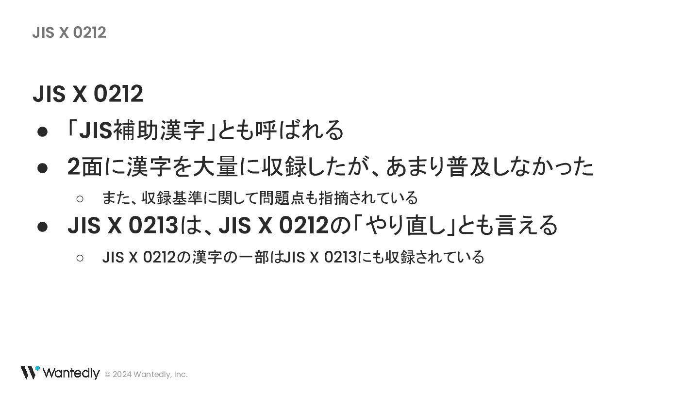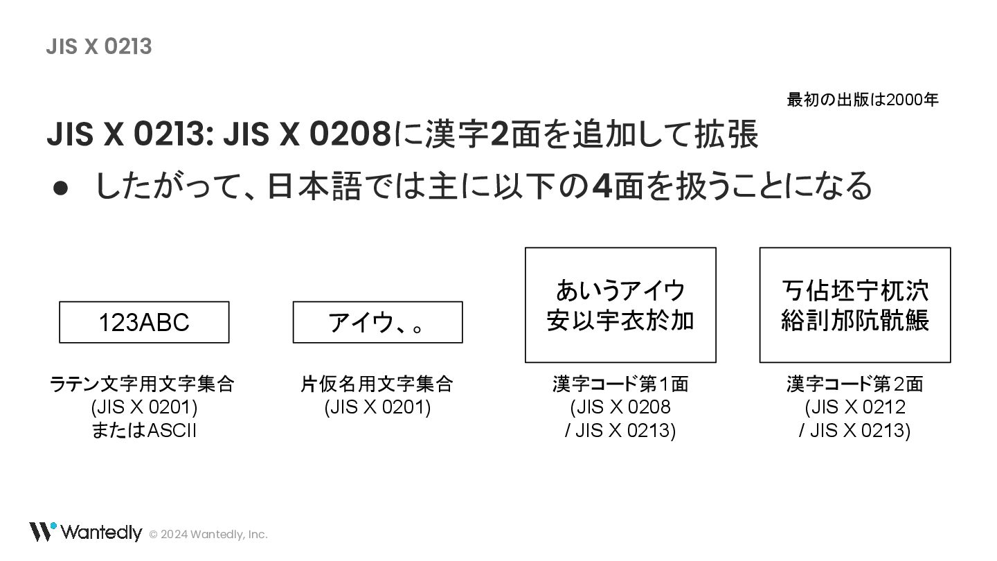 JIS X 0208に漢字2面を追加して拡張 • したがって、日本語では主に以下の4面を扱うことになる 最初の出版は2000年 123ABC ラテン文字用文字集合 (JIS X 0201) またはASCII アイウ、。 片仮名用文字集合 (JIS X 0201) あいうアイウ 安以宇衣於加 漢字コード第1面 (JIS X 0208 / JIS X 0213) 丂佔坯宁杌泬 綌䚯邡阬骯𩸕 漢字コード第2面 (JIS X 0212 / JIS X 0213)