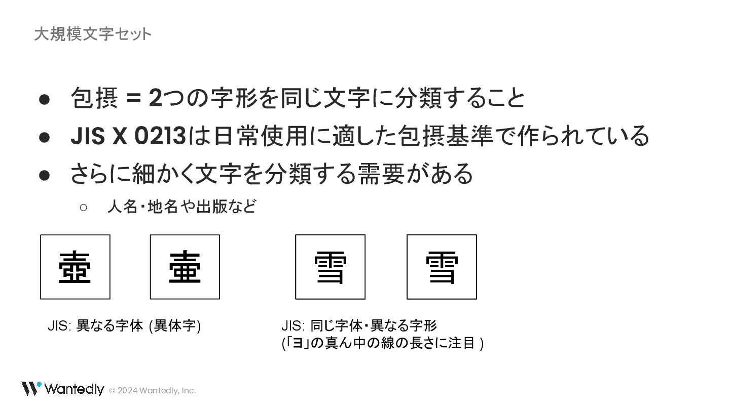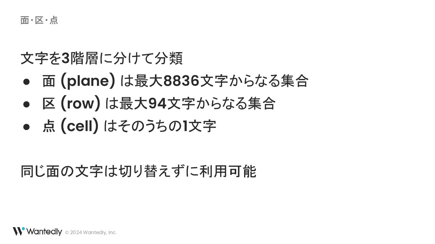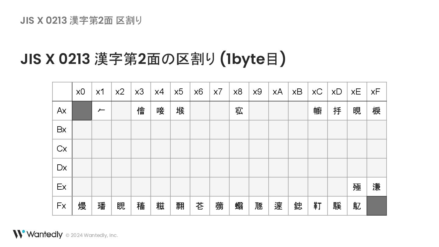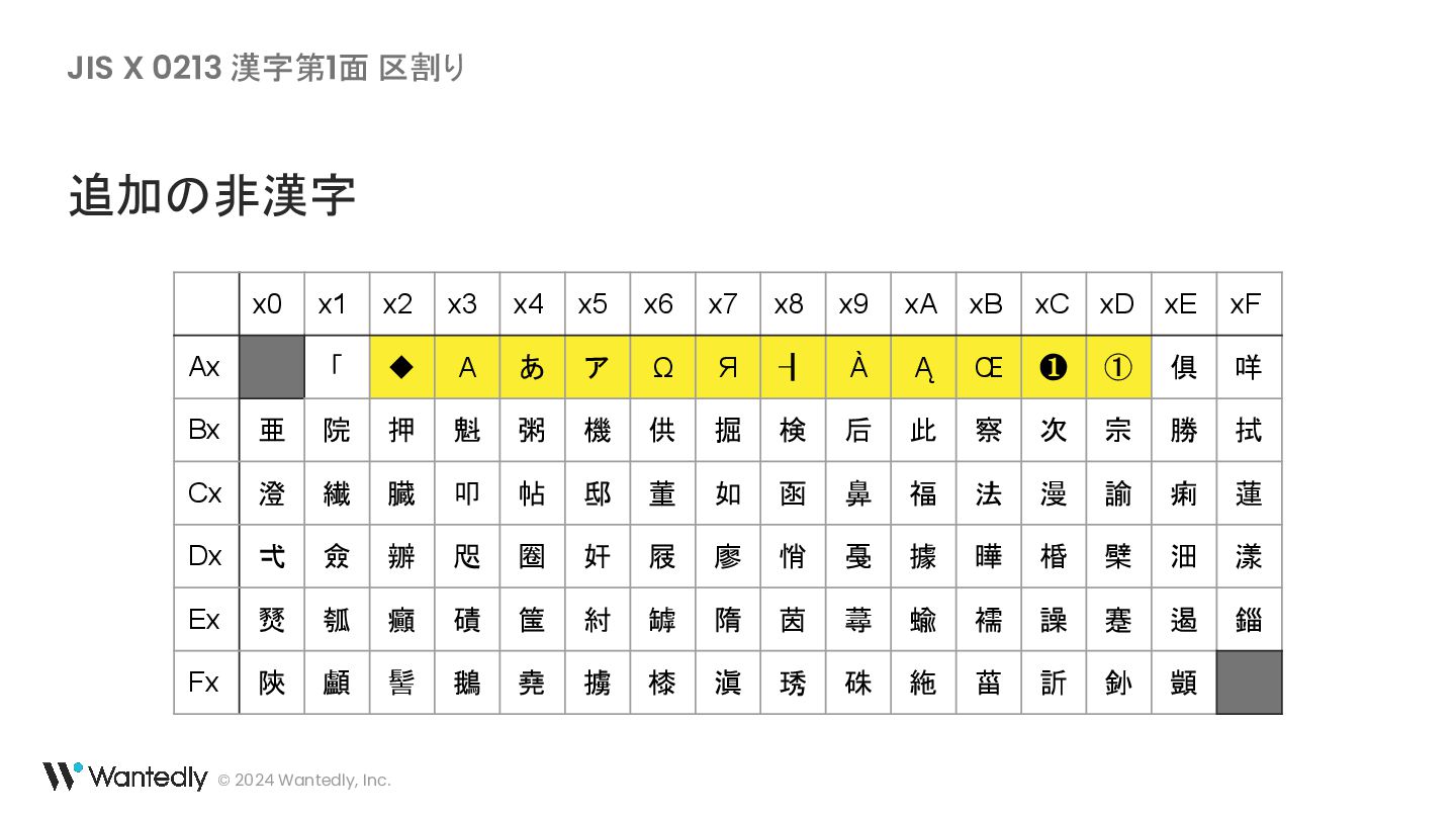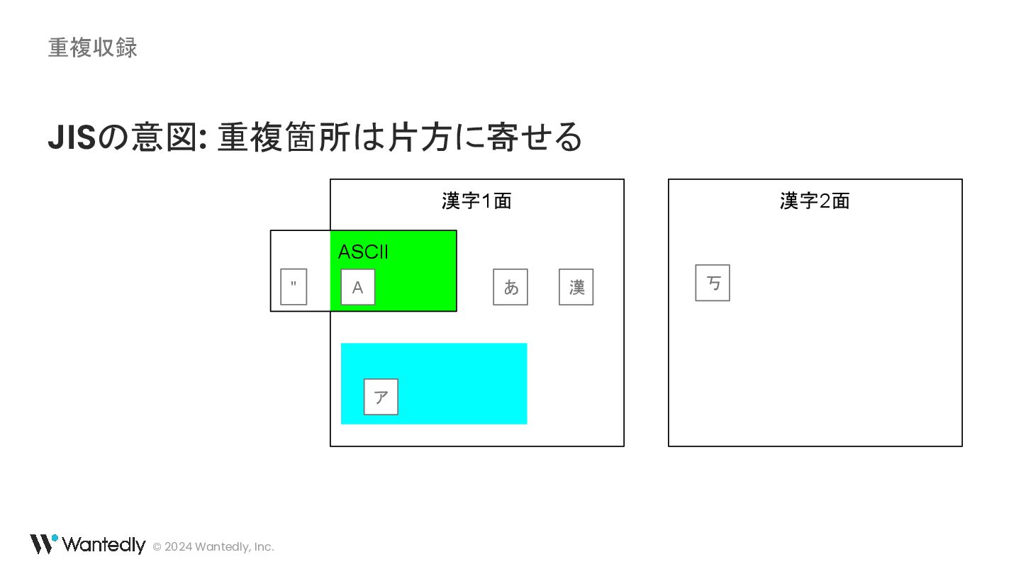 JIS X 0208に漢字2面を追加して拡張 • したがって、日本語では主に以下の4面を扱うことになる 最初の出版は2000年 123ABC ラテン文字用文字集合 (JIS X 0201) またはASCII アイウ、。 片仮名用文字集合 (JIS X 0201) あいうアイウ 安以宇衣於加 漢字コード第1面 (JIS X 0208 / JIS X 0213) 丂佔坯宁杌泬 綌䚯邡阬骯𩸕 漢字コード第2面 (JIS X 0212 / JIS X 0213)