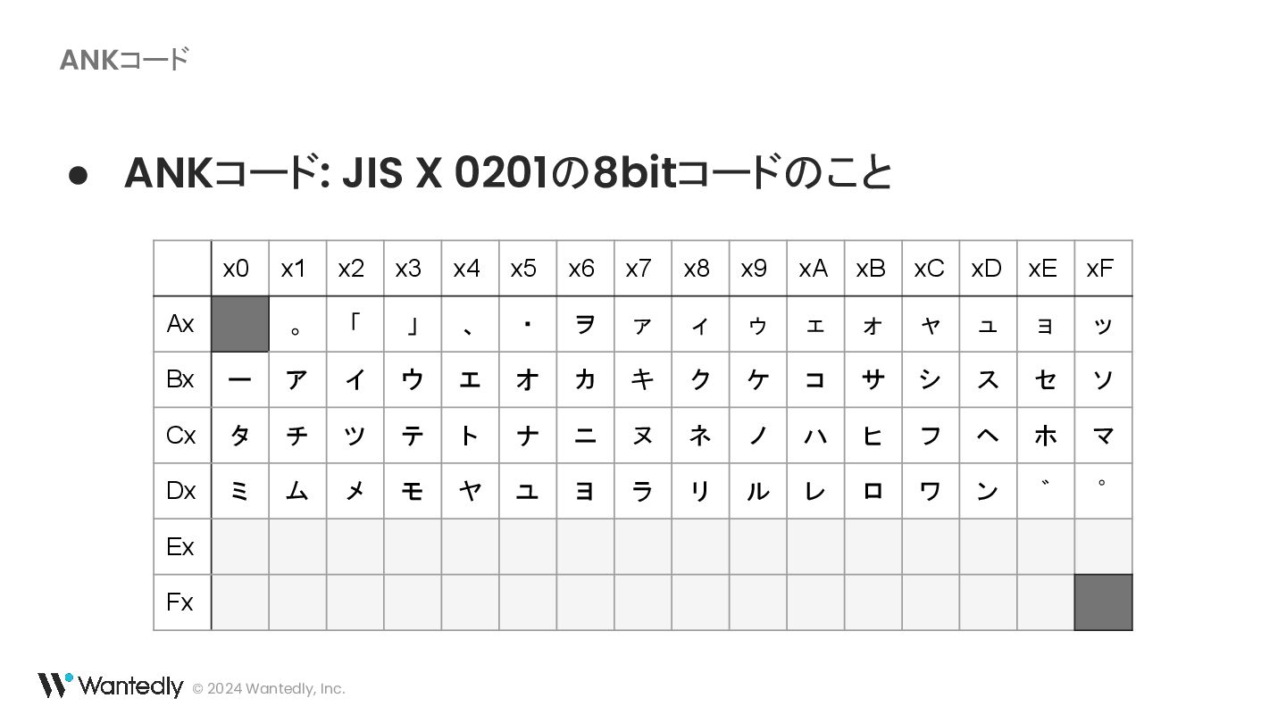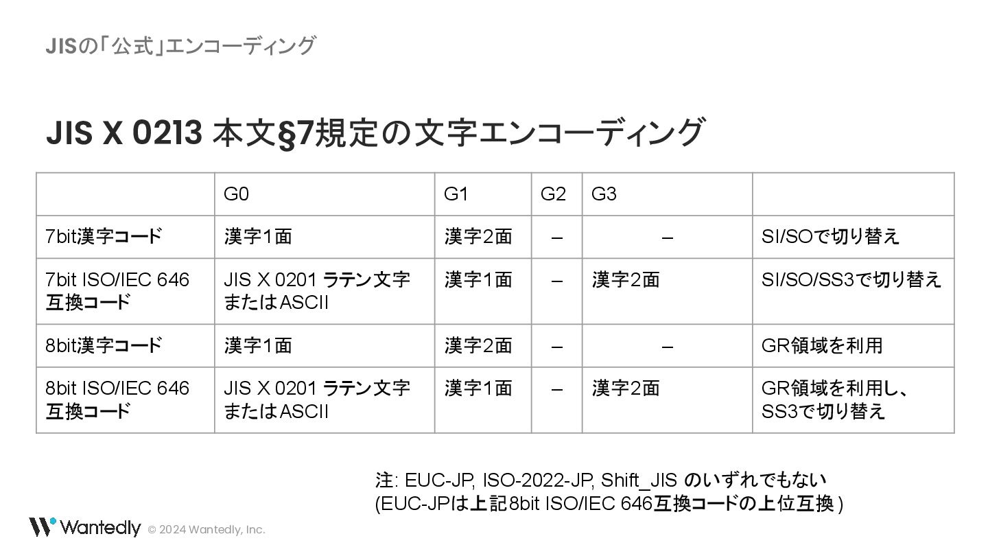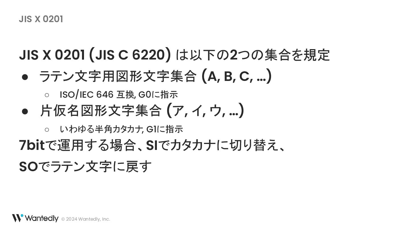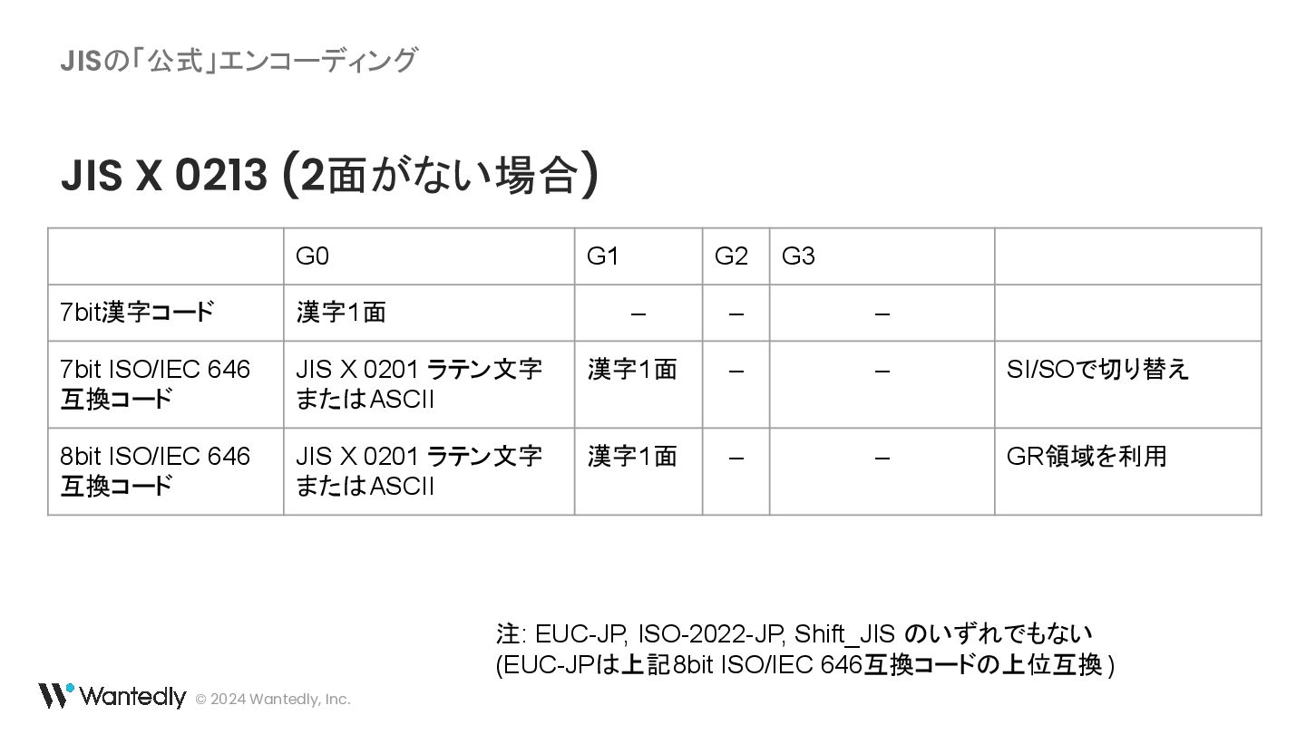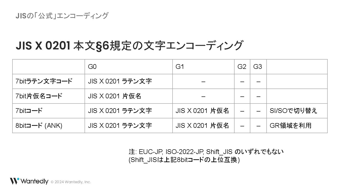 G1 G2 G3 7bitラテン文字コード JIS X 0201 ラテン文字 – – – 7bit片仮名コード JIS X 0201 片仮名 – – – 7bitコード JIS X 0201 ラテン文字 JIS X 0201 片仮名 – – SI/SOで切り替え 8bitコード (ANK) JIS X 0201 ラテン文字 JIS X 0201 片仮名 – – GR領域を利用 注: EUC-JP, ISO-2022-JP, Shift_JIS のいずれでもない (Shift_JISは上記8bitコードの上位互換)