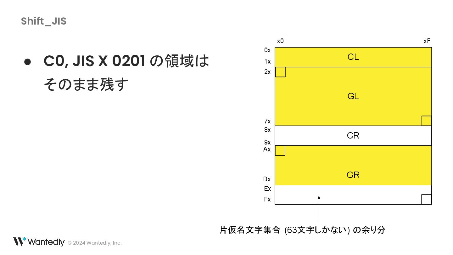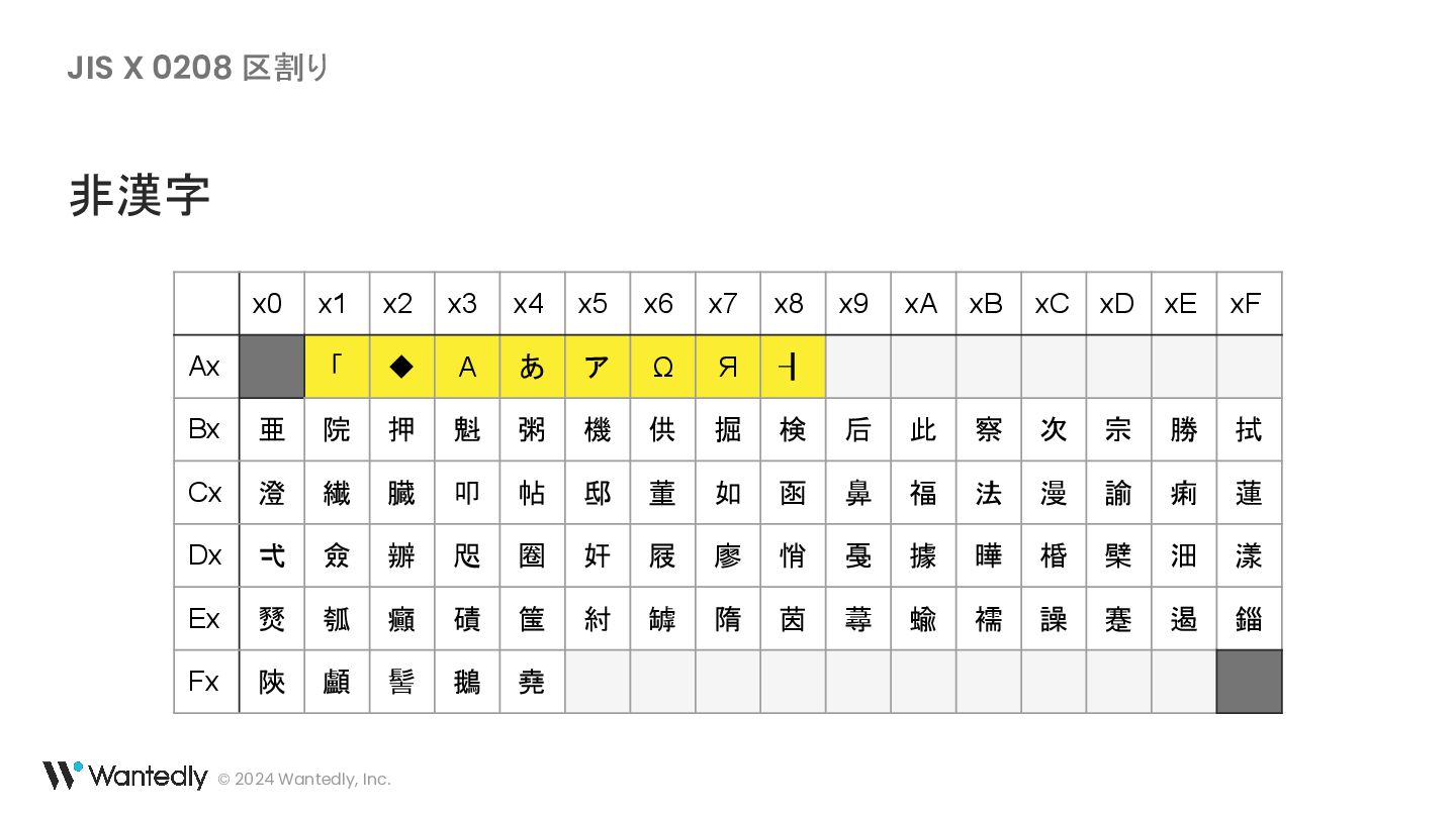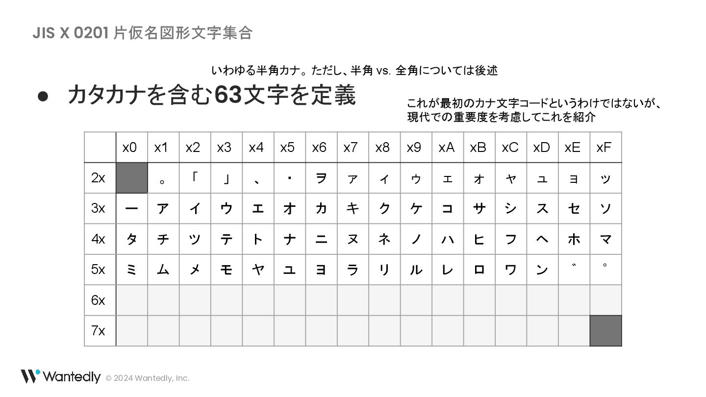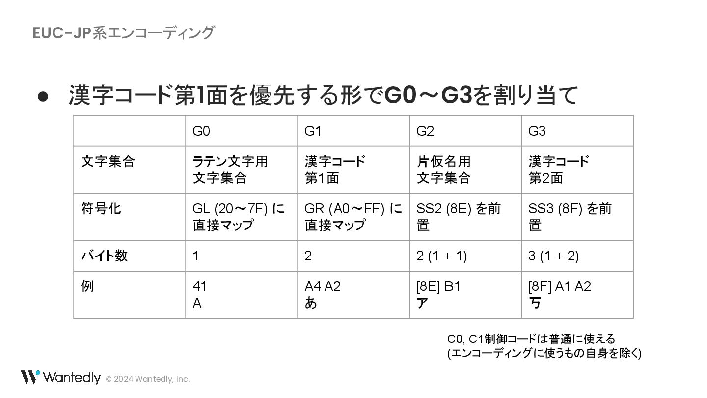 G1 G2 G3 7bitラテン文字コード JIS X 0201 ラテン文字 – – – 7bit片仮名コード JIS X 0201 片仮名 – – – 7bitコード JIS X 0201 ラテン文字 JIS X 0201 片仮名 – – SI/SOで切り替え 8bitコード (ANK) JIS X 0201 ラテン文字 JIS X 0201 片仮名 – – GR領域を利用 注: EUC-JP, ISO-2022-JP, Shift_JIS のいずれでもない (Shift_JISは上記8bitコードの上位互換)