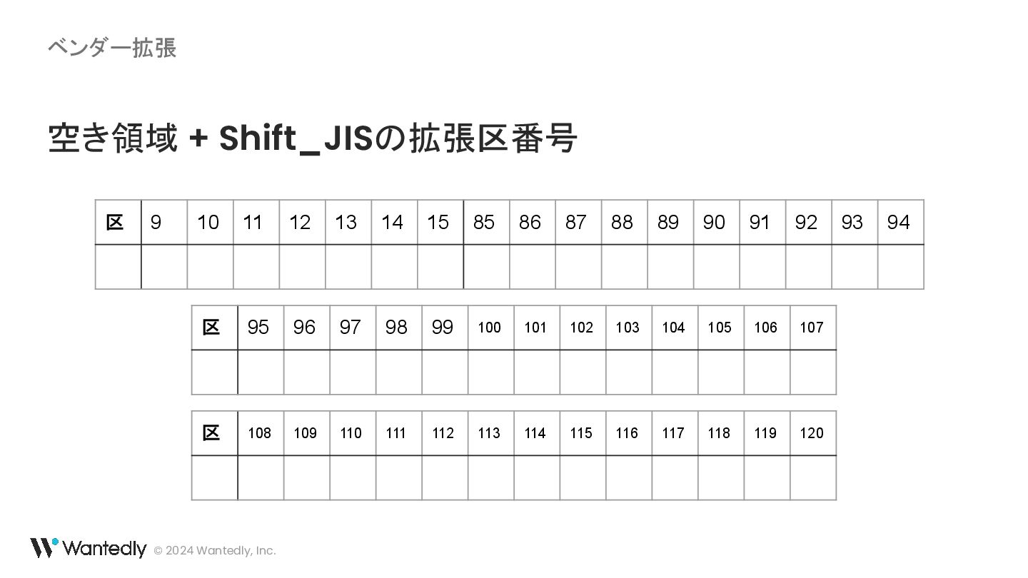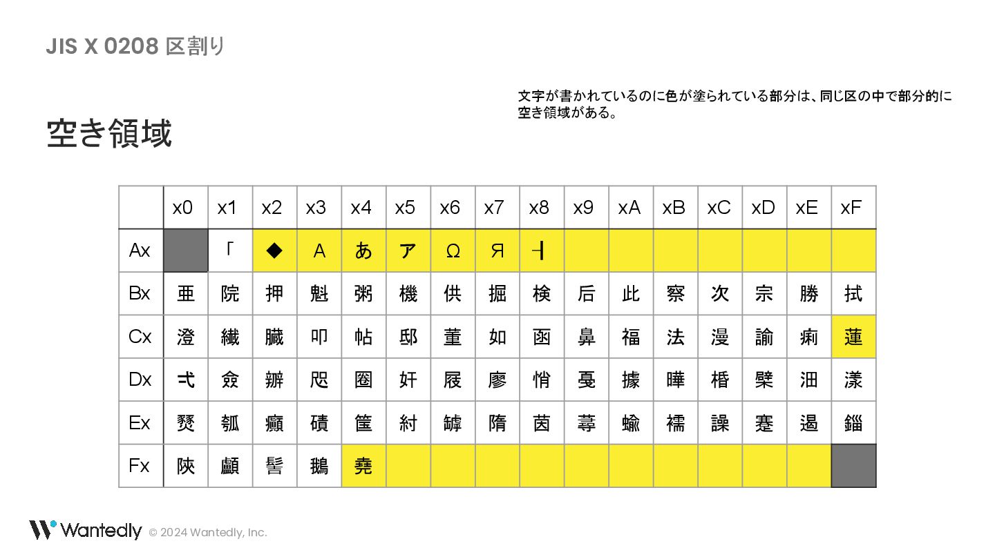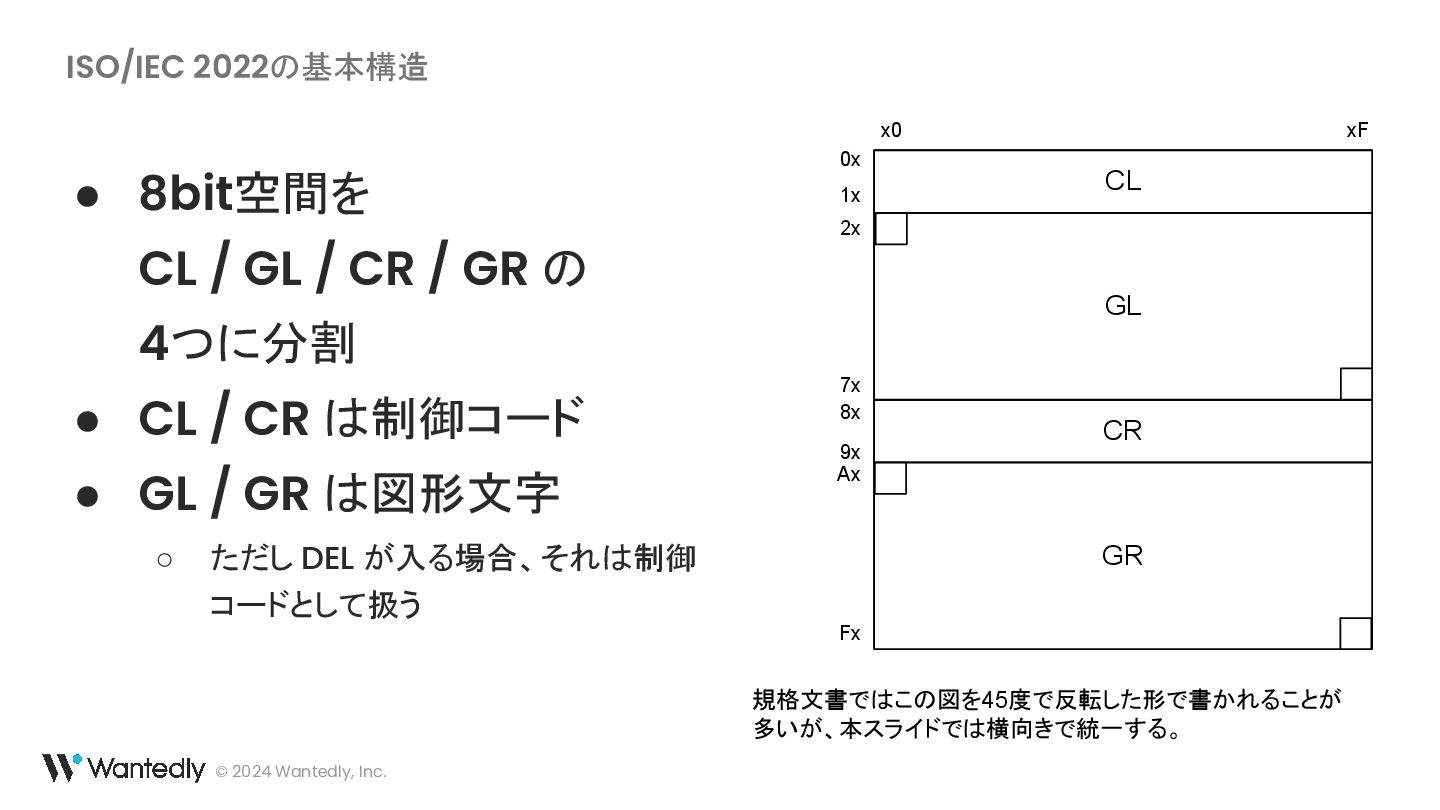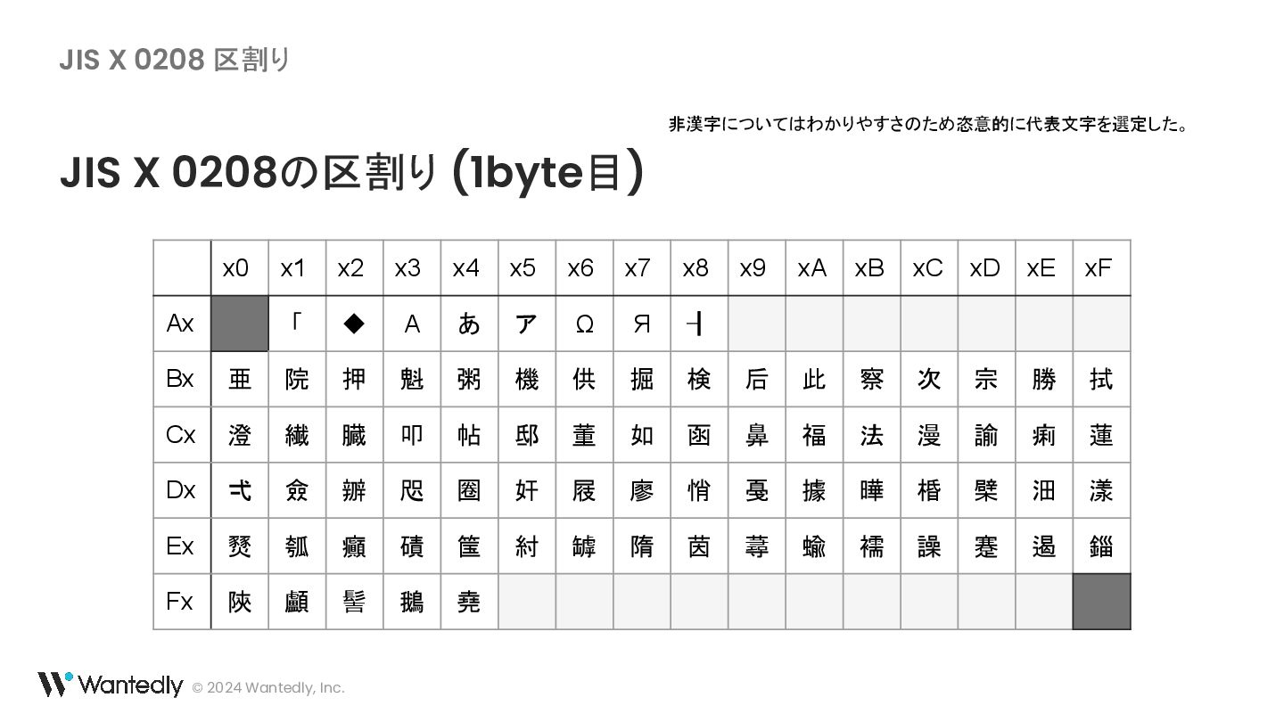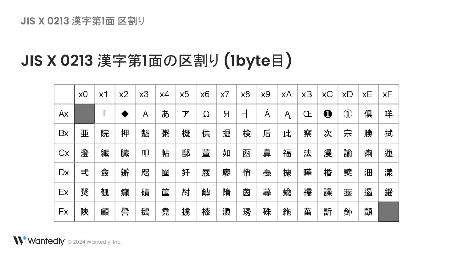 G1 G2 G3 7bitラテン文字コード JIS X 0201 ラテン文字 – – – 7bit片仮名コード JIS X 0201 片仮名 – – – 7bitコード JIS X 0201 ラテン文字 JIS X 0201 片仮名 – – SI/SOで切り替え 8bitコード (ANK) JIS X 0201 ラテン文字 JIS X 0201 片仮名 – – GR領域を利用 注: EUC-JP, ISO-2022-JP, Shift_JIS のいずれでもない (Shift_JISは上記8bitコードの上位互換)