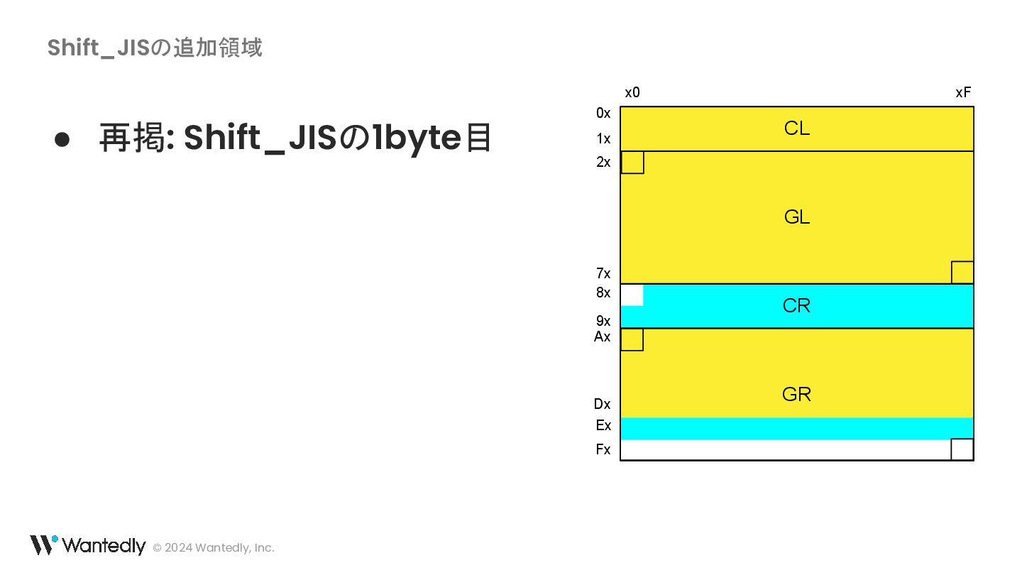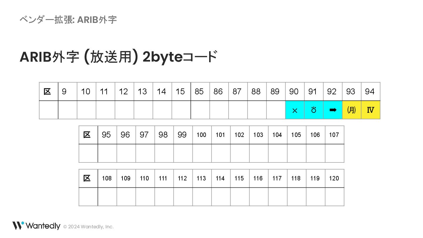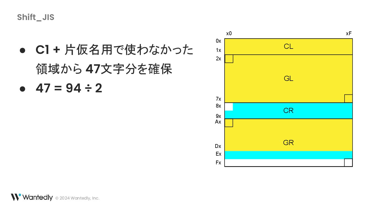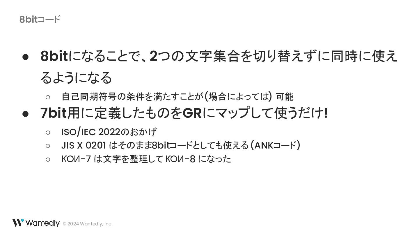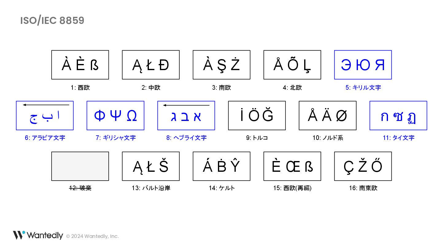 G1 G2 G3 7bitラテン文字コード JIS X 0201 ラテン文字 – – – 7bit片仮名コード JIS X 0201 片仮名 – – – 7bitコード JIS X 0201 ラテン文字 JIS X 0201 片仮名 – – SI/SOで切り替え 8bitコード (ANK) JIS X 0201 ラテン文字 JIS X 0201 片仮名 – – GR領域を利用 注: EUC-JP, ISO-2022-JP, Shift_JIS のいずれでもない (Shift_JISは上記8bitコードの上位互換)