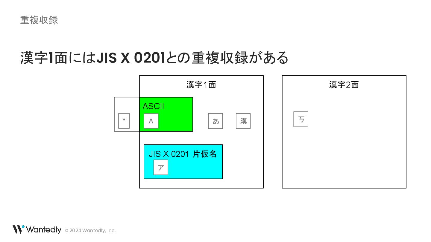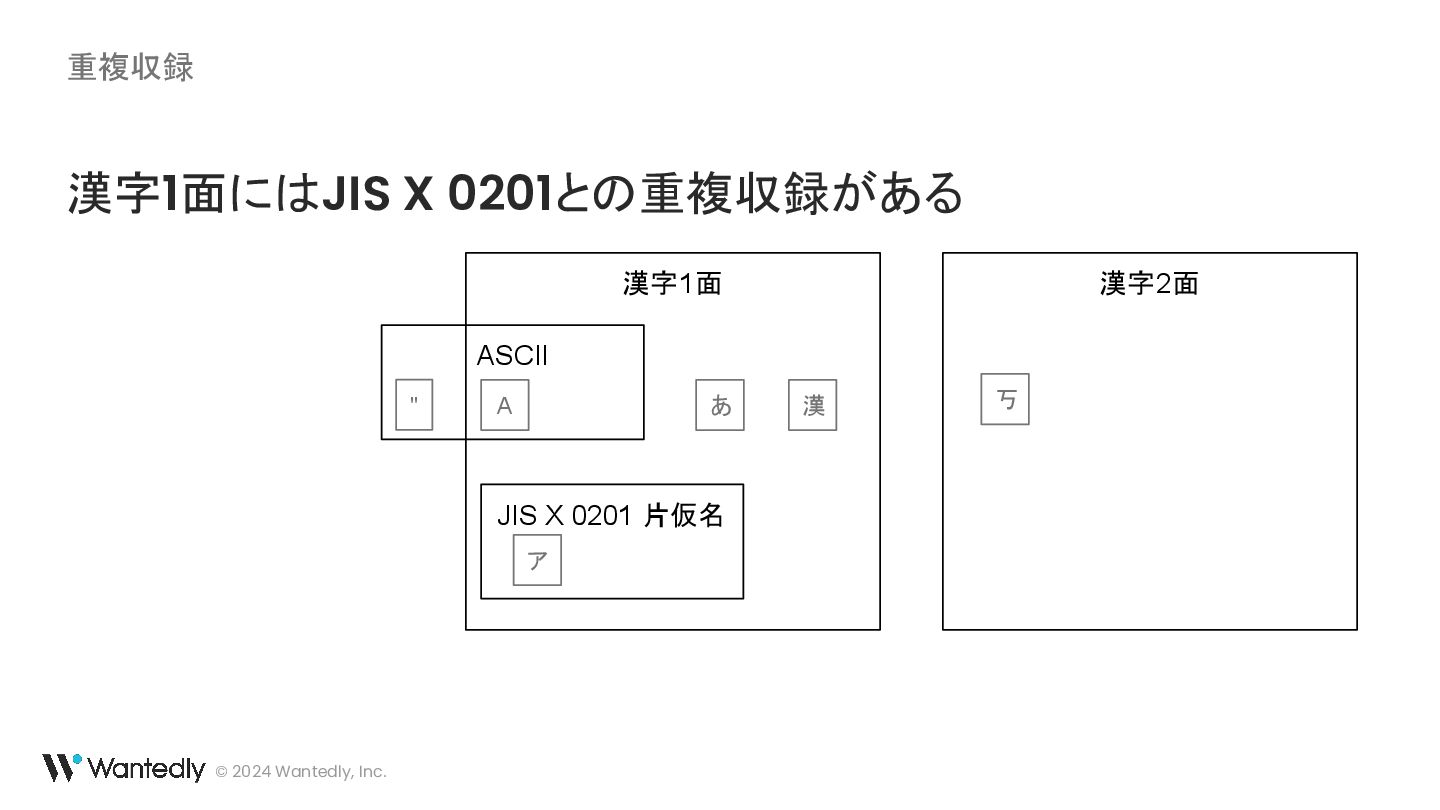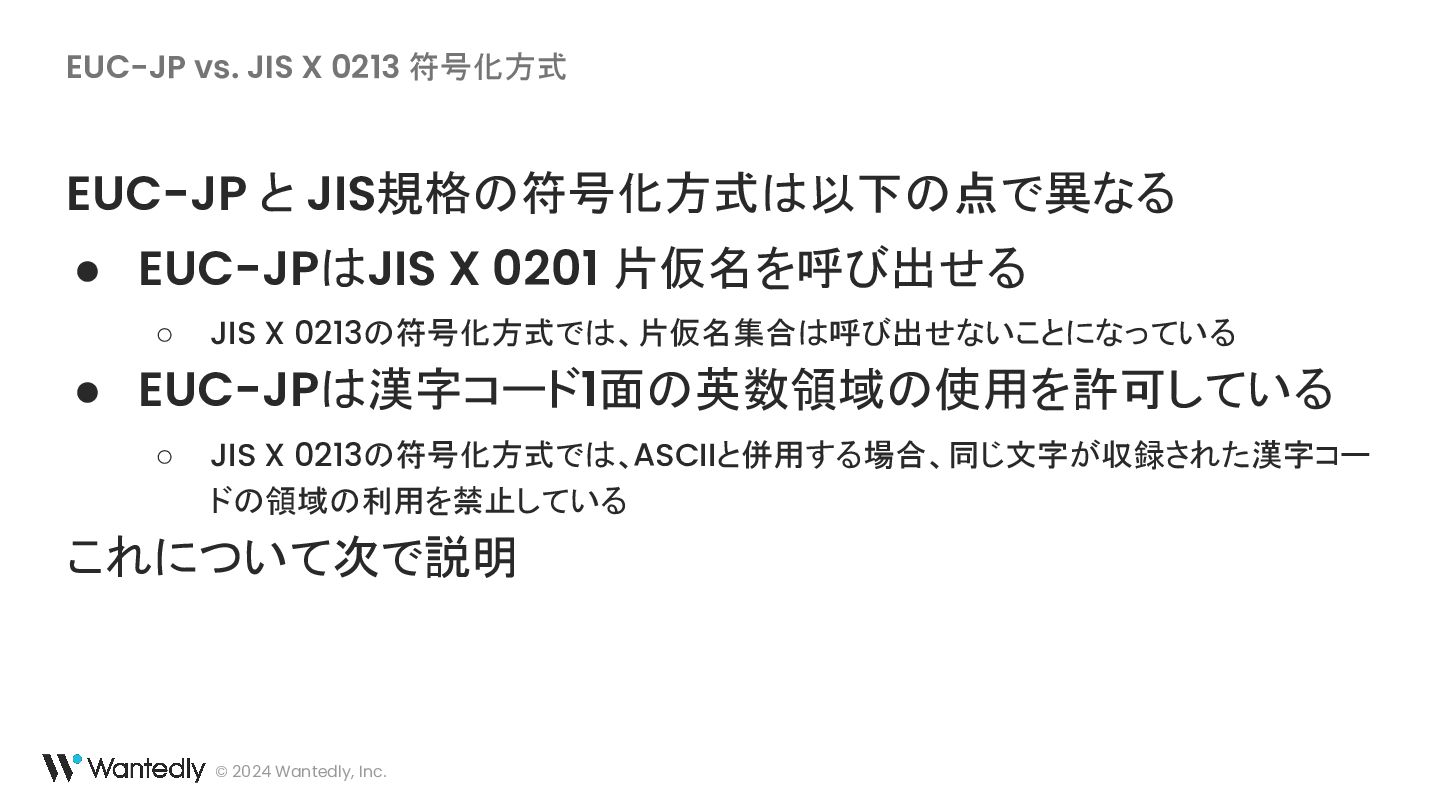EUC-JP と JIS規格の符号化方式は以下の点で異なる • EUC-JPはJIS X 0201 片仮名を呼び出せる ◦ JIS X 0213の符号化方式では、片仮名集合は呼び出せないことになっている • EUC-JPは漢字コード1面の英数領域の使用を許可している ◦ JIS X 0213の符号化方式では、ASCIIと併用する場合、同じ文字が収録された漢字コー ドの領域の利用を禁止している これについて次で説明
