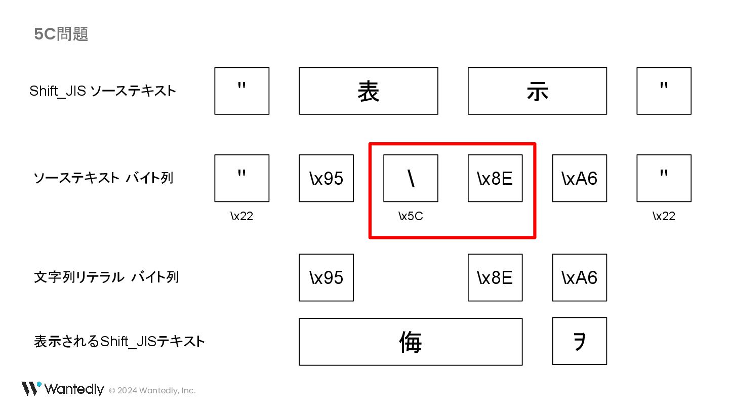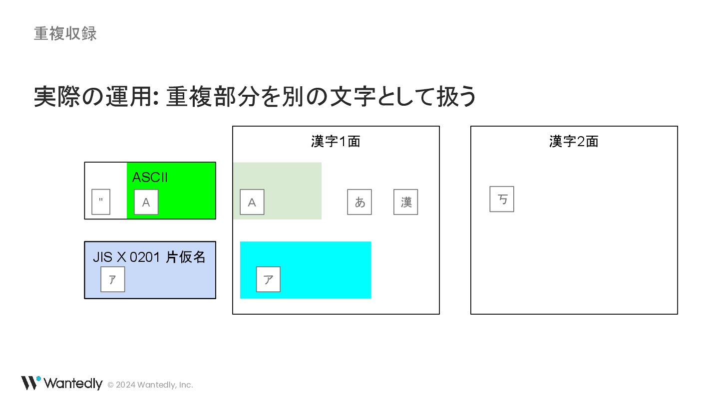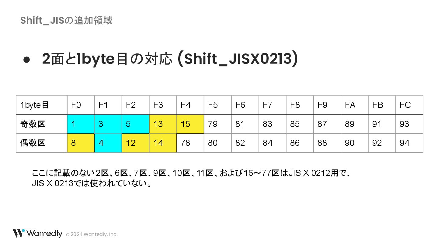 EUC-JP と JIS規格の符号化方式は以下の点で異なる • EUC-JPはJIS X 0201 片仮名を呼び出せる ◦ JIS X 0213の符号化方式では、片仮名集合は呼び出せないことになっている • EUC-JPは漢字コード1面の英数領域の使用を許可している ◦ JIS X 0213の符号化方式では、ASCIIと併用する場合、同じ文字が収録された漢字コー ドの領域の利用を禁止している これについて次で説明