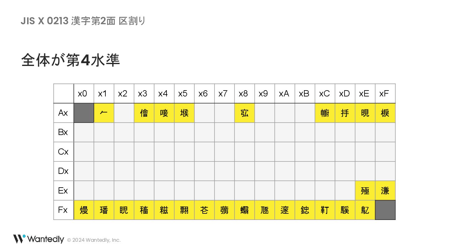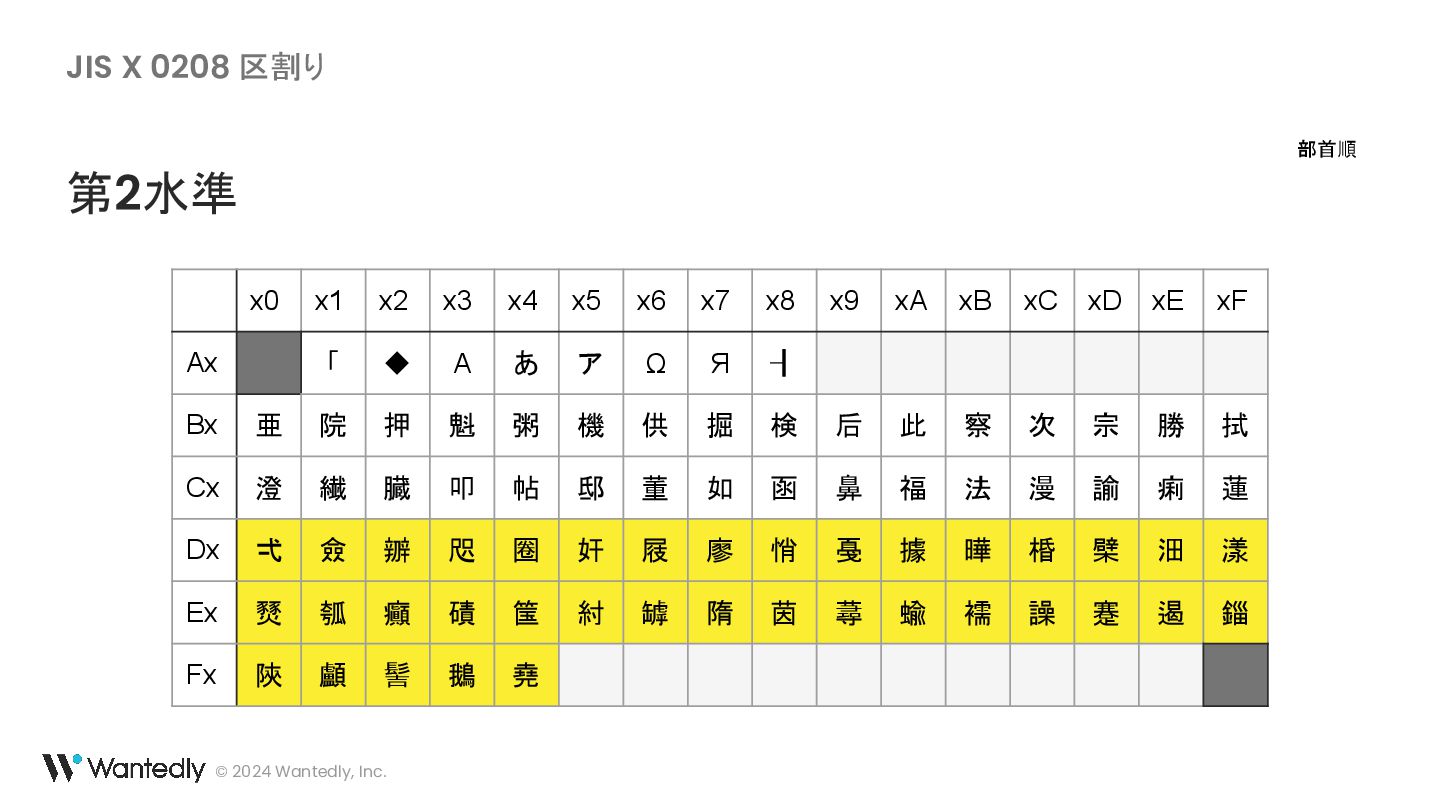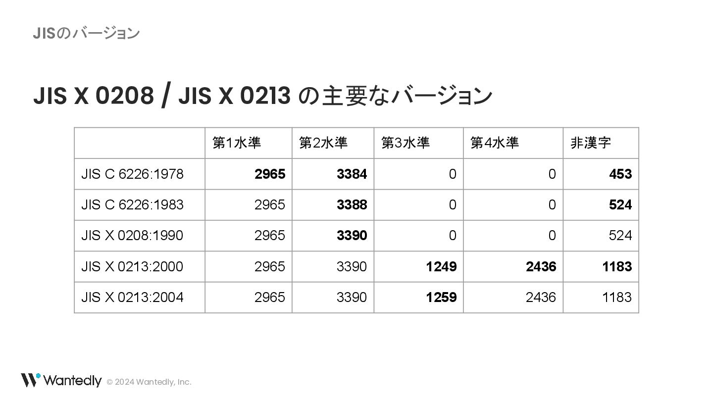 X 0213 の主要なバージョン 第1水準 第2水準 第3水準 第4水準 非漢字 JIS C 6226:1978 2965 3384 0 0 453 JIS C 6226:1983 2965 3388 0 0 524 JIS X 0208:1990 2965 3390 0 0 524 JIS X 0213:2000 2965 3390 1249 2436 1183 JIS X 0213:2004 2965 3390 1259 2436 1183