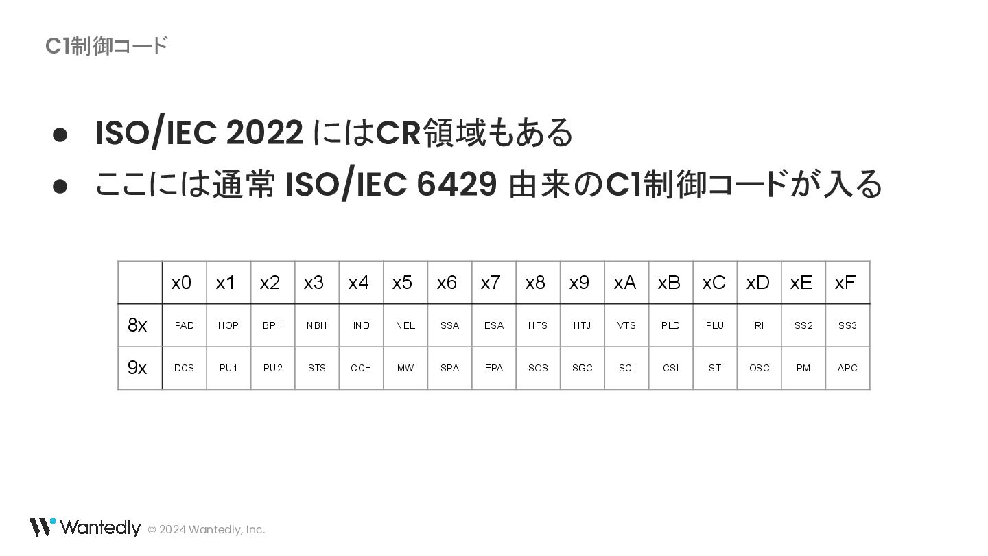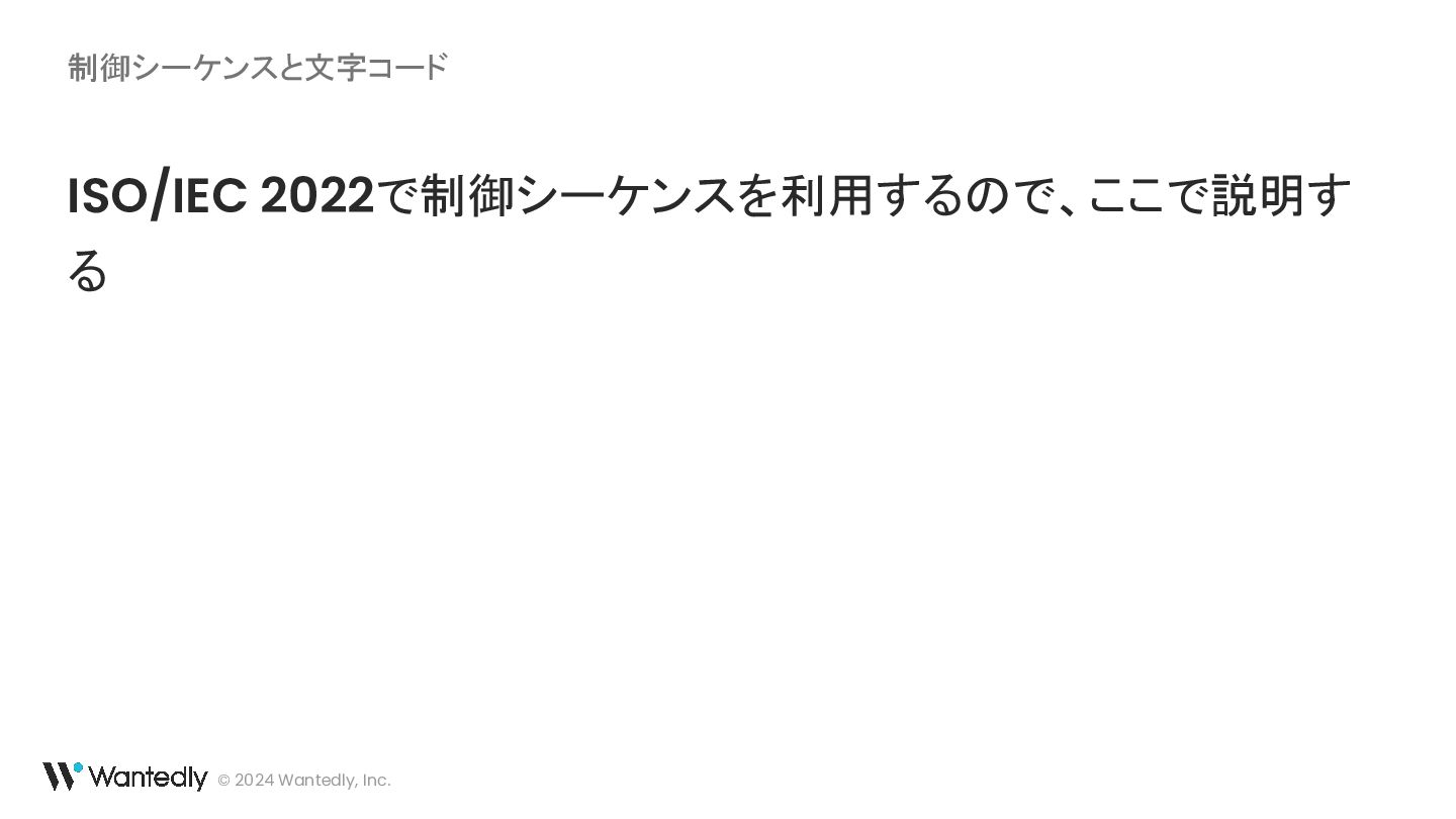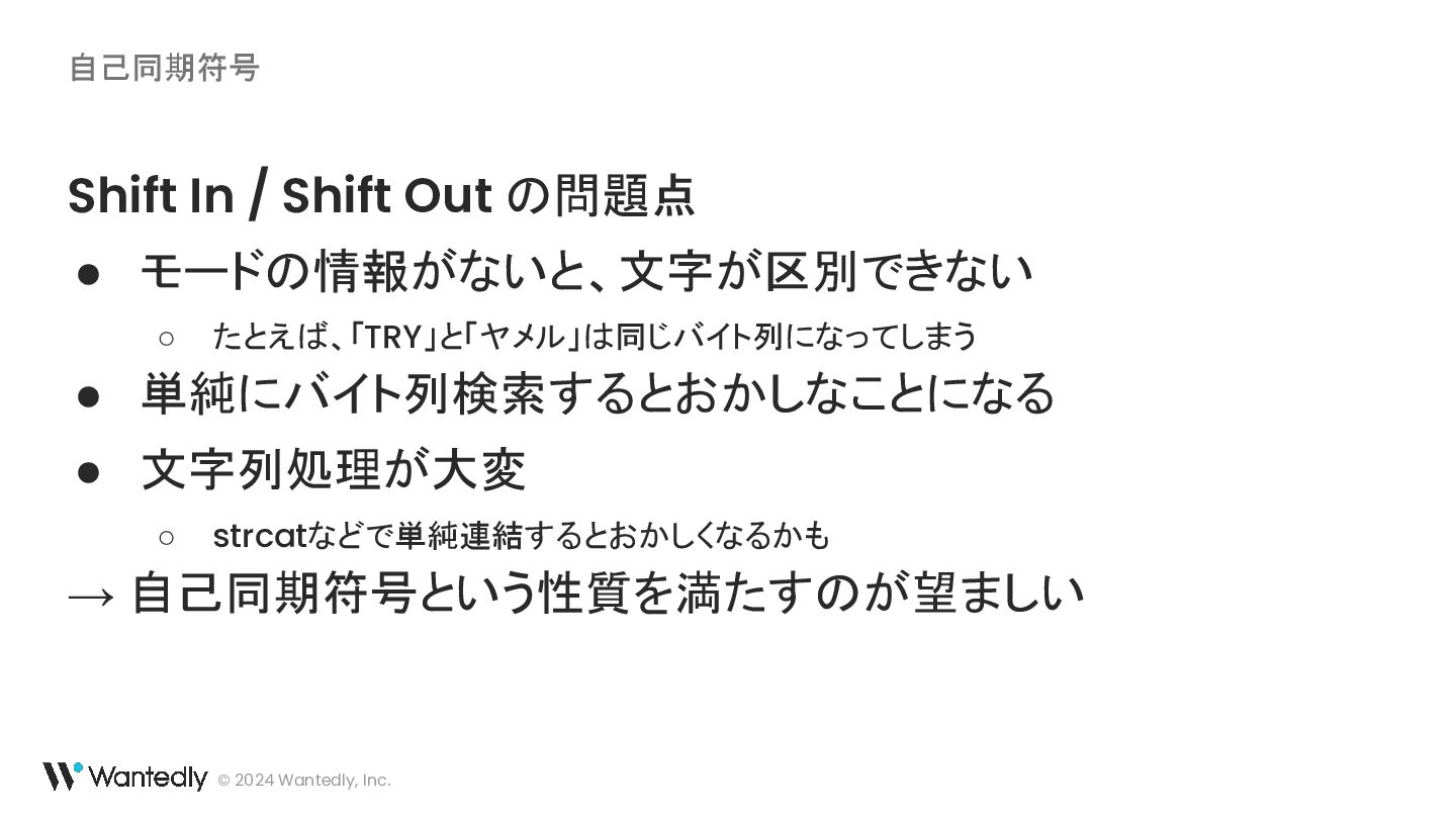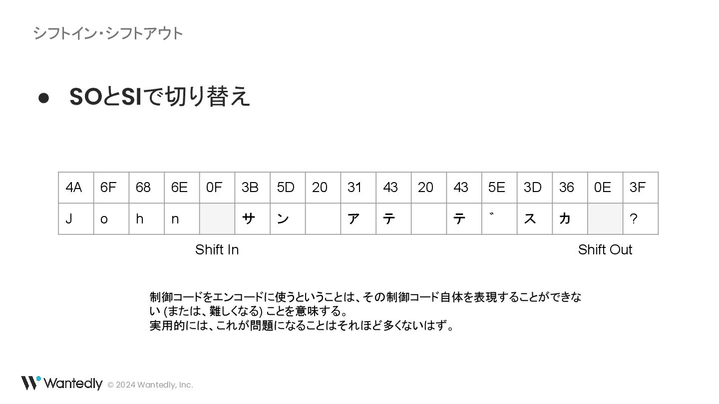 6E 0F 3B 5D 20 31 43 20 43 5E 3D 36 0E 3F J o h n サ ン ア テ テ ゛ ス カ ? Shift In Shift Out 制御コードをエンコードに使うということは、その制御コード自体を表現することができな い (または、難しくなる) ことを意味する。 実用的には、これが問題になることはそれほど多くないはず。