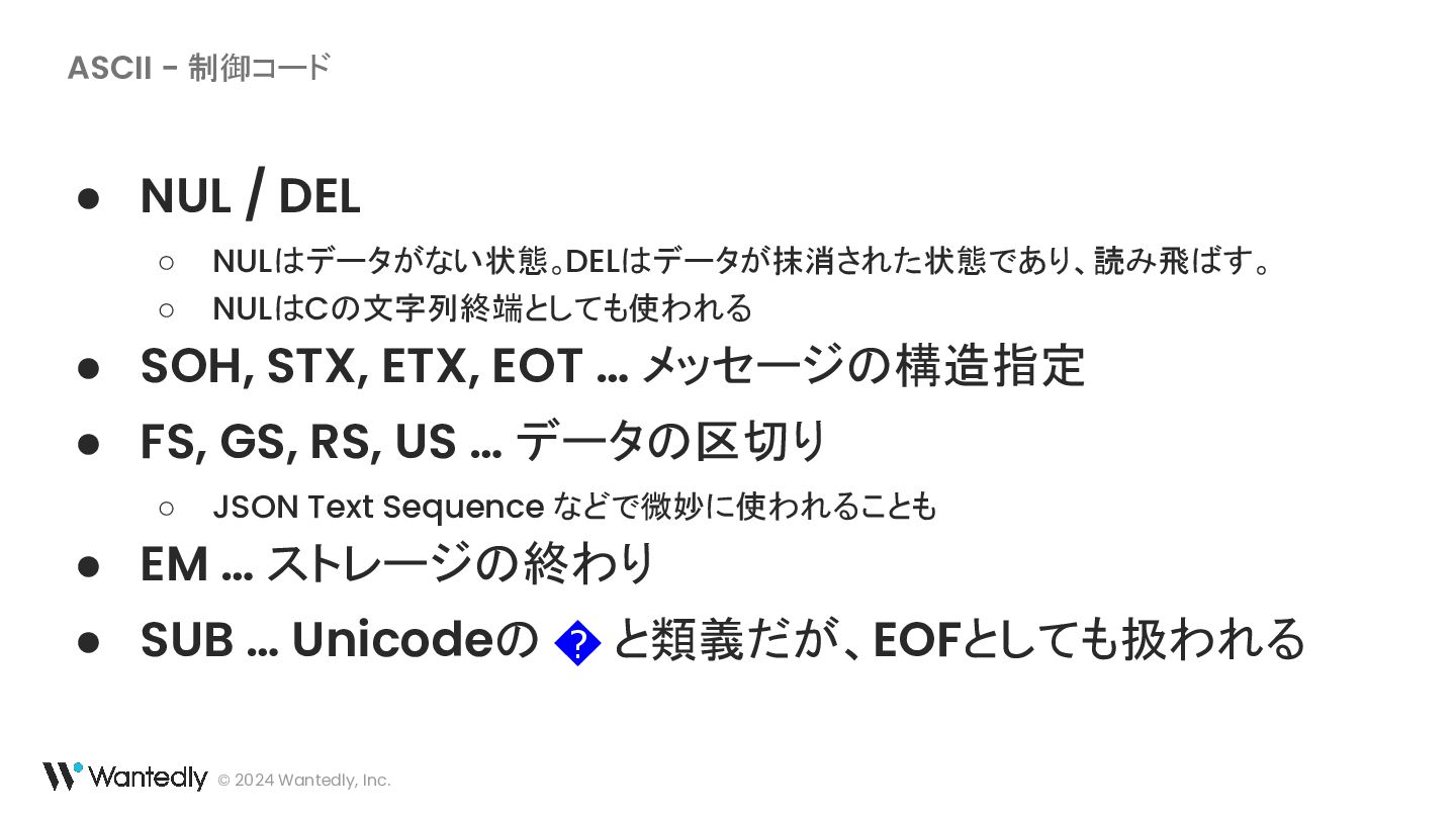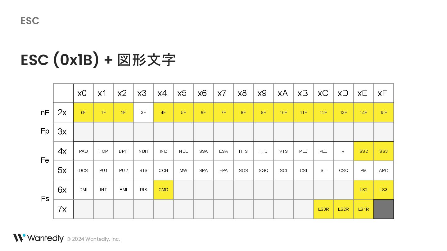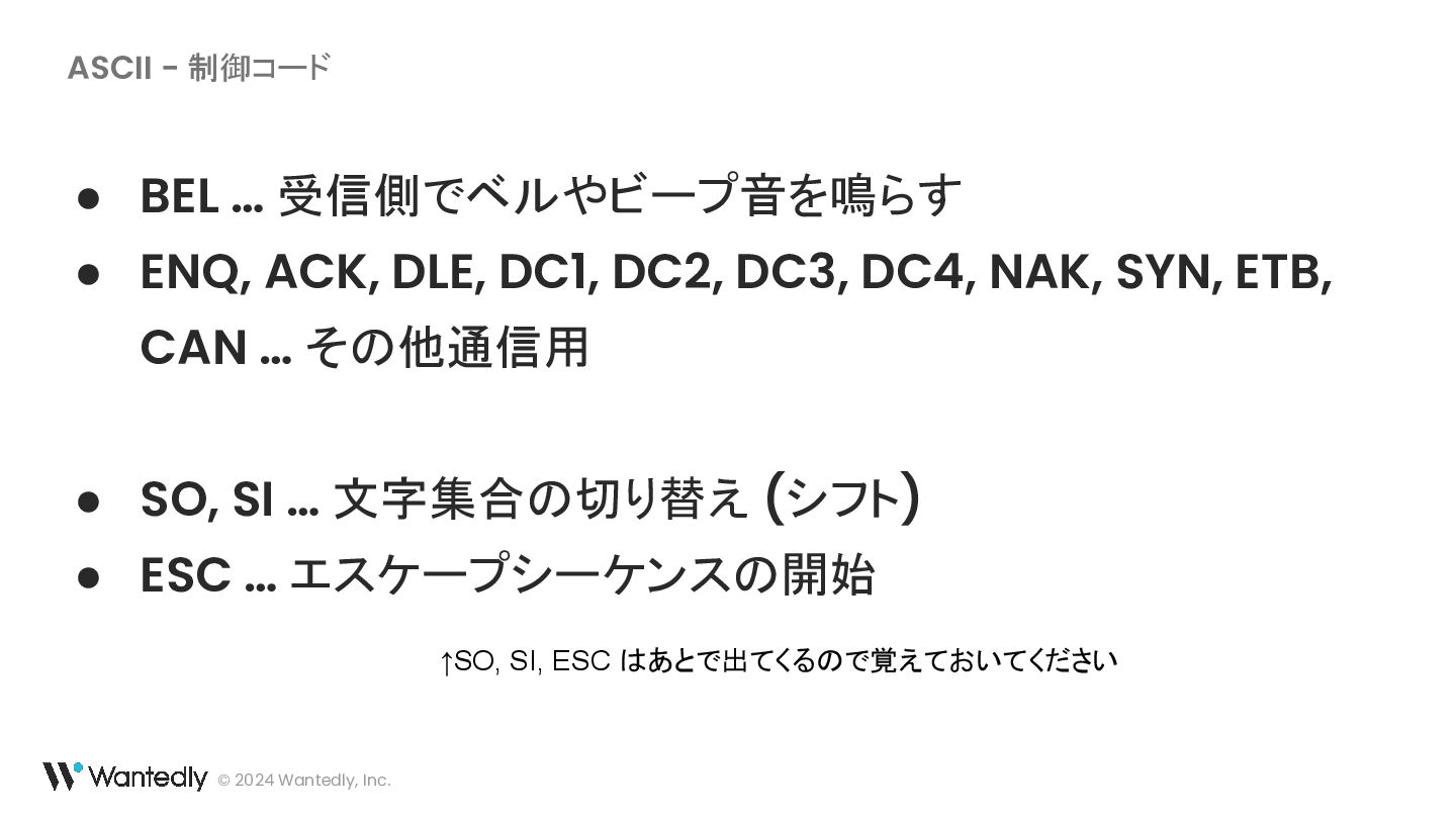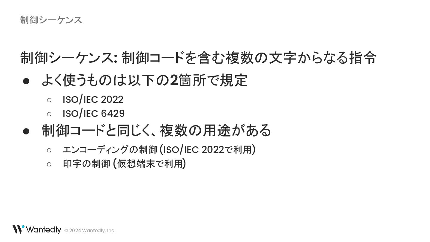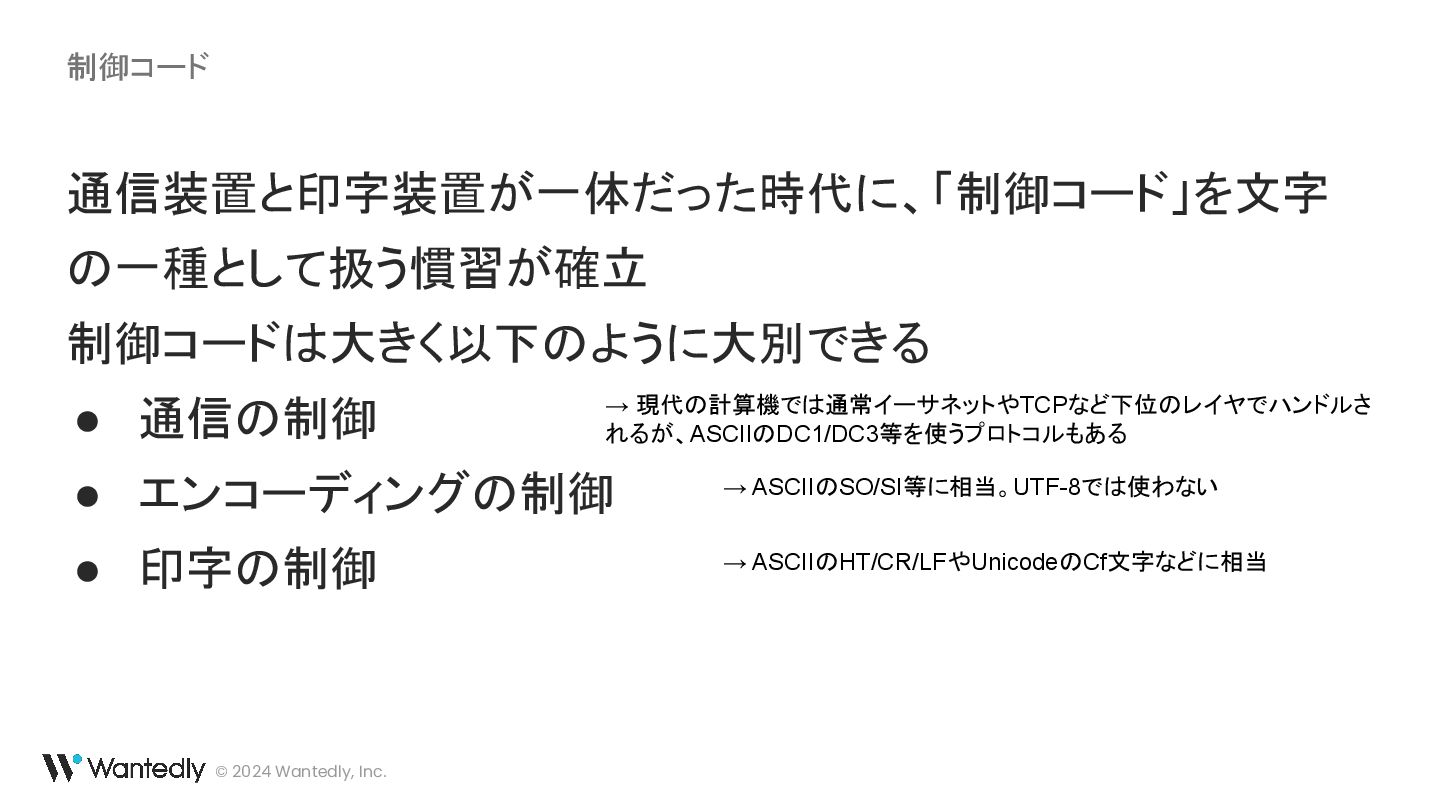6E 0F 3B 5D 20 31 43 20 43 5E 3D 36 0E 3F J o h n サ ン ア テ テ ゛ ス カ ? Shift In Shift Out 制御コードをエンコードに使うということは、その制御コード自体を表現することができな い (または、難しくなる) ことを意味する。 実用的には、これが問題になることはそれほど多くないはず。