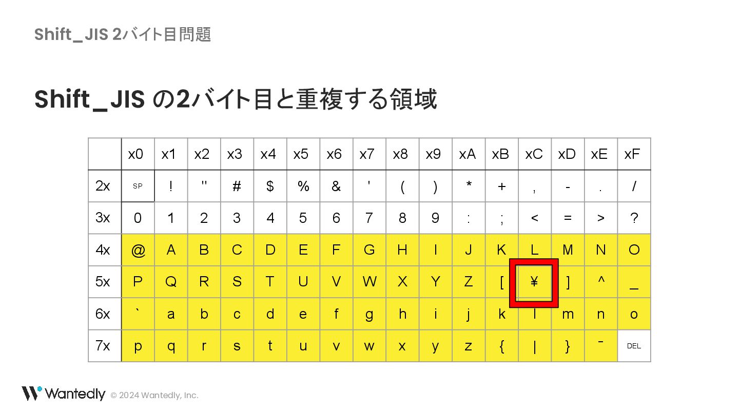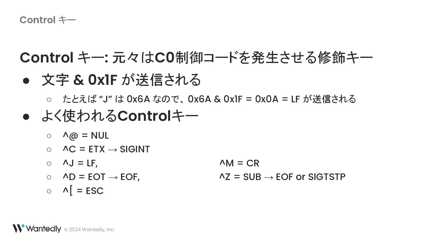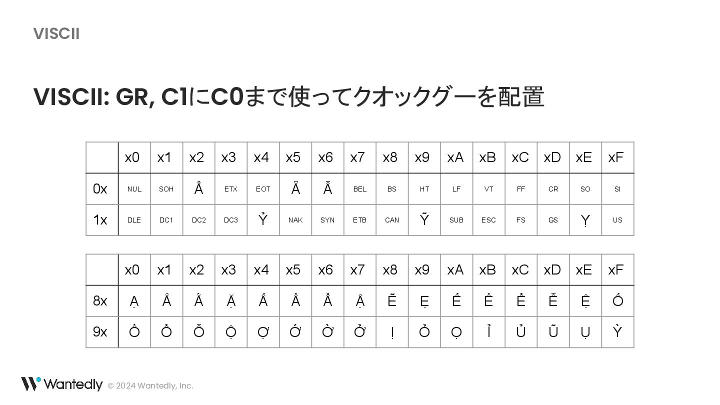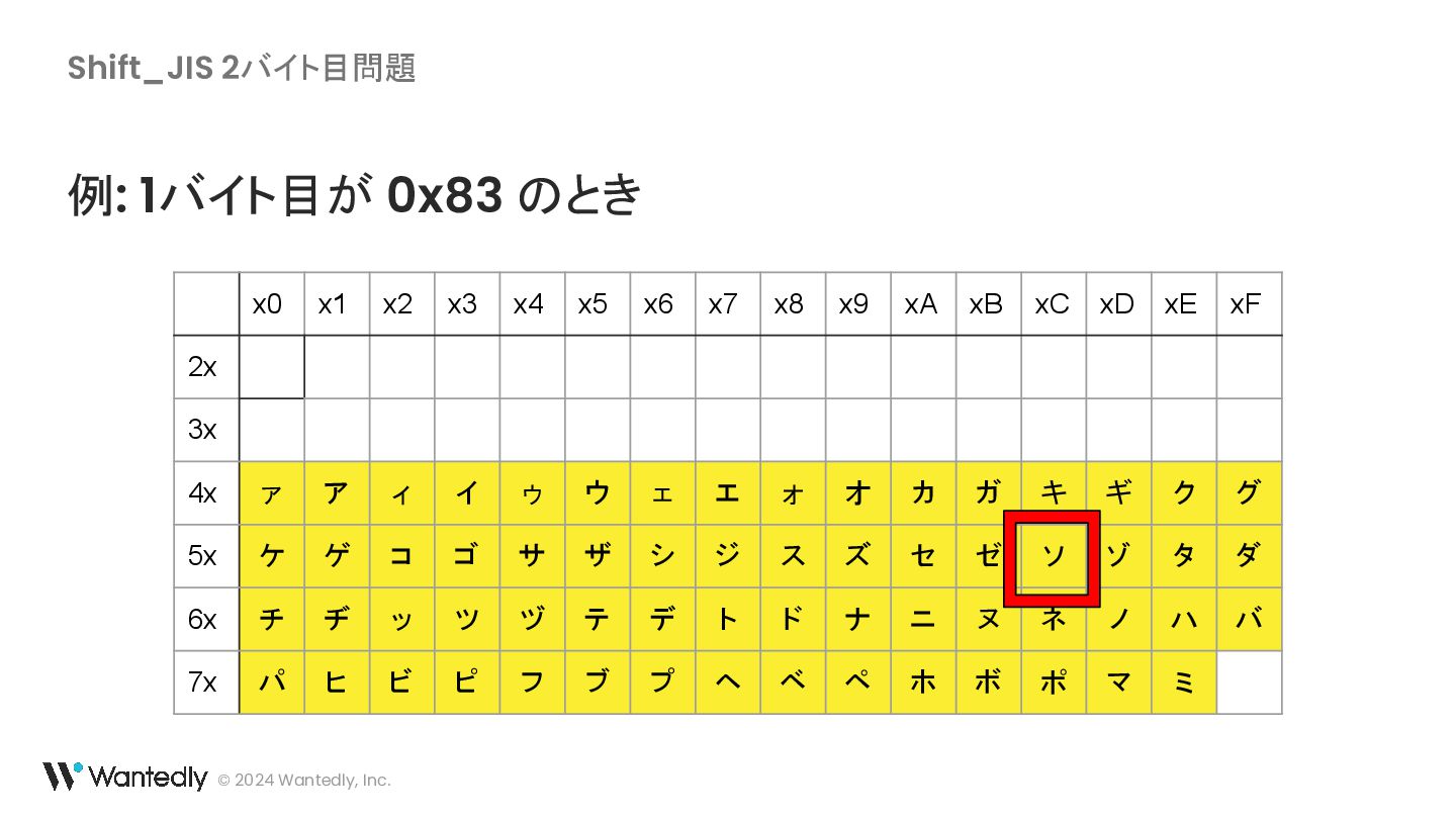 6E 0F 3B 5D 20 31 43 20 43 5E 3D 36 0E 3F J o h n サ ン ア テ テ ゛ ス カ ? Shift In Shift Out 制御コードをエンコードに使うということは、その制御コード自体を表現することができな い (または、難しくなる) ことを意味する。 実用的には、これが問題になることはそれほど多くないはず。