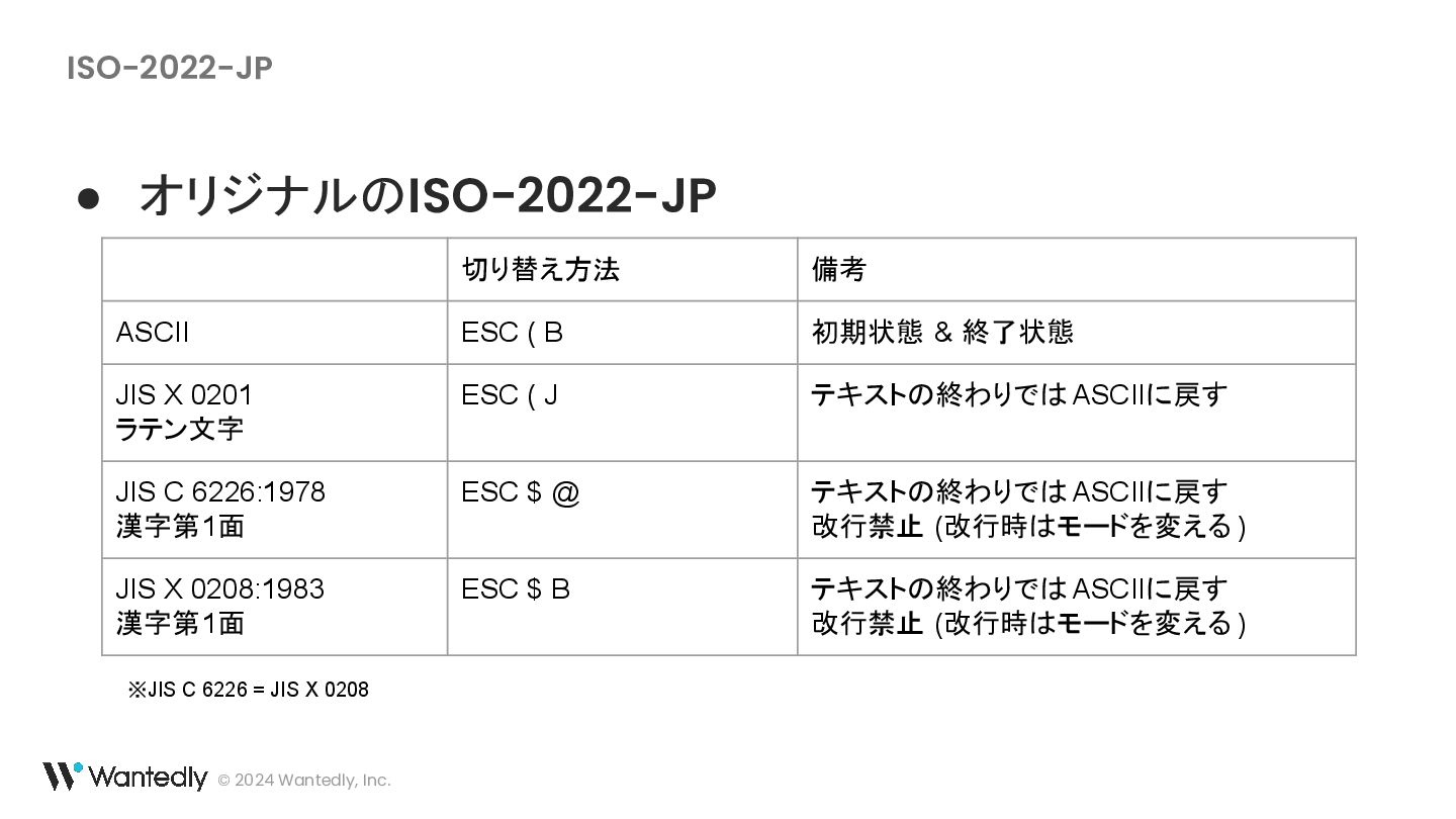 ESC ( B 初期状態 & 終了状態 JIS X 0201 ラテン文字 ESC ( J テキストの終わりでは ASCIIに戻す JIS C 6226:1978 漢字第1面 ESC $ @ テキストの終わりでは ASCIIに戻す 改行禁止 (改行時はモードを変える ) JIS X 0208:1983 漢字第1面 ESC $ B テキストの終わりでは ASCIIに戻す 改行禁止 (改行時はモードを変える ) ※JIS C 6226 = JIS X 0208