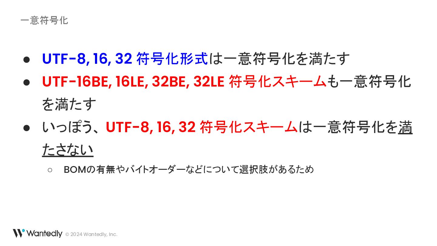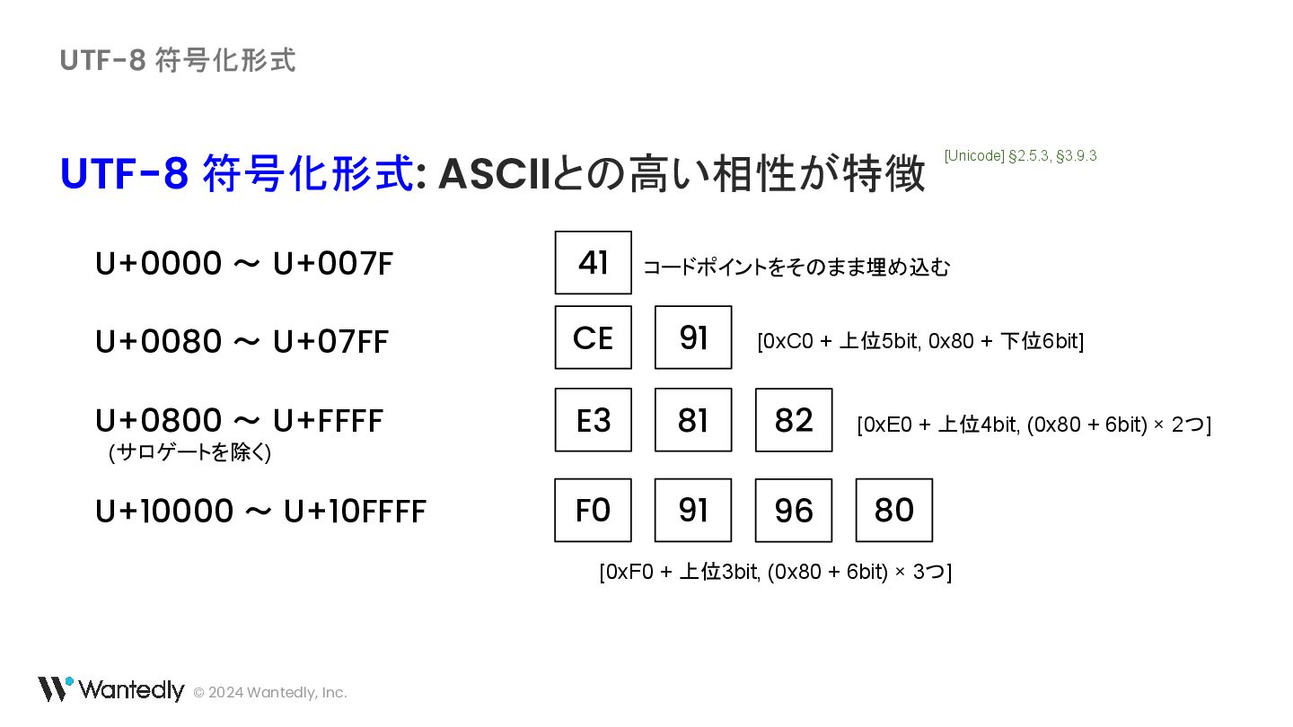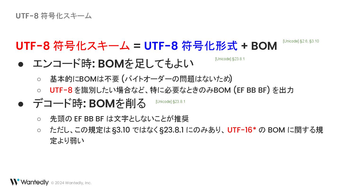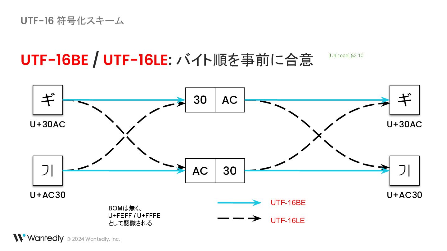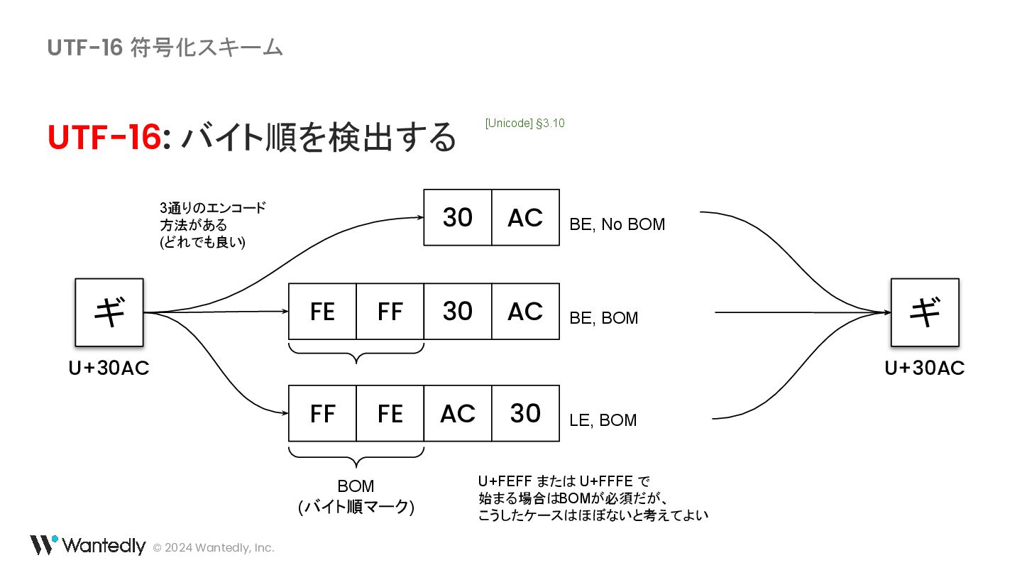 AC FE FF 30 AC FF FE AC 30 U+30AC BE, No BOM BE, BOM LE, BOM U+FEFF または U+FFFE で 始まる場合はBOMが必須だが、 こうしたケースはほぼないと考えてよい ギ U+30AC 3通りのエンコード 方法がある (どれでも良い) BOM (バイト順マーク) [Unicode] §3.10