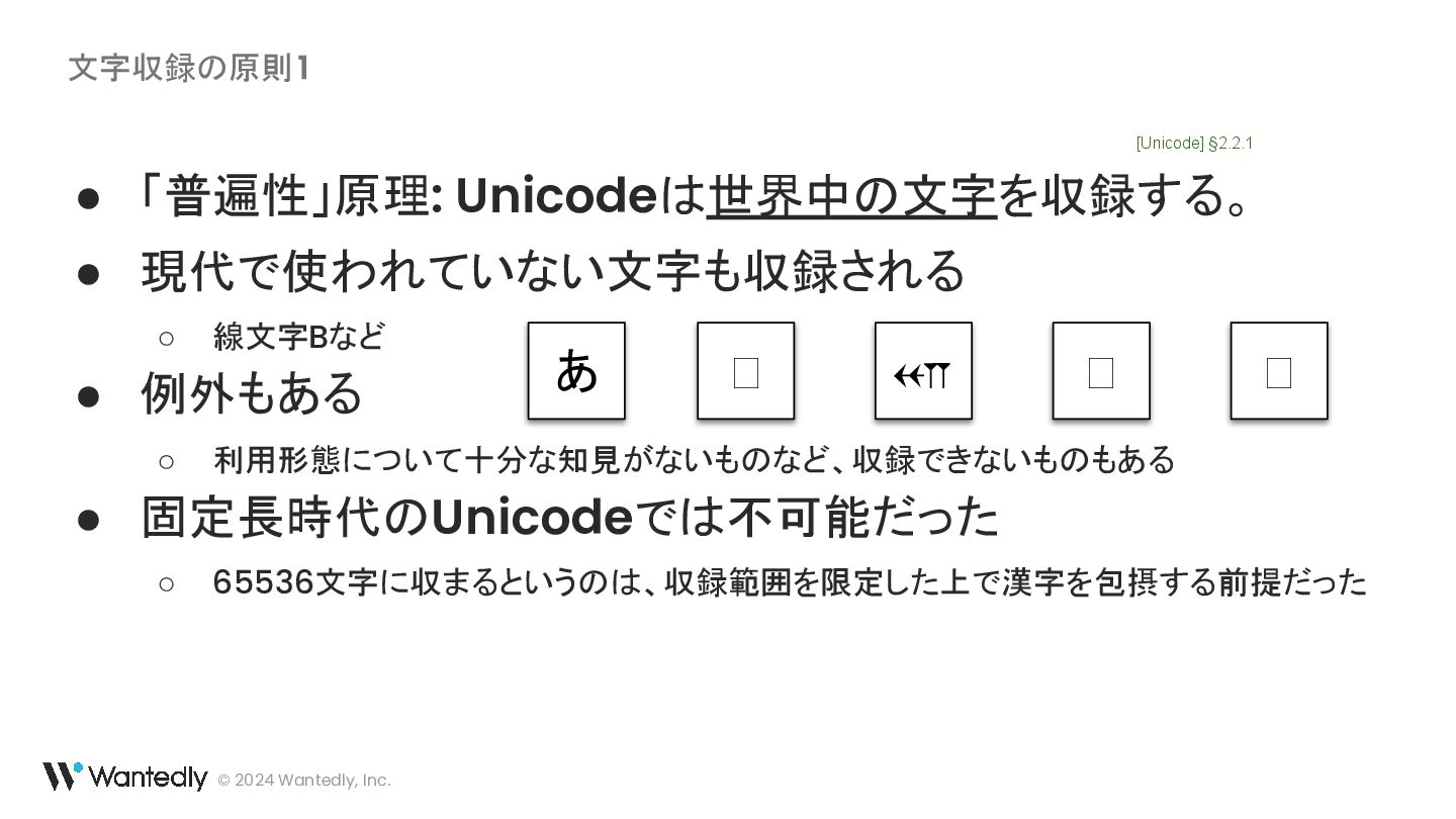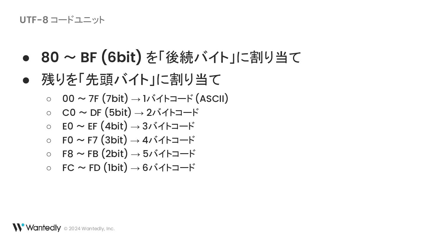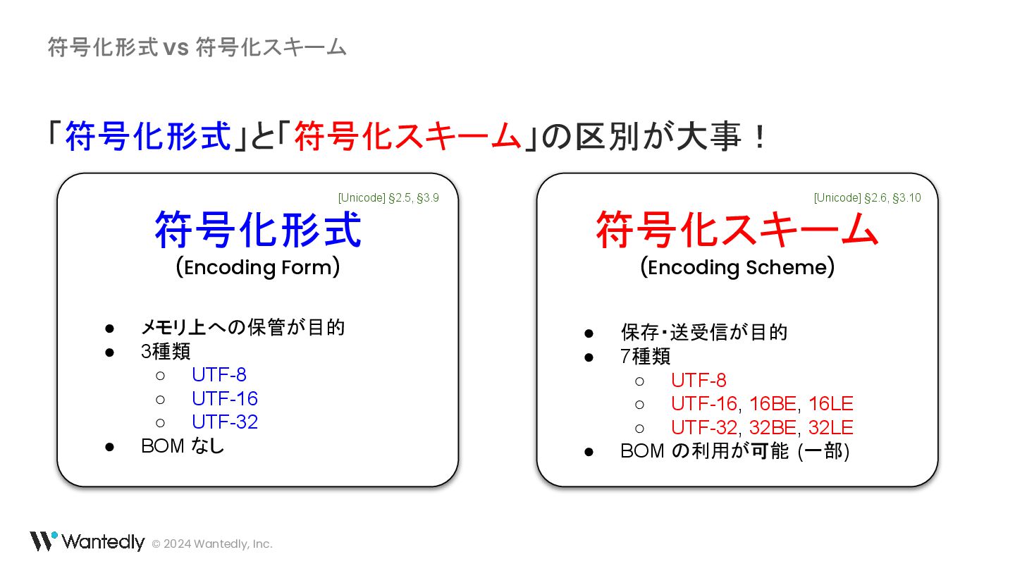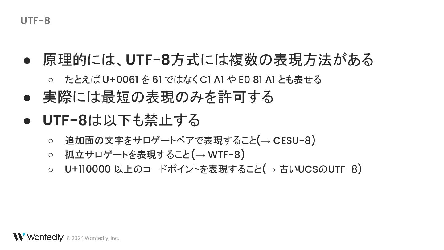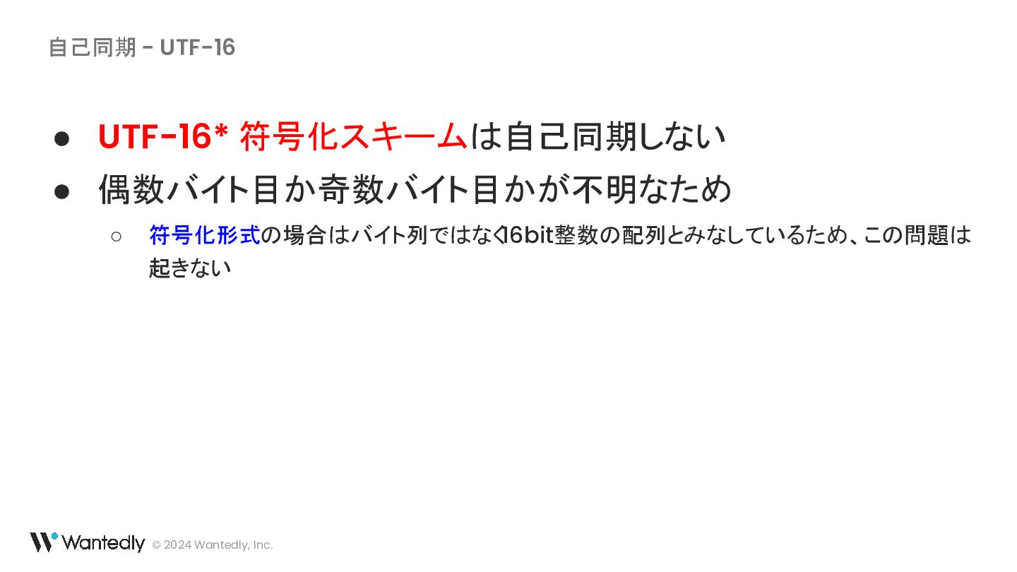 AC FE FF 30 AC FF FE AC 30 U+30AC BE, No BOM BE, BOM LE, BOM U+FEFF または U+FFFE で 始まる場合はBOMが必須だが、 こうしたケースはほぼないと考えてよい ギ U+30AC 3通りのエンコード 方法がある (どれでも良い) BOM (バイト順マーク) [Unicode] §3.10