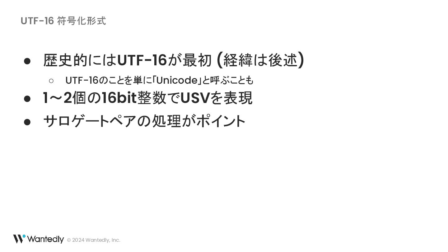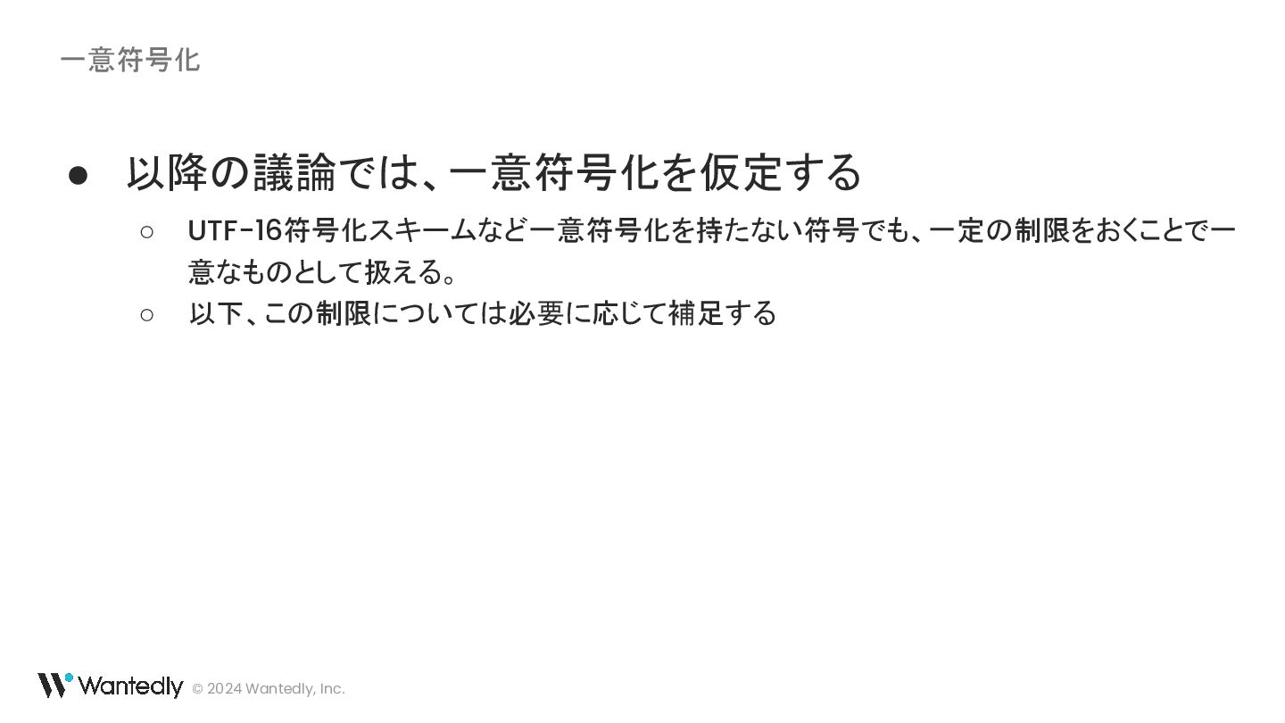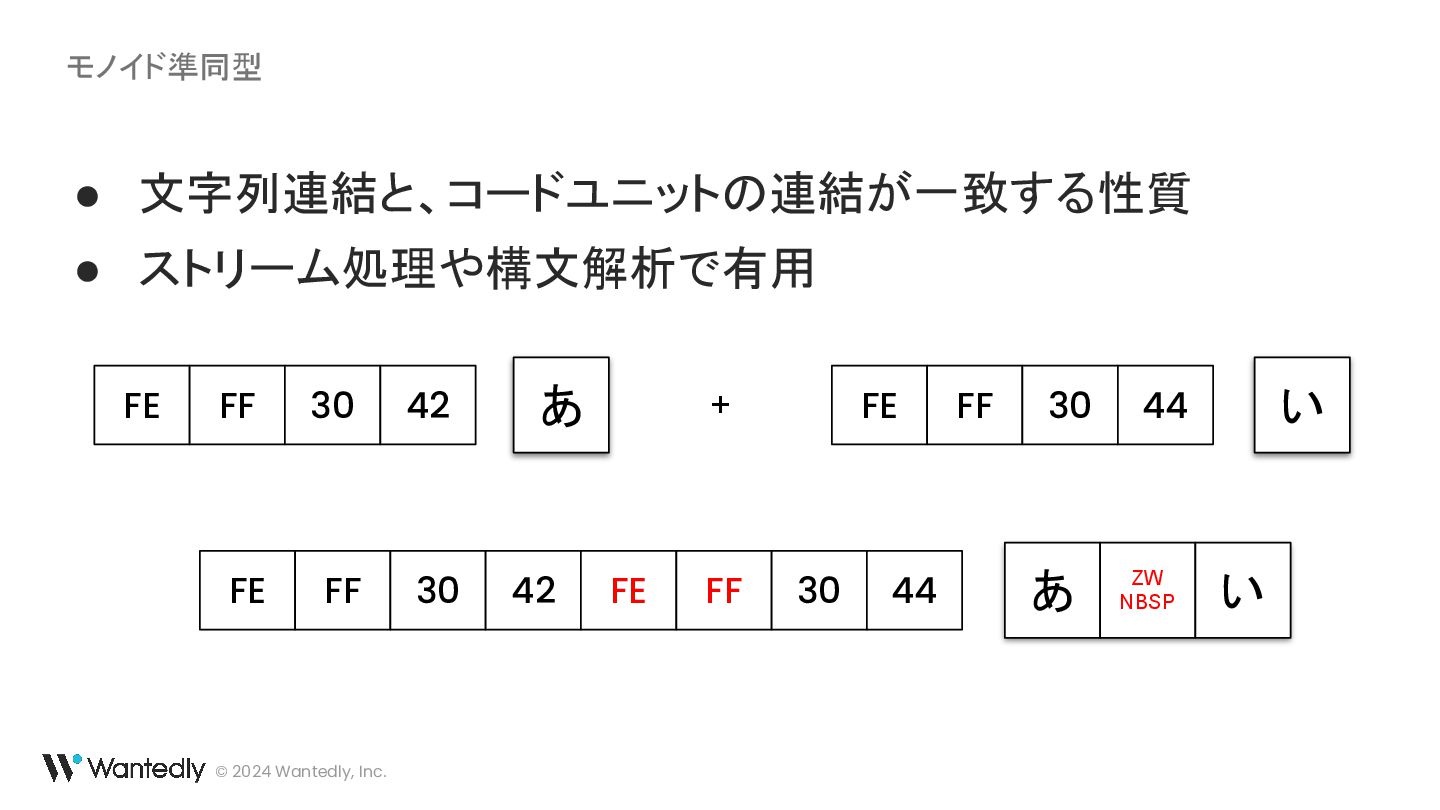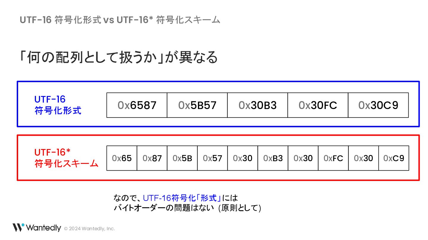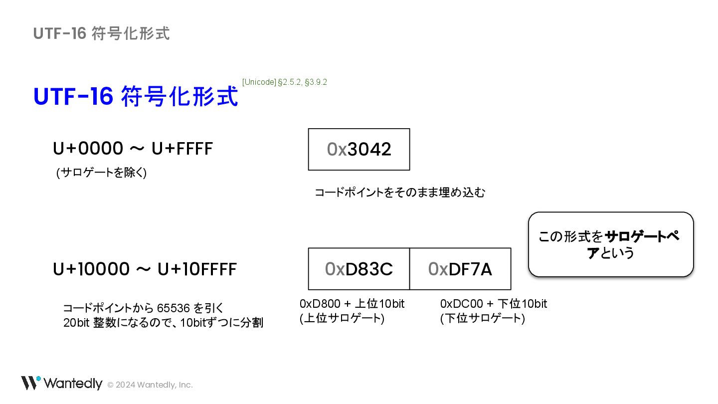 AC FE FF 30 AC FF FE AC 30 U+30AC BE, No BOM BE, BOM LE, BOM U+FEFF または U+FFFE で 始まる場合はBOMが必須だが、 こうしたケースはほぼないと考えてよい ギ U+30AC 3通りのエンコード 方法がある (どれでも良い) BOM (バイト順マーク) [Unicode] §3.10