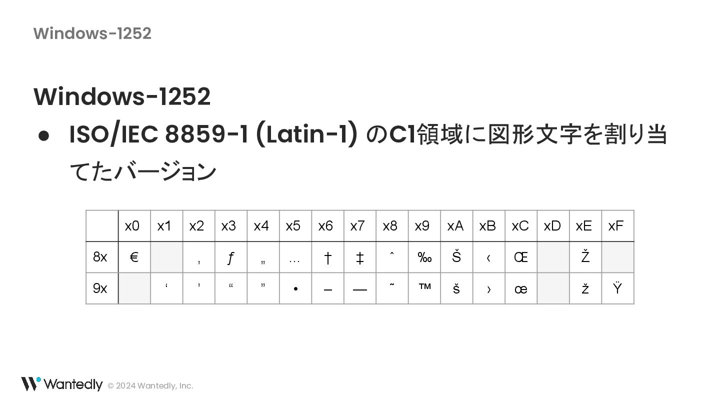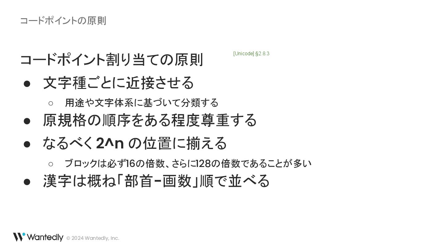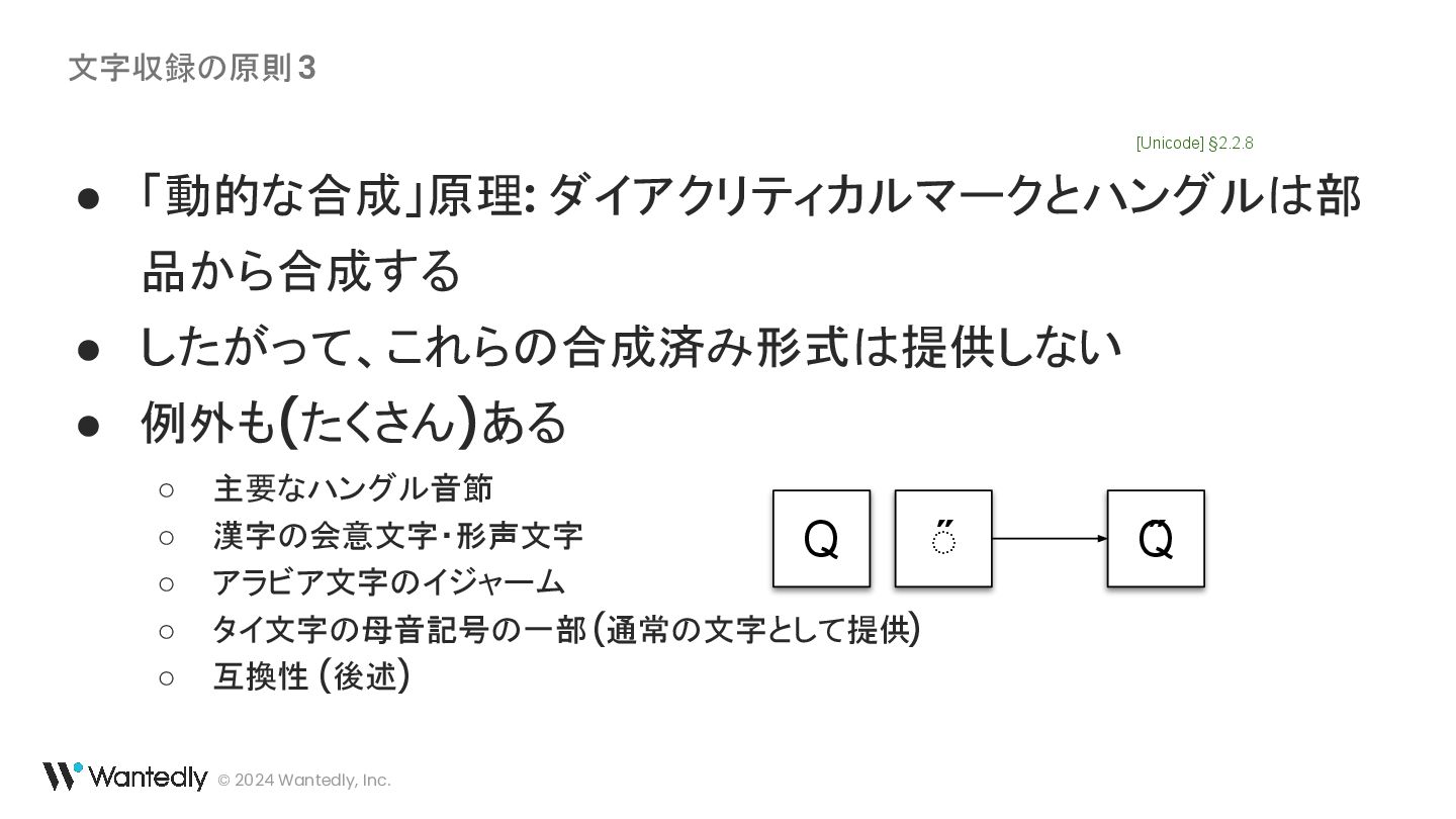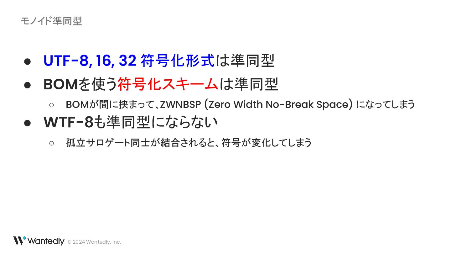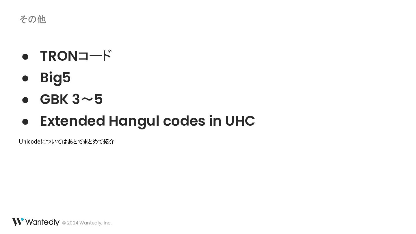 AC FE FF 30 AC FF FE AC 30 U+30AC BE, No BOM BE, BOM LE, BOM U+FEFF または U+FFFE で 始まる場合はBOMが必須だが、 こうしたケースはほぼないと考えてよい ギ U+30AC 3通りのエンコード 方法がある (どれでも良い) BOM (バイト順マーク) [Unicode] §3.10