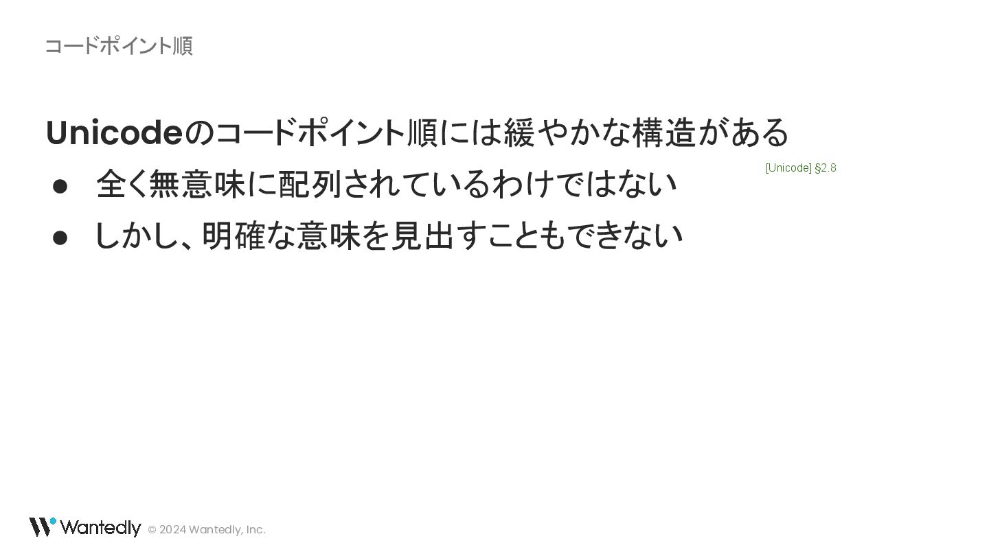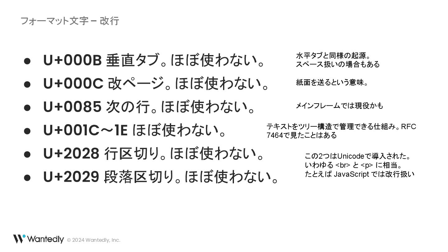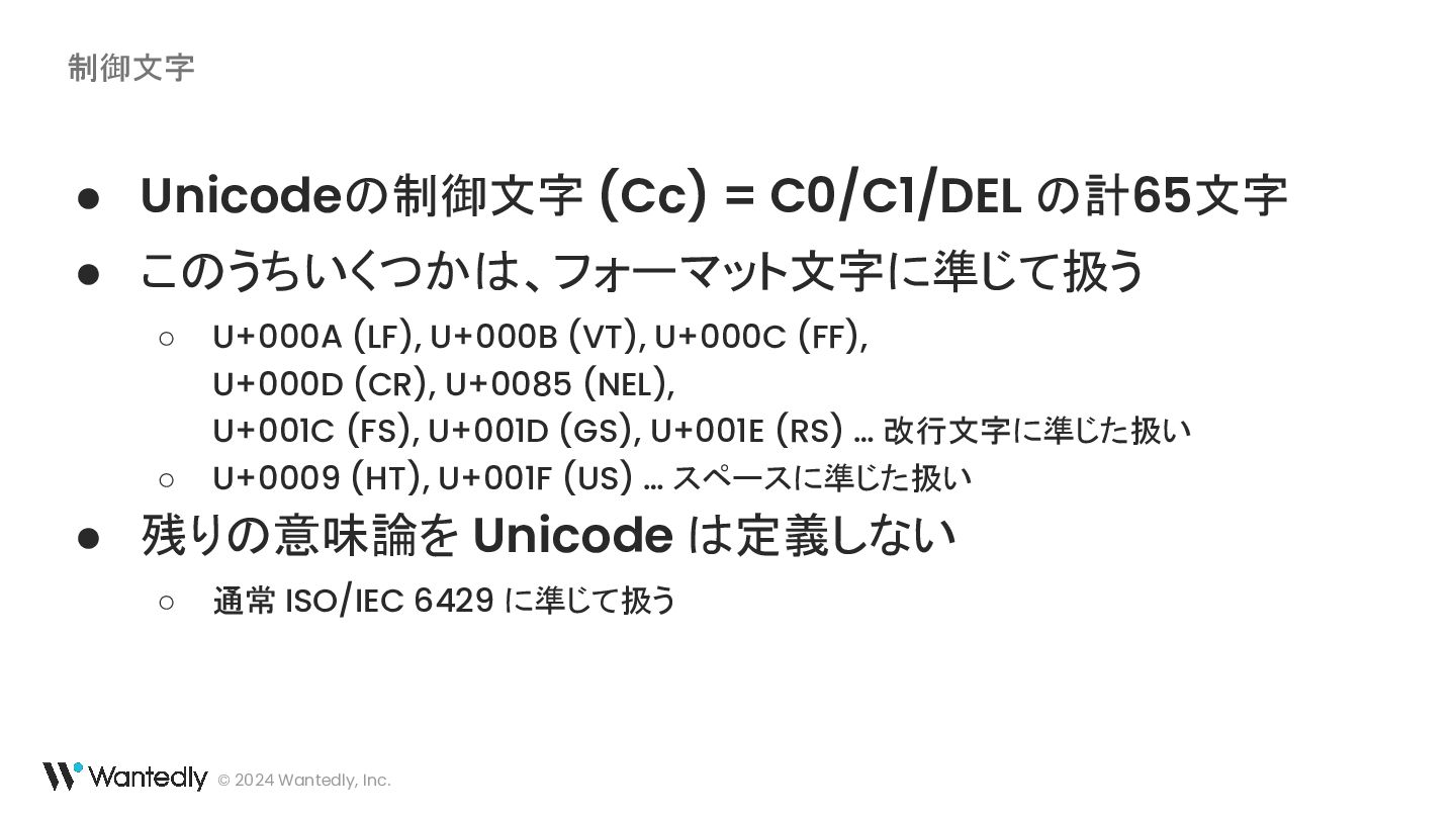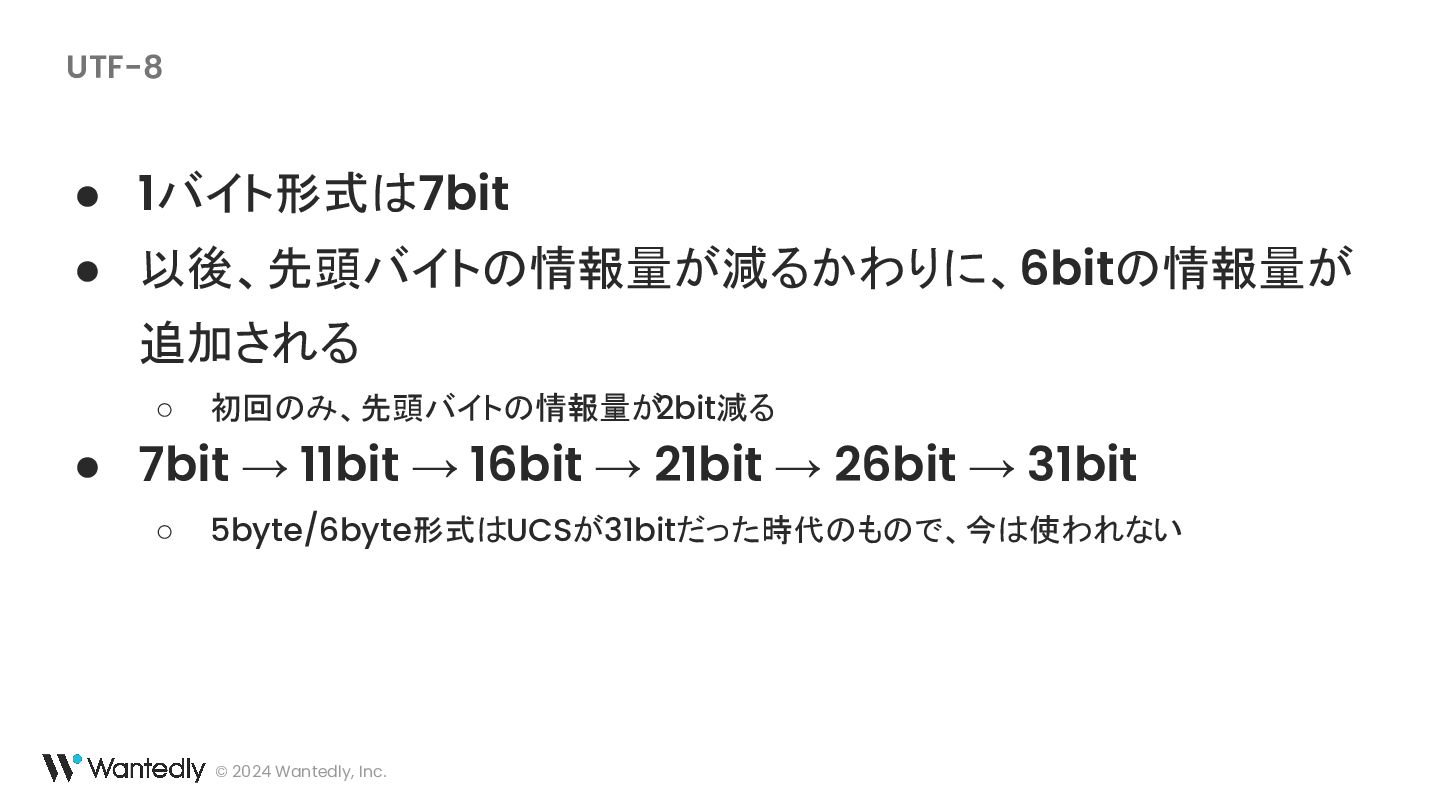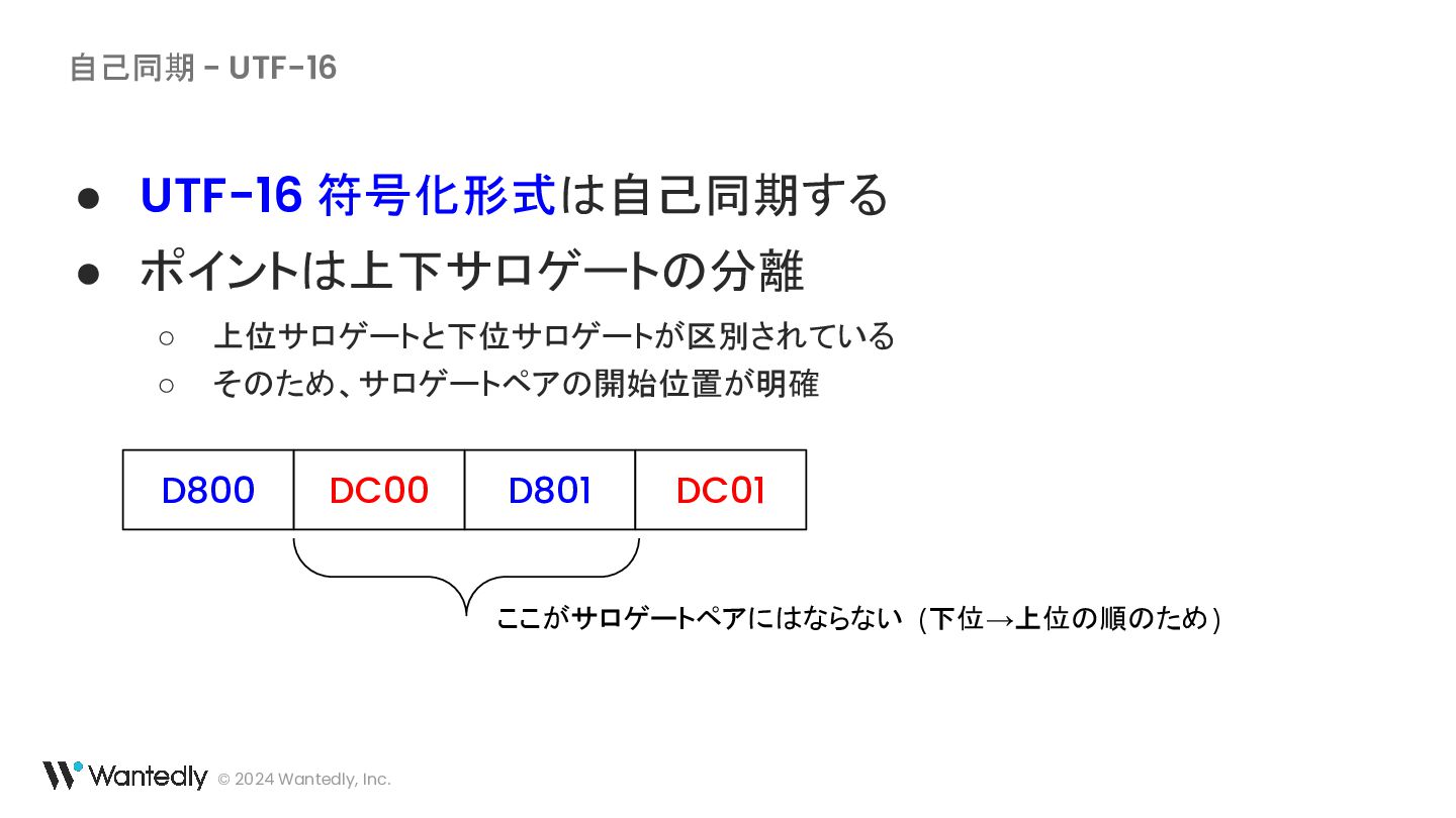 AC FE FF 30 AC FF FE AC 30 U+30AC BE, No BOM BE, BOM LE, BOM U+FEFF または U+FFFE で 始まる場合はBOMが必須だが、 こうしたケースはほぼないと考えてよい ギ U+30AC 3通りのエンコード 方法がある (どれでも良い) BOM (バイト順マーク) [Unicode] §3.10