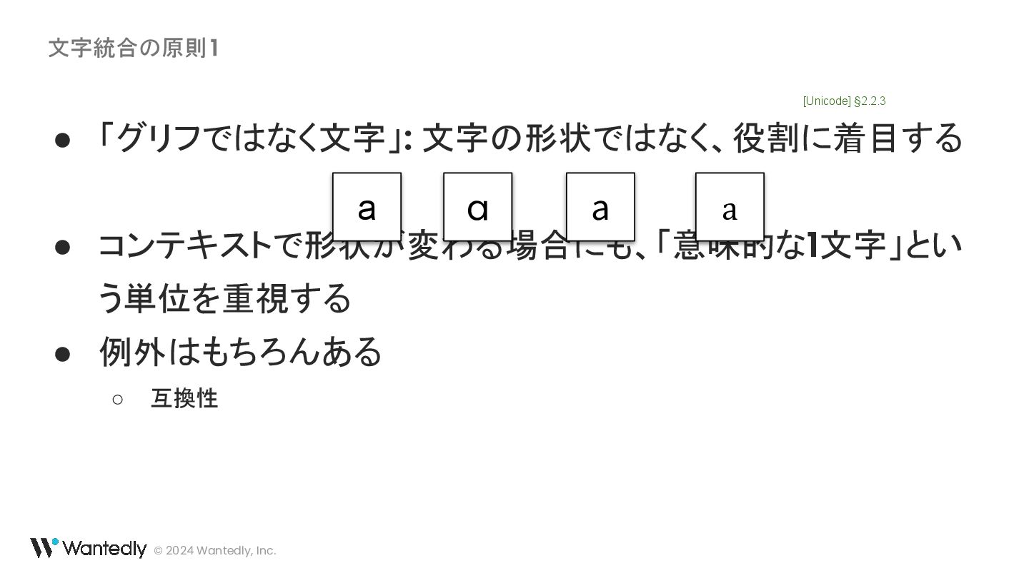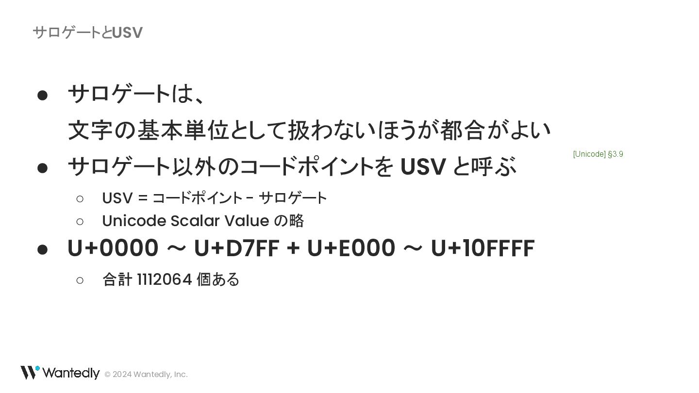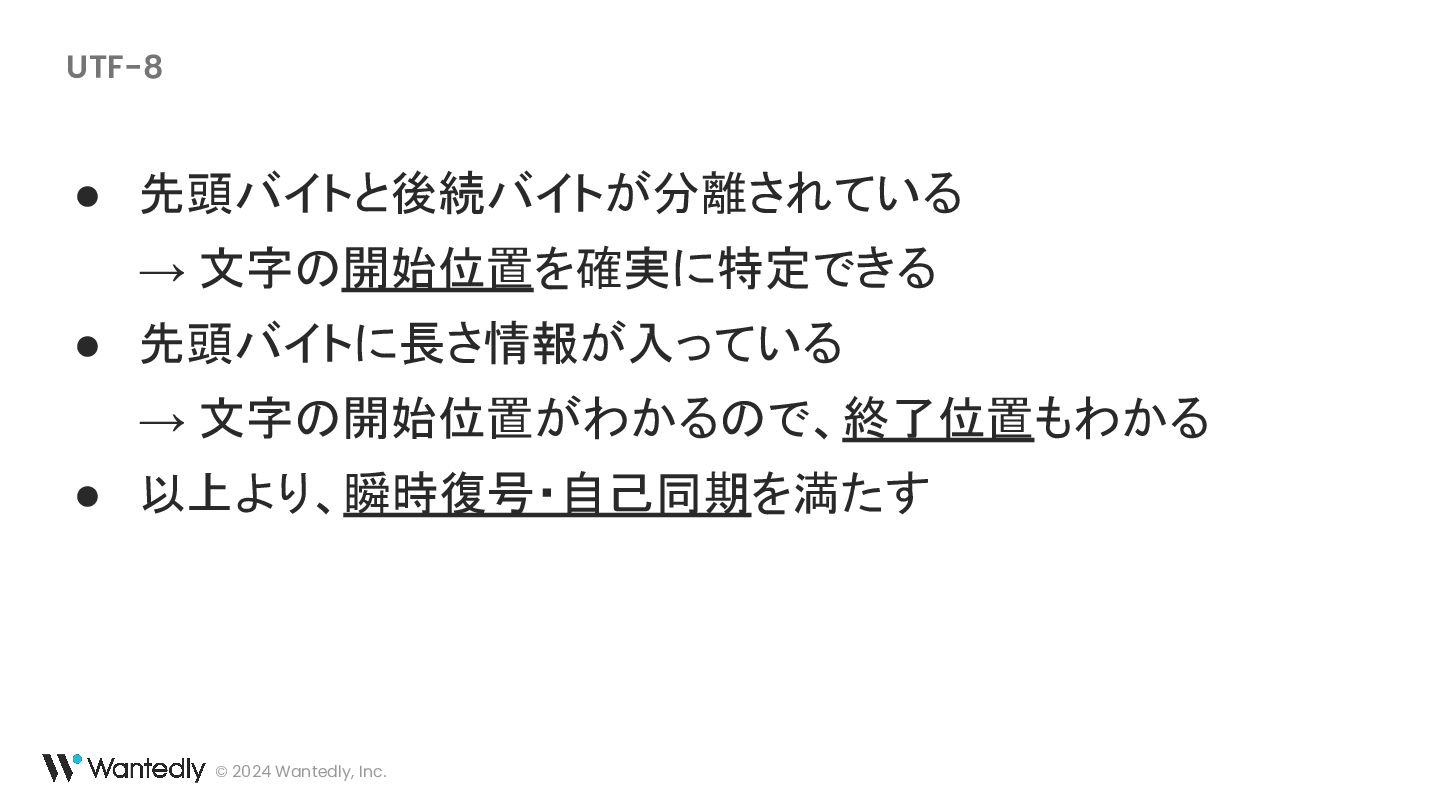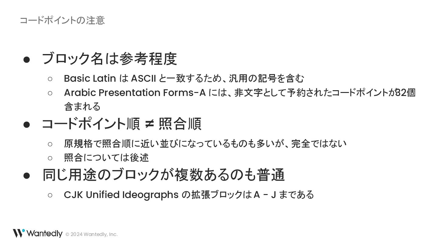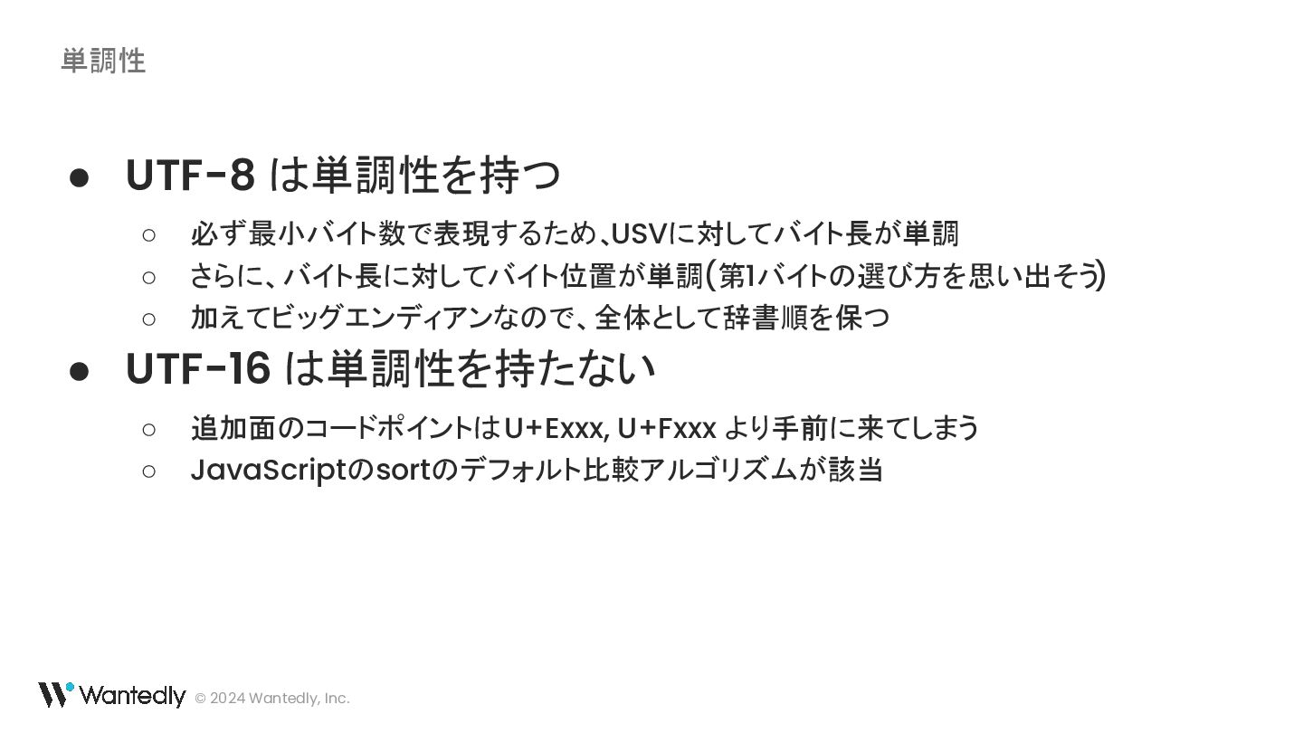 AC FE FF 30 AC FF FE AC 30 U+30AC BE, No BOM BE, BOM LE, BOM U+FEFF または U+FFFE で 始まる場合はBOMが必須だが、 こうしたケースはほぼないと考えてよい ギ U+30AC 3通りのエンコード 方法がある (どれでも良い) BOM (バイト順マーク) [Unicode] §3.10