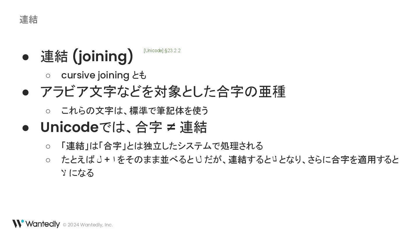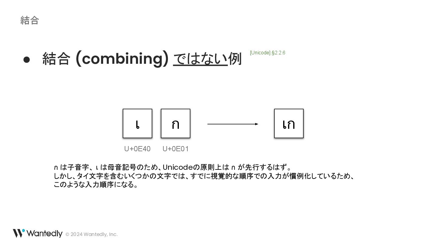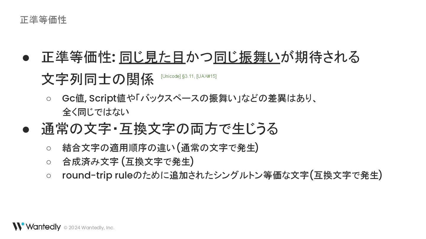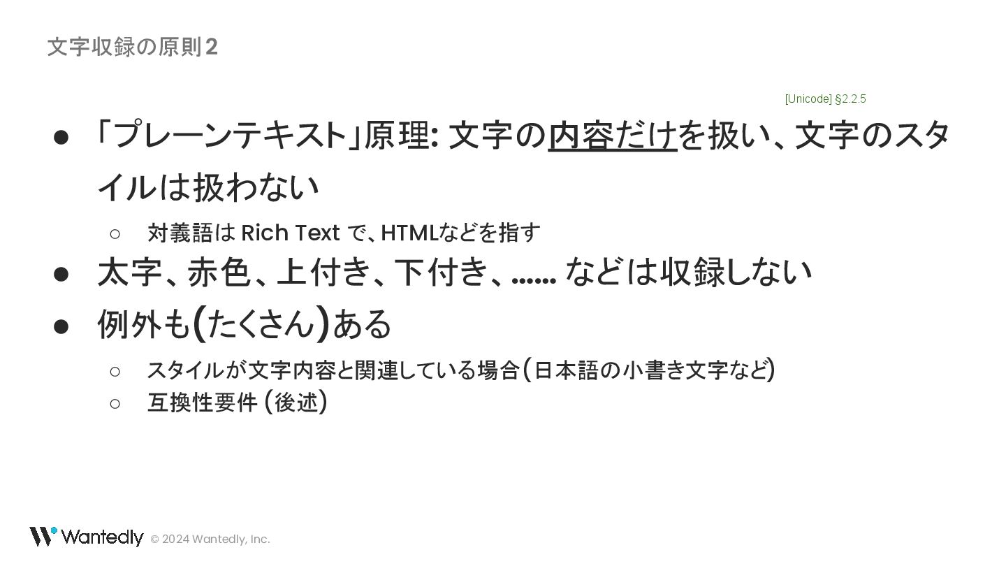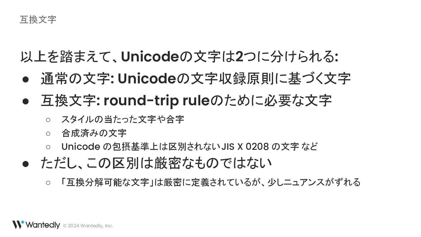 AC FE FF 30 AC FF FE AC 30 U+30AC BE, No BOM BE, BOM LE, BOM U+FEFF または U+FFFE で 始まる場合はBOMが必須だが、 こうしたケースはほぼないと考えてよい ギ U+30AC 3通りのエンコード 方法がある (どれでも良い) BOM (バイト順マーク) [Unicode] §3.10