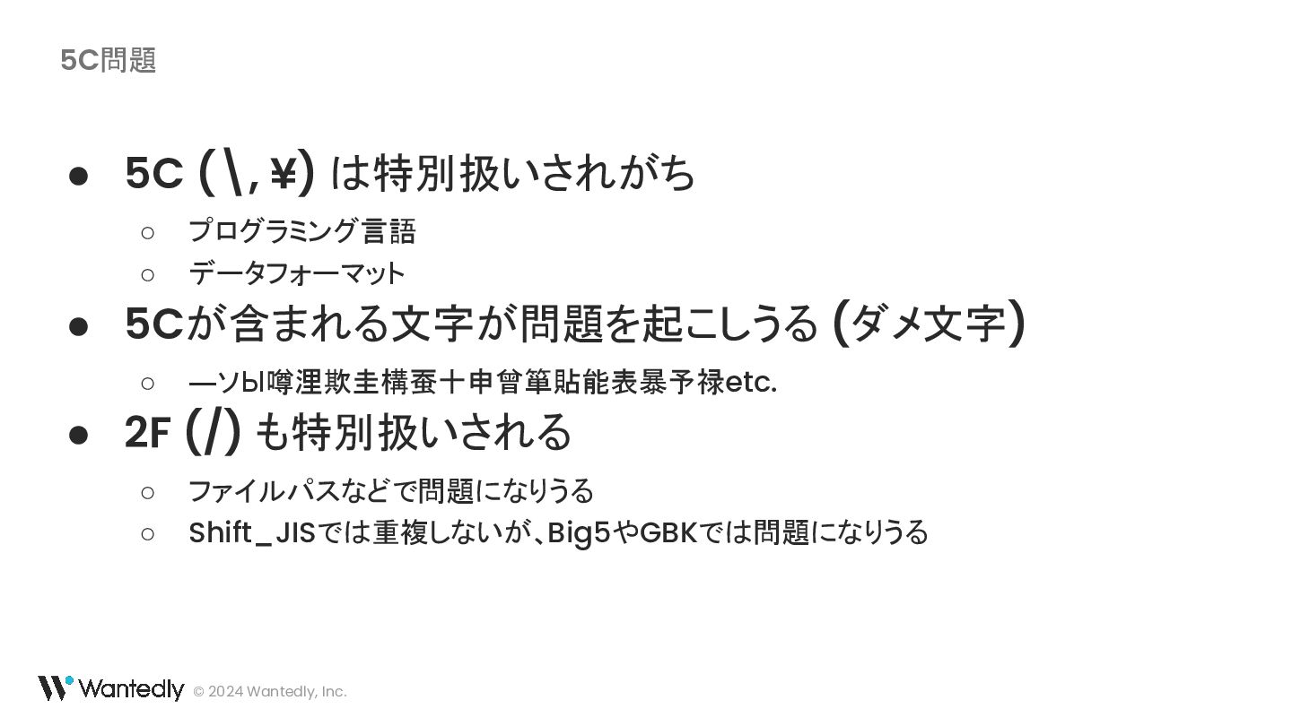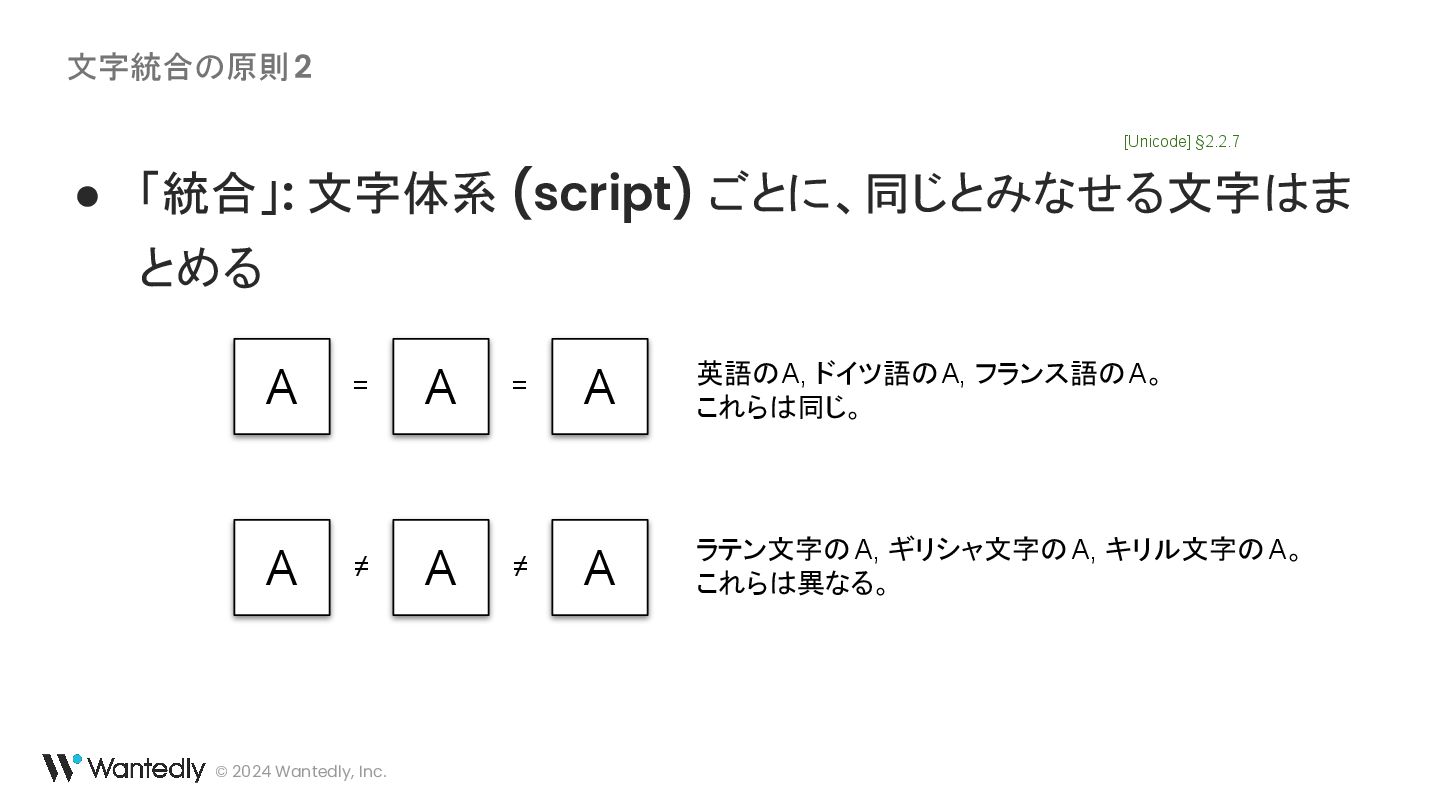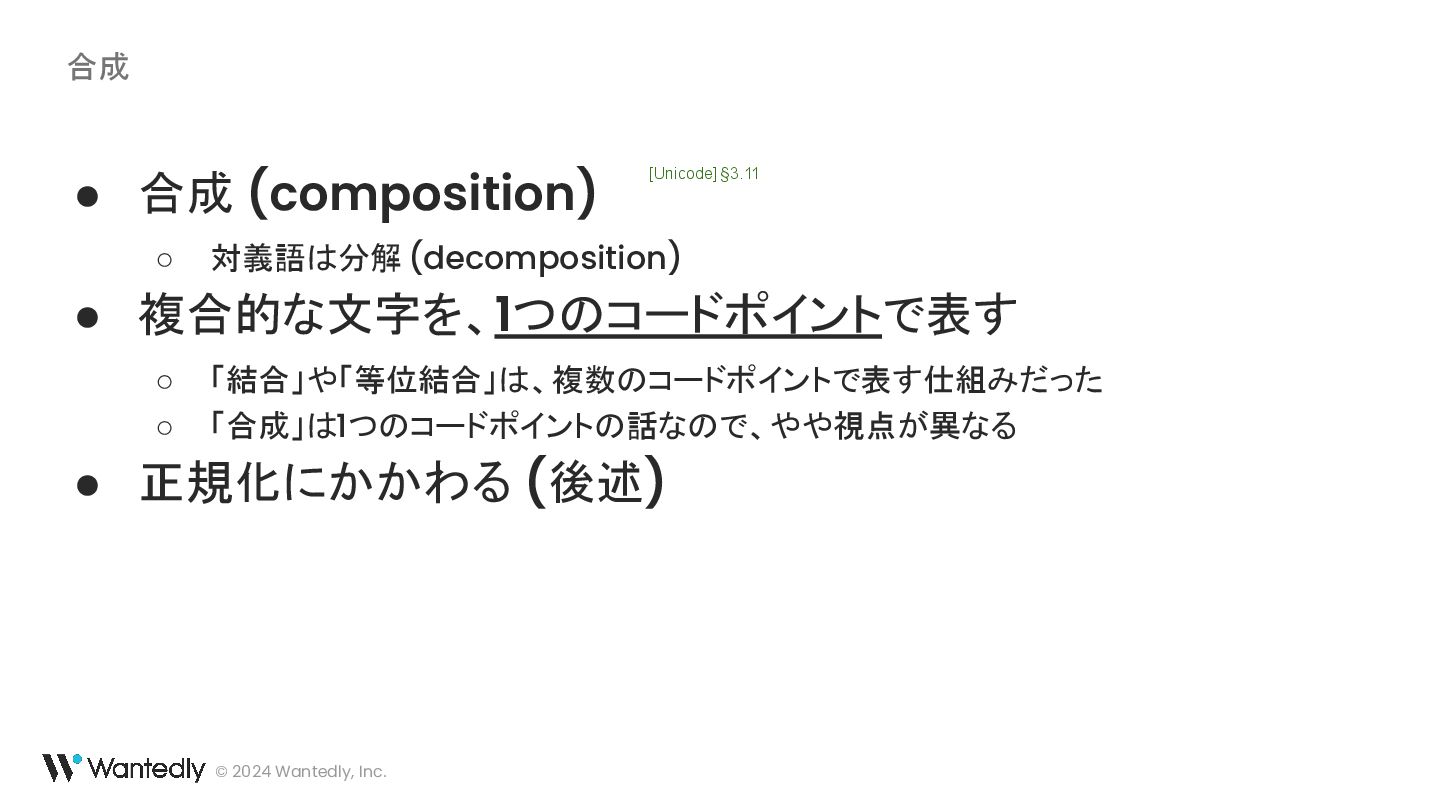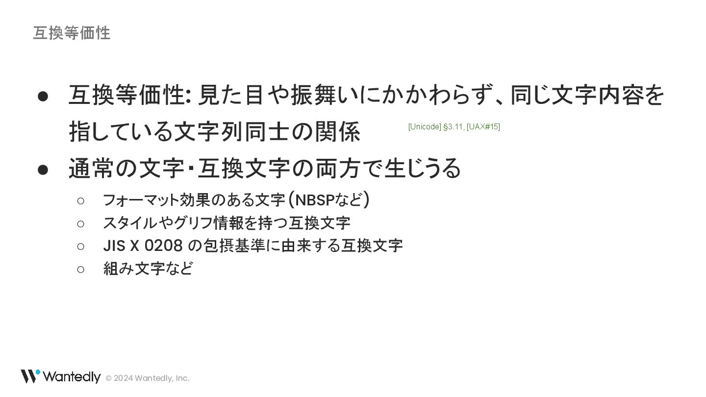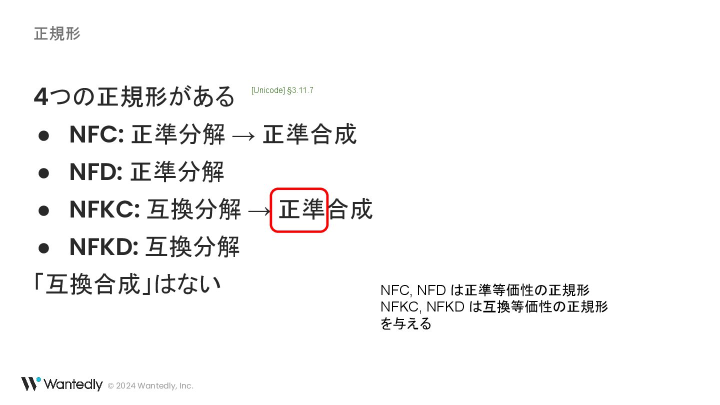 AC FE FF 30 AC FF FE AC 30 U+30AC BE, No BOM BE, BOM LE, BOM U+FEFF または U+FFFE で 始まる場合はBOMが必須だが、 こうしたケースはほぼないと考えてよい ギ U+30AC 3通りのエンコード 方法がある (どれでも良い) BOM (バイト順マーク) [Unicode] §3.10