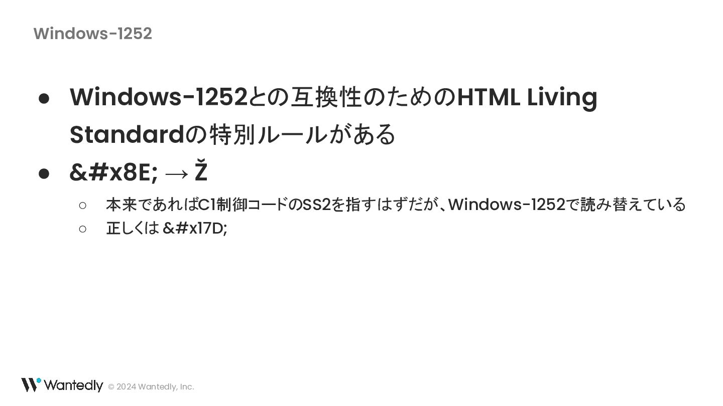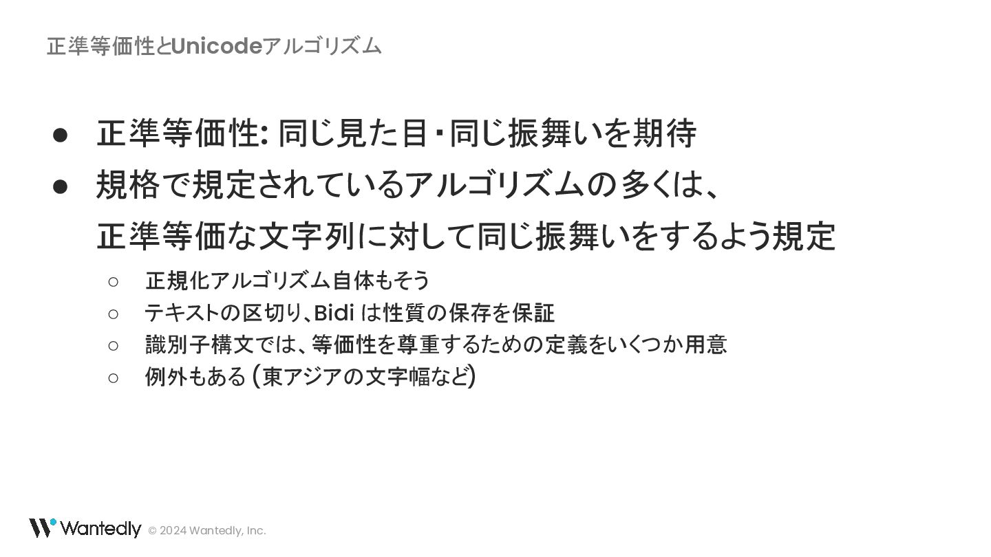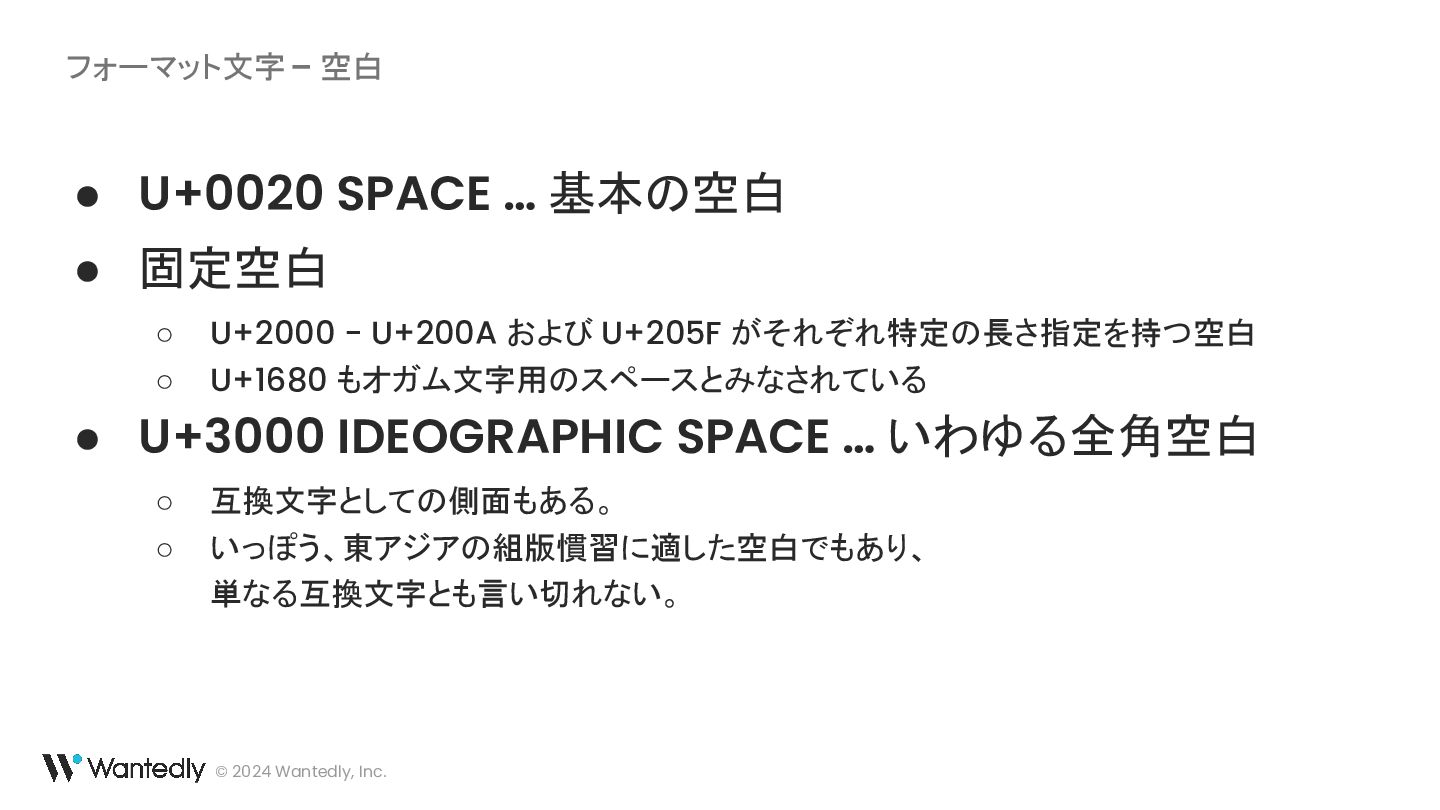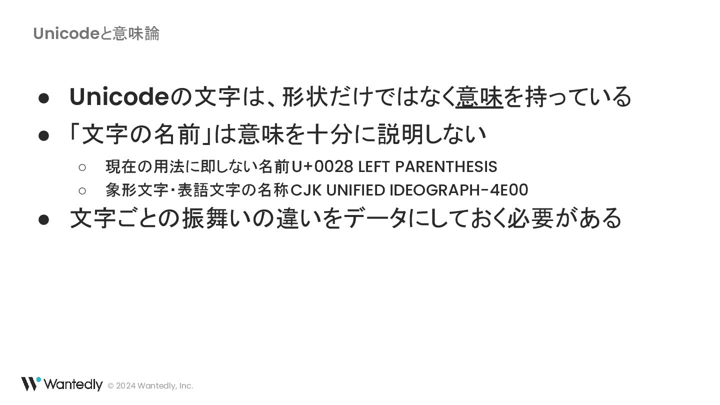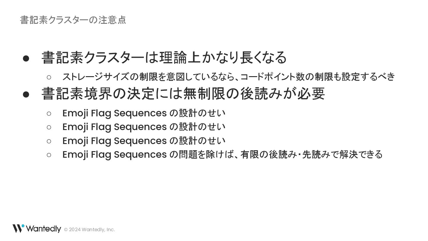 AC FE FF 30 AC FF FE AC 30 U+30AC BE, No BOM BE, BOM LE, BOM U+FEFF または U+FFFE で 始まる場合はBOMが必須だが、 こうしたケースはほぼないと考えてよい ギ U+30AC 3通りのエンコード 方法がある (どれでも良い) BOM (バイト順マーク) [Unicode] §3.10