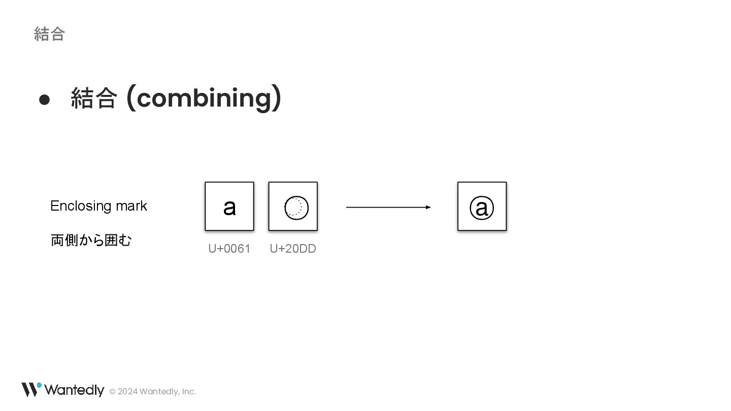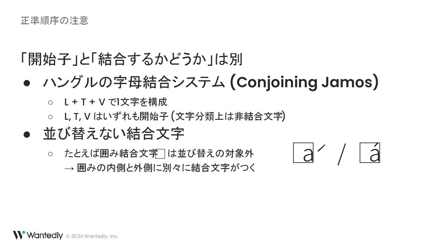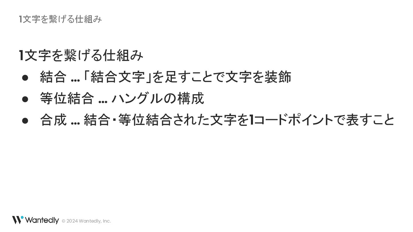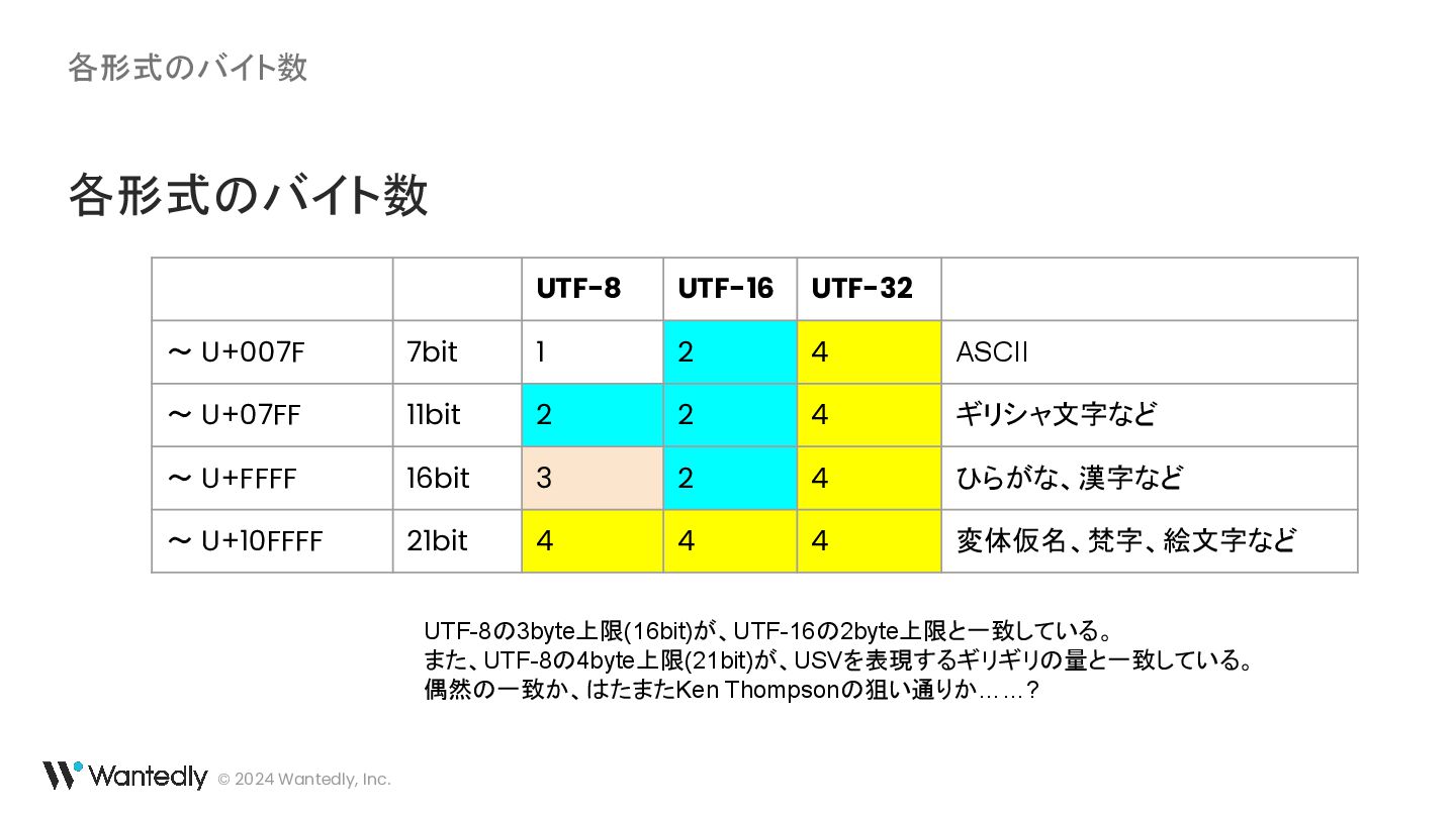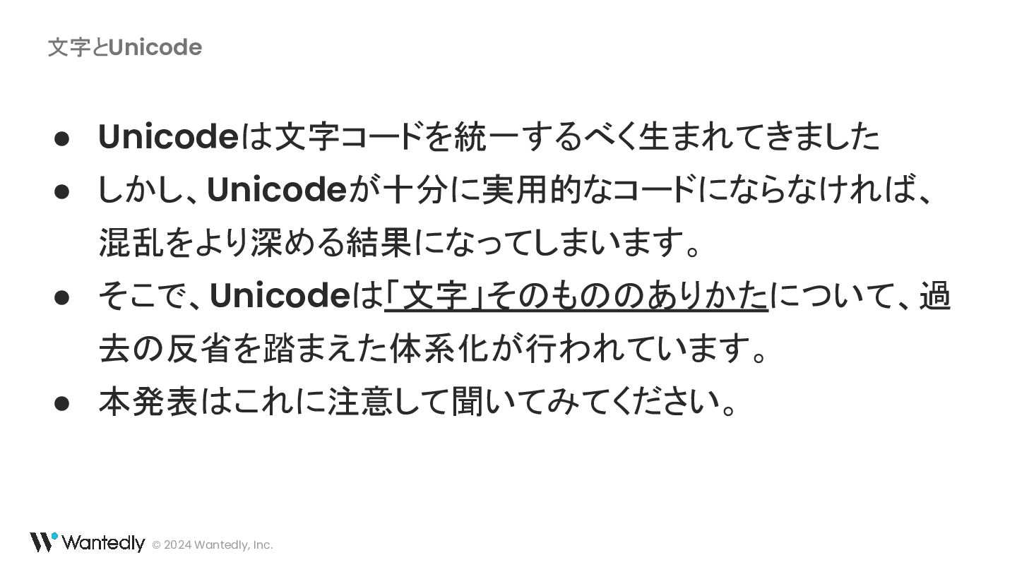 AC FE FF 30 AC FF FE AC 30 U+30AC BE, No BOM BE, BOM LE, BOM U+FEFF または U+FFFE で 始まる場合はBOMが必須だが、 こうしたケースはほぼないと考えてよい ギ U+30AC 3通りのエンコード 方法がある (どれでも良い) BOM (バイト順マーク) [Unicode] §3.10