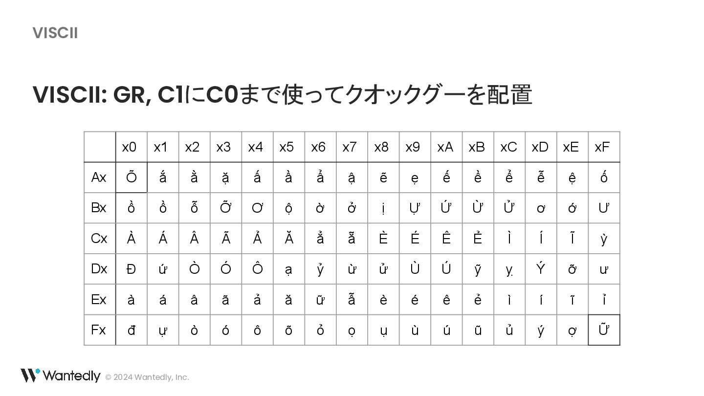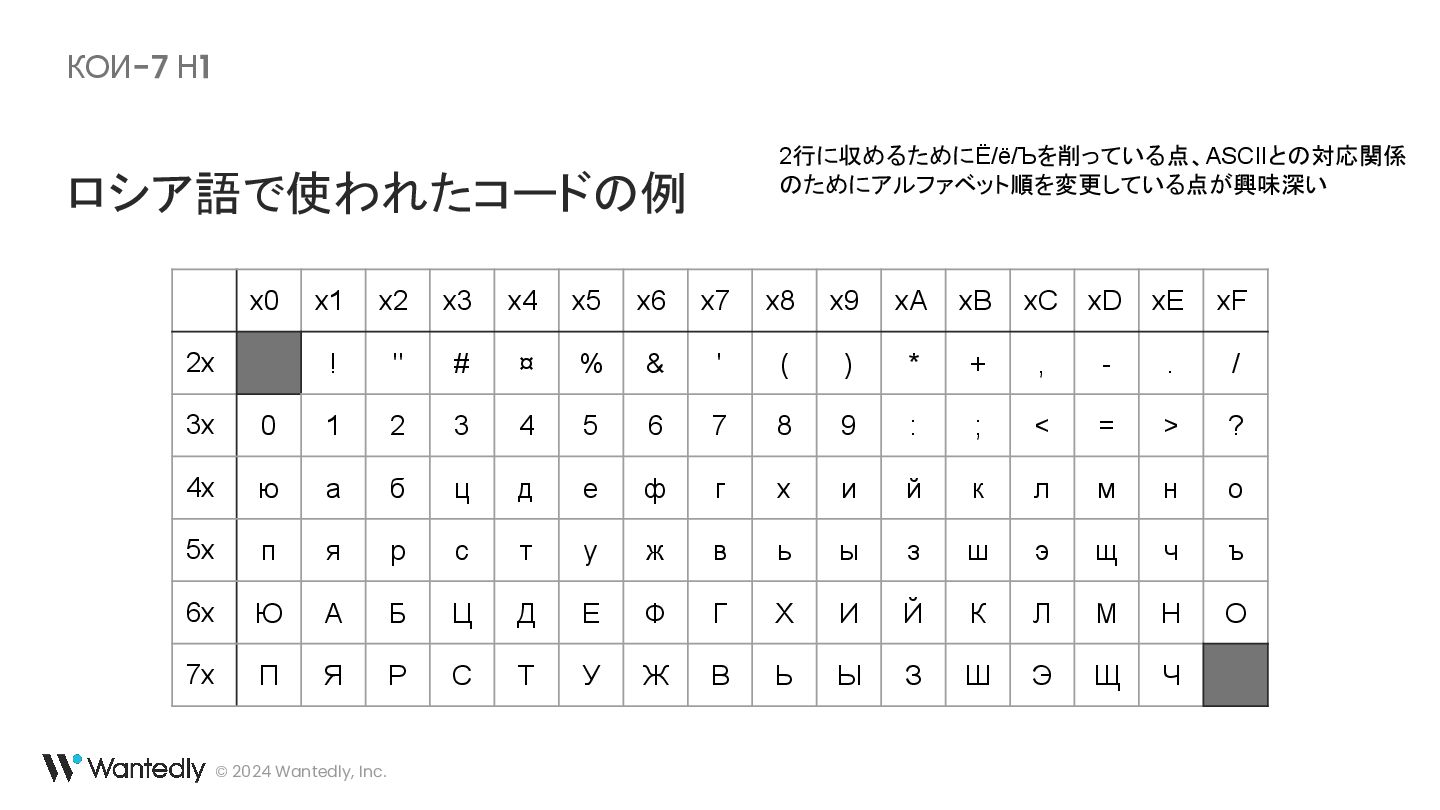 x3 x4 x5 x6 x7 x8 x9 xA xB xC xD xE xF 2x ! " # ¤ % & ' ( ) * + , - . / 3x 0 1 2 3 4 5 6 7 8 9 : ; < = > ? 4x ю а б ц д е ф г х и й к л м н о 5x п я р с т у ж в ь ы з ш э щ ч ъ 6x Ю А Б Ц Д Е Ф Г Х И Й К Л М Н О 7x П Я Р С Т У Ж В Ь Ы З Ш Э Щ Ч 2行に収めるためにЁ/ё/Ъを削っている点、ASCIIとの対応関係 のためにアルファベット順を変更している点が興味深い