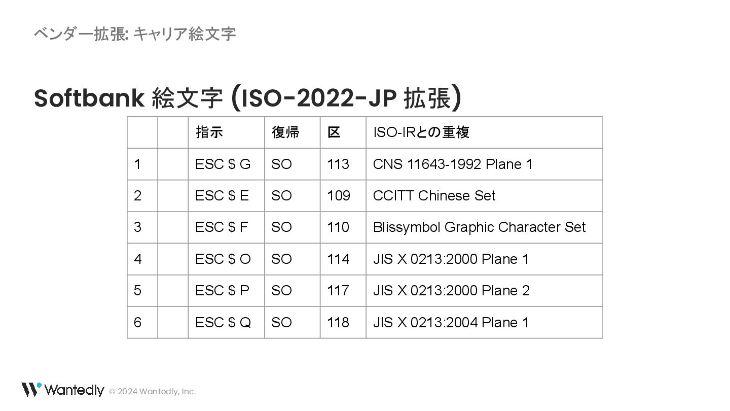 指示 復帰 区 ISO-IRとの重複 1 ESC $ G SO 113 CNS 11643-1992 Plane 1 2 ESC $ E SO 109 CCITT Chinese Set 3 ESC $ F SO 110 Blissymbol Graphic Character Set 4 ESC $ O SO 114 JIS X 0213:2000 Plane 1 5 ESC $ P SO 117 JIS X 0213:2000 Plane 2 6 ESC $ Q SO 118 JIS X 0213:2004 Plane 1