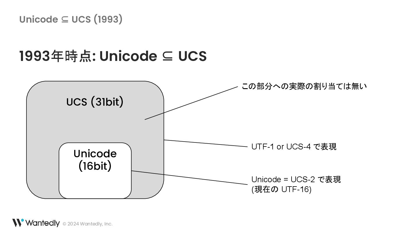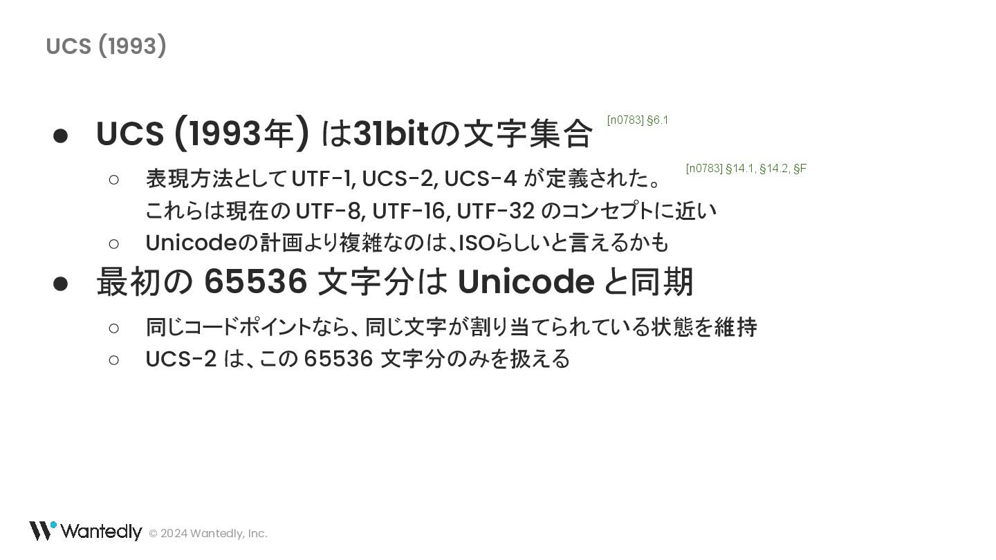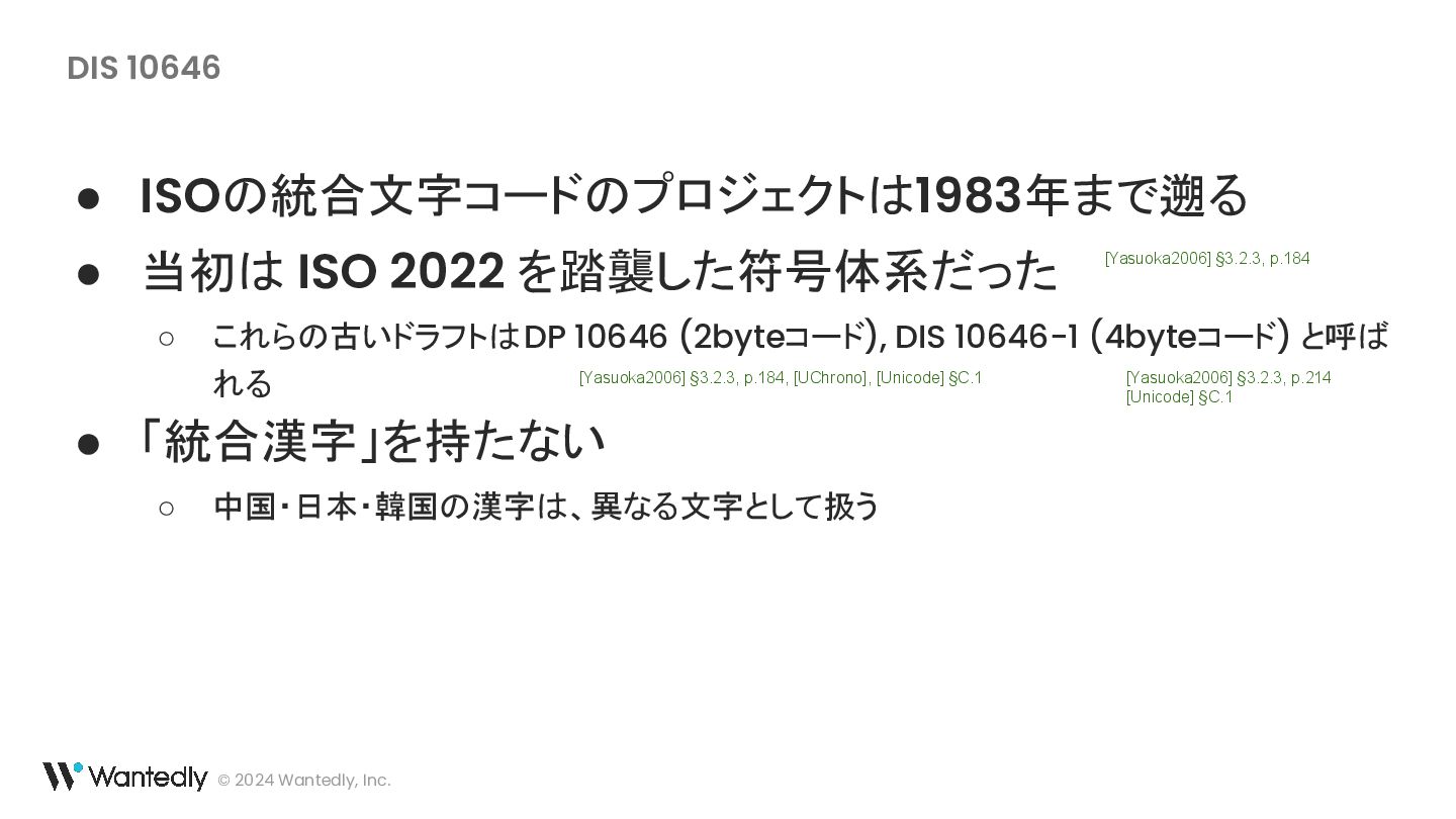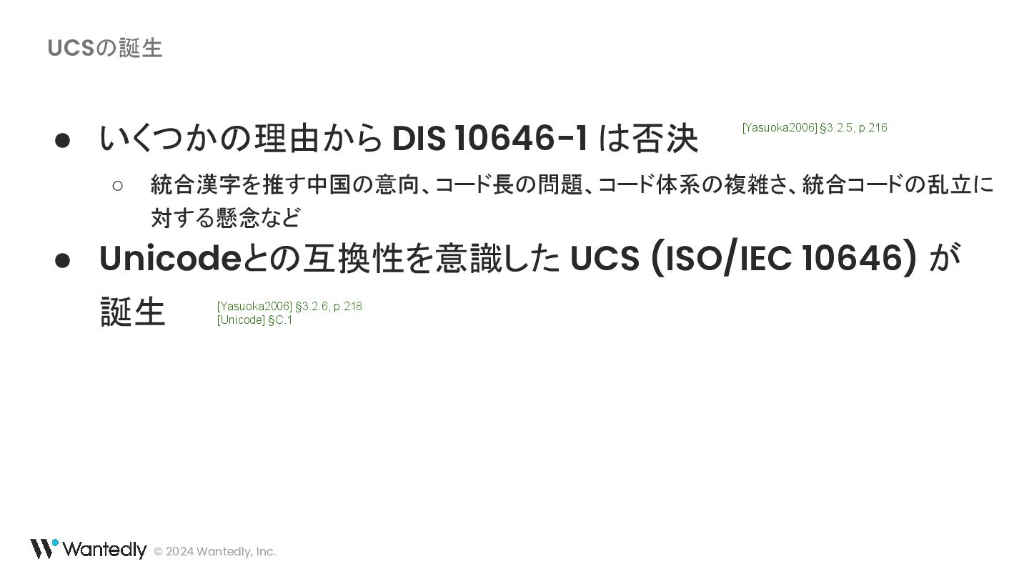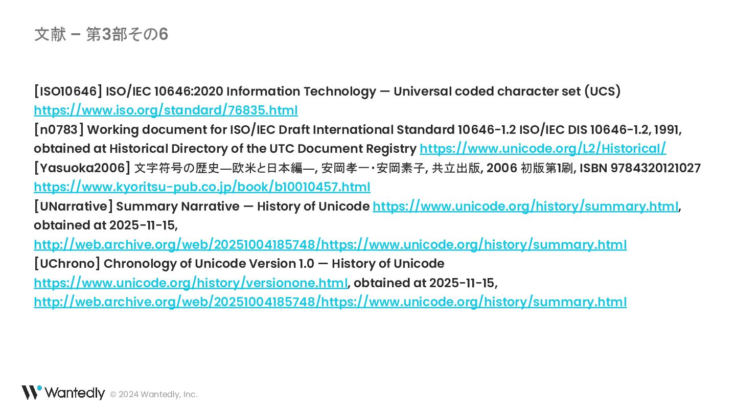 Information Technology — Universal coded character set (UCS) https://www.iso.org/standard/76835.html [n0783] Working document for ISO/IEC Draft International Standard 10646-1.2 ISO/IEC DIS 10646-1.2, 1991, obtained at Historical Directory of the UTC Document Registry https://www.unicode.org/L2/Historical/ [Yasuoka2006] 文字符号の歴史―欧米と日本編―, 安岡孝一・安岡素子, 共立出版, 2006 初版第1刷, ISBN 9784320121027 https://www.kyoritsu-pub.co.jp/book/b10010457.html [UNarrative] Summary Narrative — History of Unicode https://www.unicode.org/history/summary.html, obtained at 2025-11-15, http://web.archive.org/web/20251004185748/https://www.unicode.org/history/summary.html [UChrono] Chronology of Unicode Version 1.0 — History of Unicode https://www.unicode.org/history/versionone.html, obtained at 2025-11-15, http://web.archive.org/web/20251004185748/https://www.unicode.org/history/summary.html