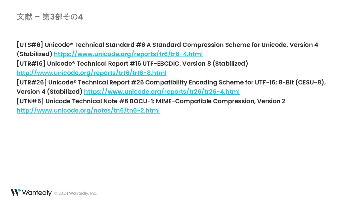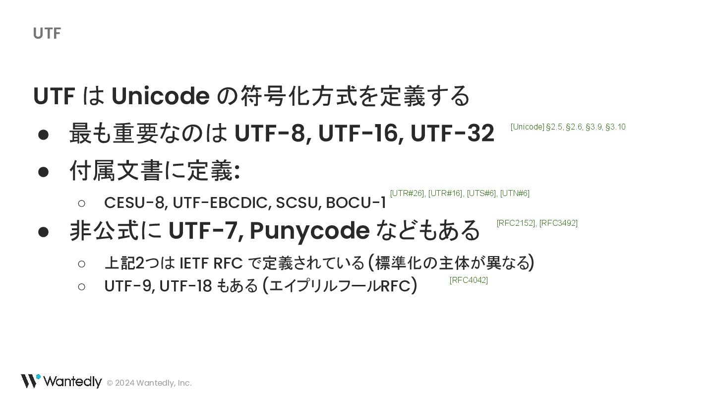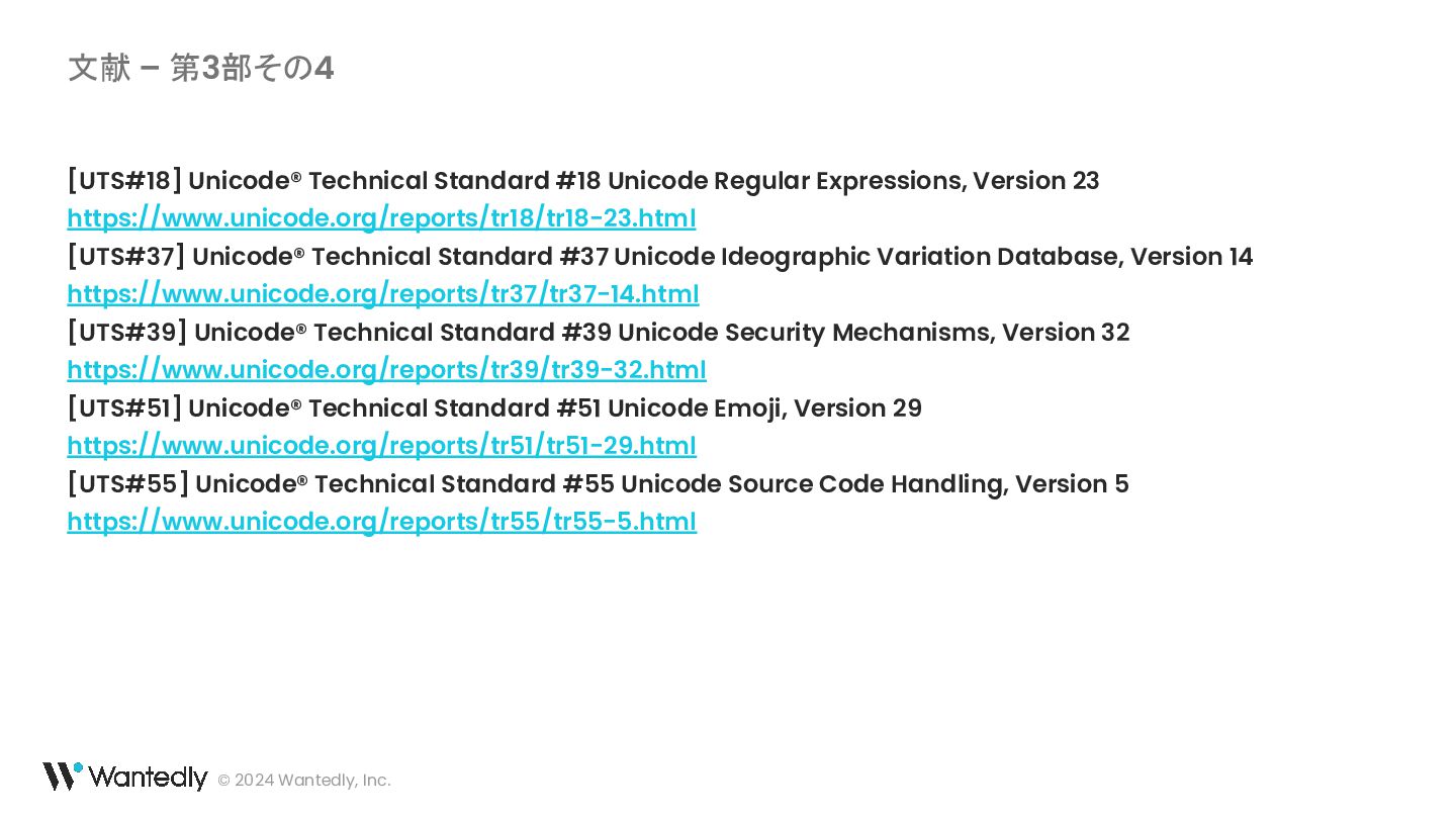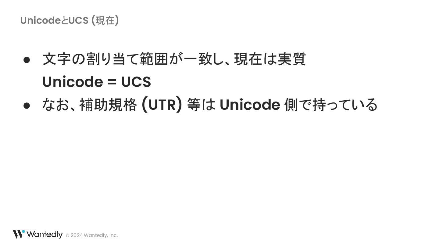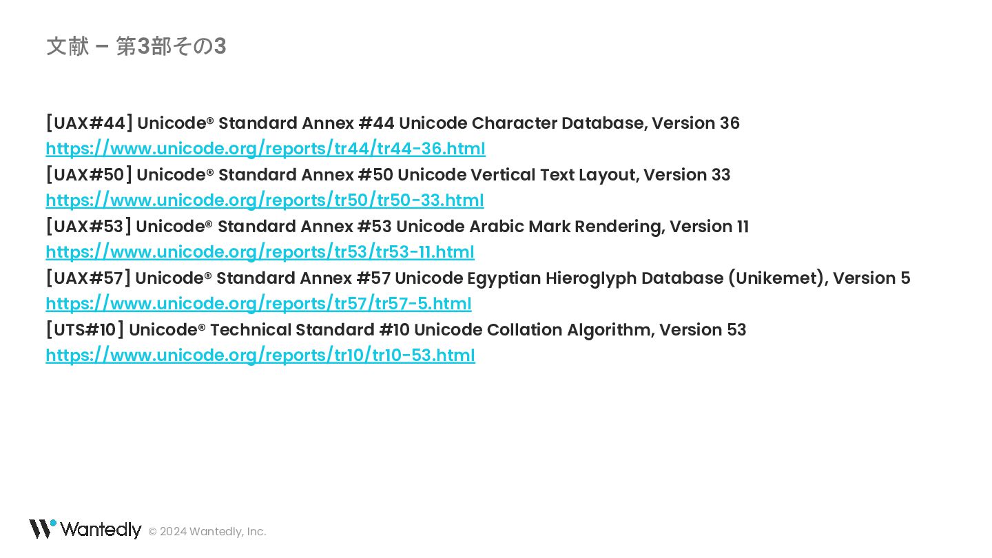 Information Technology — Universal coded character set (UCS) https://www.iso.org/standard/76835.html [n0783] Working document for ISO/IEC Draft International Standard 10646-1.2 ISO/IEC DIS 10646-1.2, 1991, obtained at Historical Directory of the UTC Document Registry https://www.unicode.org/L2/Historical/ [Yasuoka2006] 文字符号の歴史―欧米と日本編―, 安岡孝一・安岡素子, 共立出版, 2006 初版第1刷, ISBN 9784320121027 https://www.kyoritsu-pub.co.jp/book/b10010457.html [UNarrative] Summary Narrative — History of Unicode https://www.unicode.org/history/summary.html, obtained at 2025-11-15, http://web.archive.org/web/20251004185748/https://www.unicode.org/history/summary.html [UChrono] Chronology of Unicode Version 1.0 — History of Unicode https://www.unicode.org/history/versionone.html, obtained at 2025-11-15, http://web.archive.org/web/20251004185748/https://www.unicode.org/history/summary.html