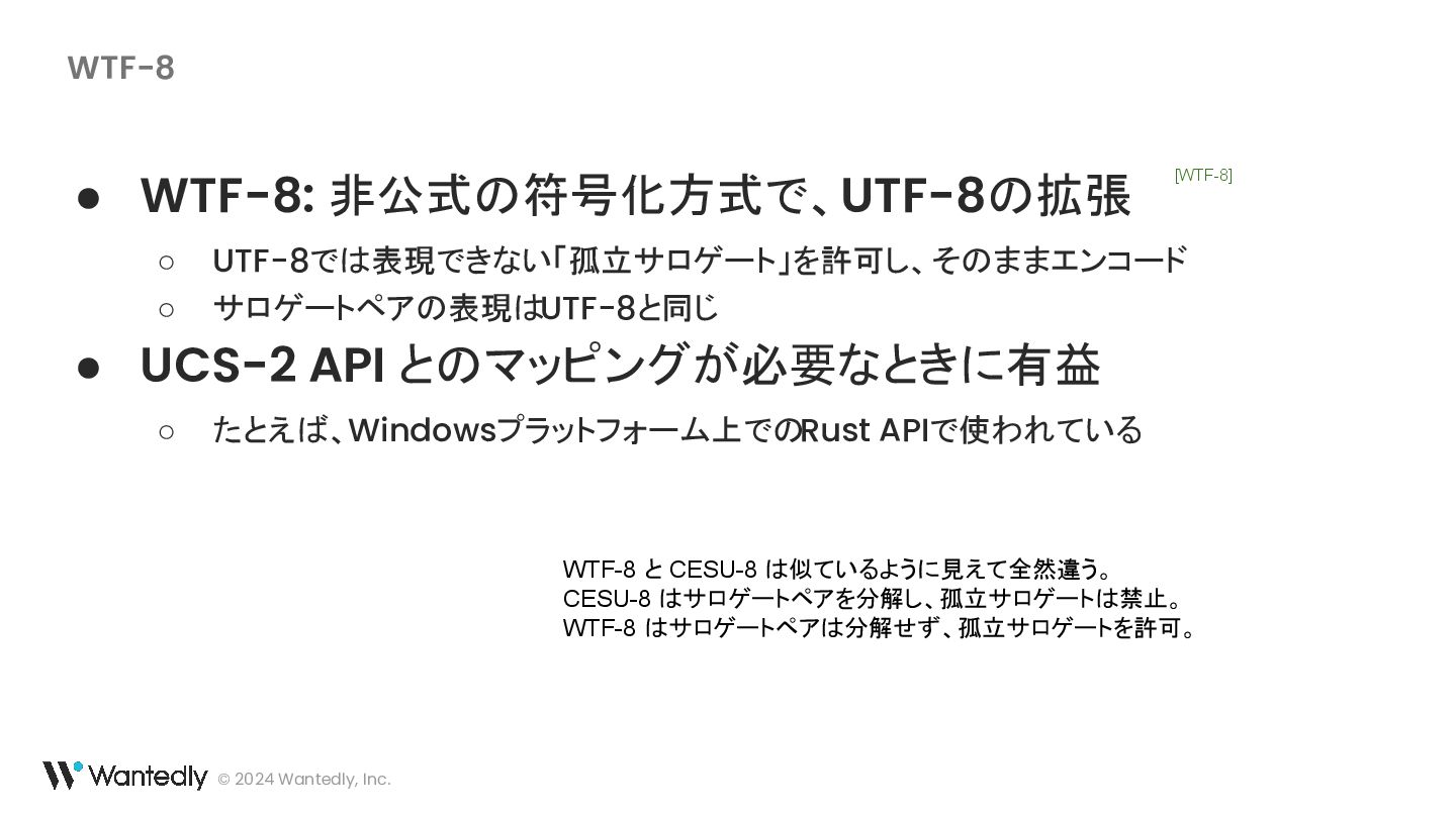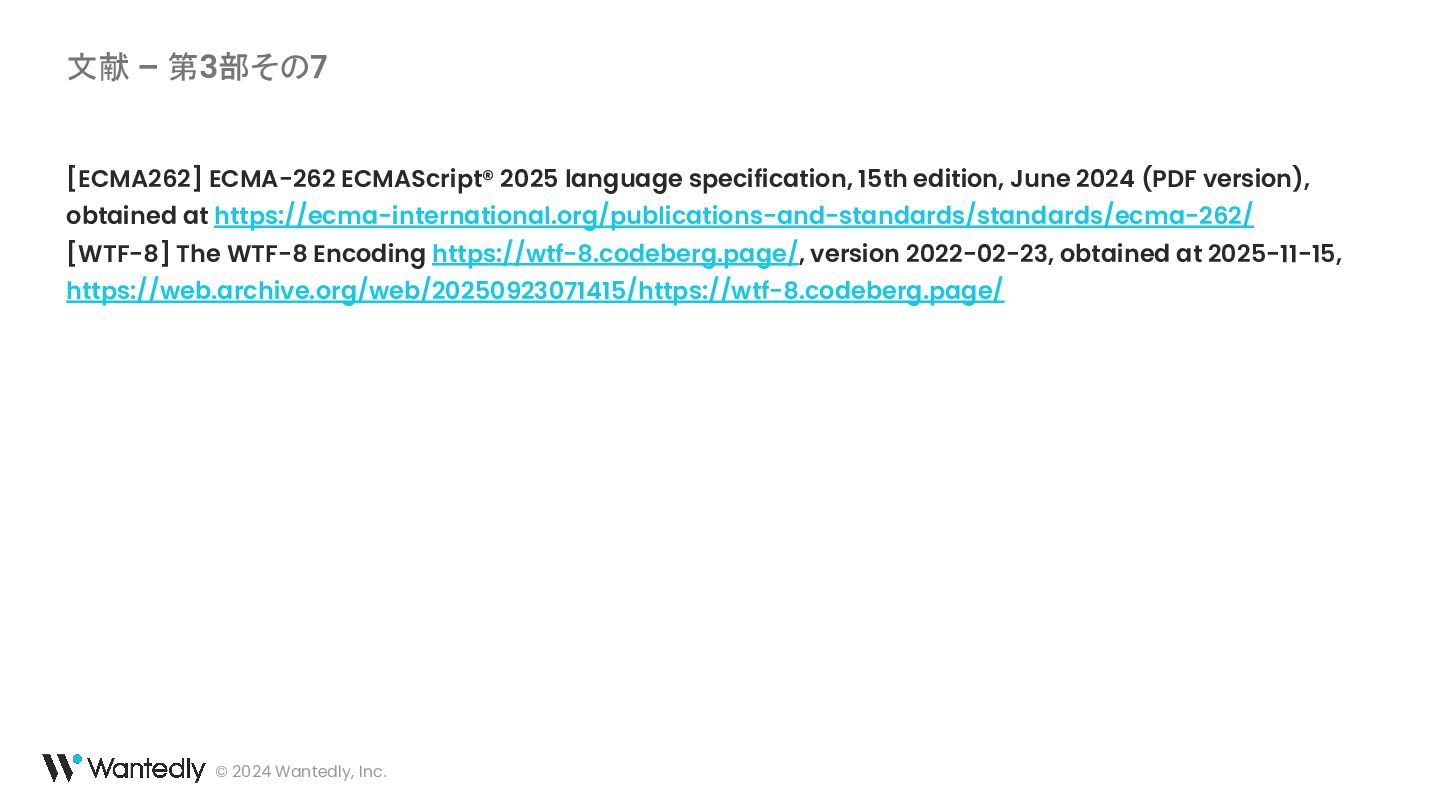 2025 language specification, 15th edition, June 2024 (PDF version), obtained at https://ecma-international.org/publications-and-standards/standards/ecma-262/ [WTF-8] The WTF-8 Encoding https://wtf-8.codeberg.page/, version 2022-02-23, obtained at 2025-11-15, https://web.archive.org/web/20250923071415/https://wtf-8.codeberg.page/