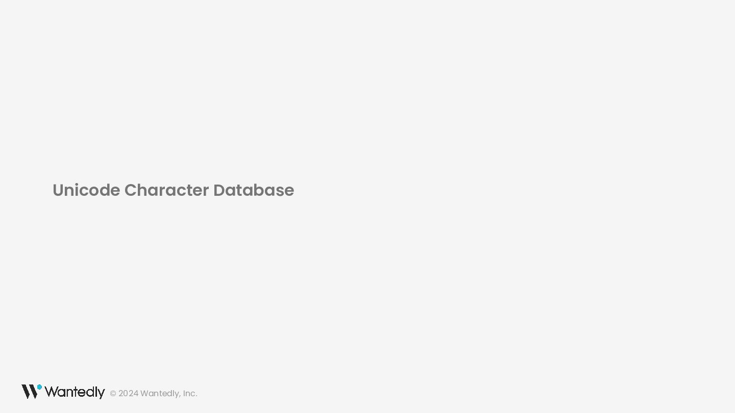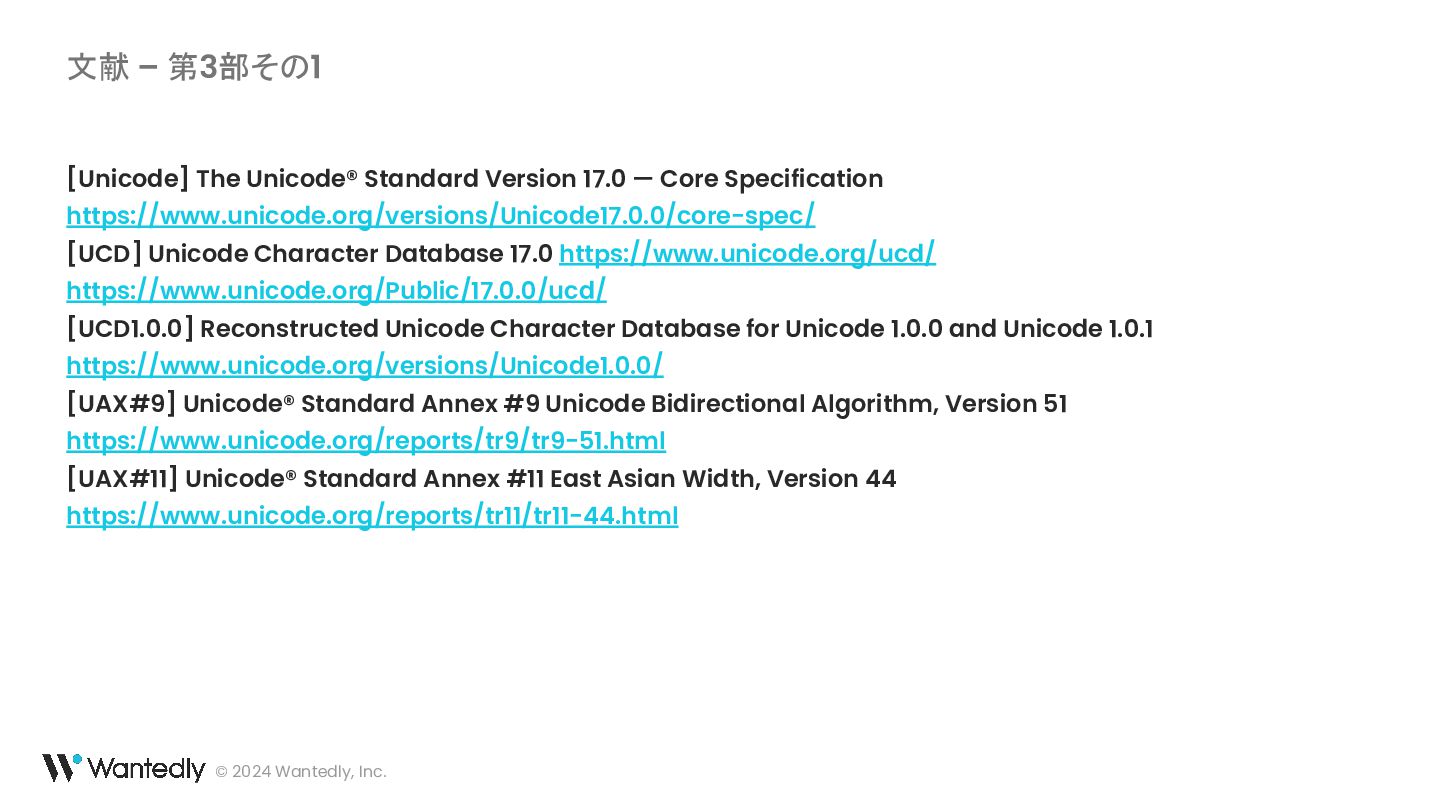 Standard Version 17.0 — Core Specification https://www.unicode.org/versions/Unicode17.0.0/core-spec/ [UCD] Unicode Character Database 17.0 https://www.unicode.org/ucd/ https://www.unicode.org/Public/17.0.0/ucd/ [UCD1.0.0] Reconstructed Unicode Character Database for Unicode 1.0.0 and Unicode 1.0.1 https://www.unicode.org/versions/Unicode1.0.0/ [UAX#9] Unicode® Standard Annex #9 Unicode Bidirectional Algorithm, Version 51 https://www.unicode.org/reports/tr9/tr9-51.html [UAX#11] Unicode® Standard Annex #11 East Asian Width, Version 44 https://www.unicode.org/reports/tr11/tr11-44.html