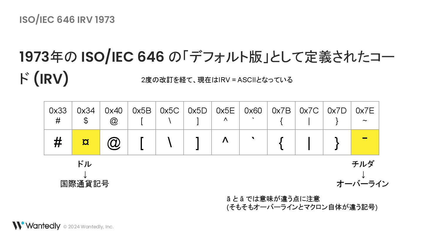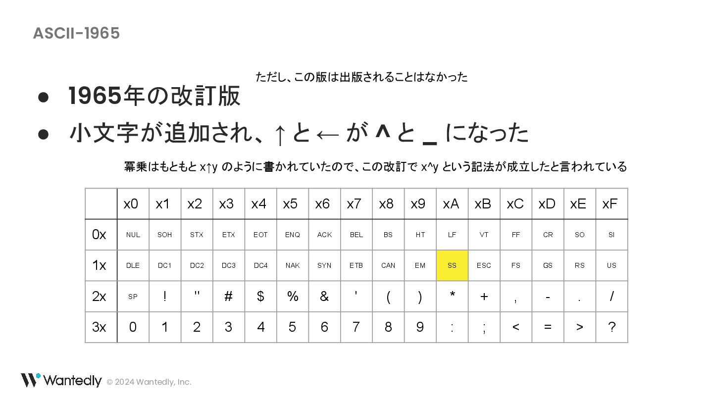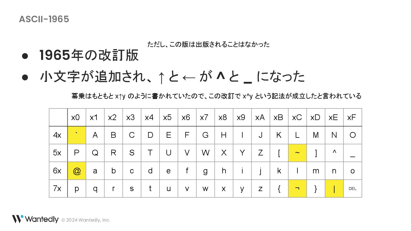 と ← が ^ と _ になった x0 x1 x2 x3 x4 x5 x6 x7 x8 x9 xA xB xC xD xE xF 4x ` A B C D E F G H I J K L M N O 5x P Q R S T U V W X Y Z [ ~ ] ^ _ 6x @ a b c d e f g h i j k l m n o 7x p q r s t u v w x y z { ¬ } | DEL 冪乗はもともと x↑y のように書かれていたので、この改訂で x^y という記法が成立したと言われている ただし、この版は出版されることはなかった