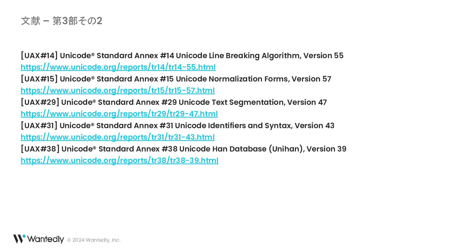 Annex #14 Unicode Line Breaking Algorithm, Version 55 https://www.unicode.org/reports/tr14/tr14-55.html [UAX#15] Unicode® Standard Annex #15 Unicode Normalization Forms, Version 57 https://www.unicode.org/reports/tr15/tr15-57.html [UAX#29] Unicode® Standard Annex #29 Unicode Text Segmentation, Version 47 https://www.unicode.org/reports/tr29/tr29-47.html [UAX#31] Unicode® Standard Annex #31 Unicode Identifiers and Syntax, Version 43 https://www.unicode.org/reports/tr31/tr31-43.html [UAX#38] Unicode® Standard Annex #38 Unicode Han Database (Unihan), Version 39 https://www.unicode.org/reports/tr38/tr38-39.html