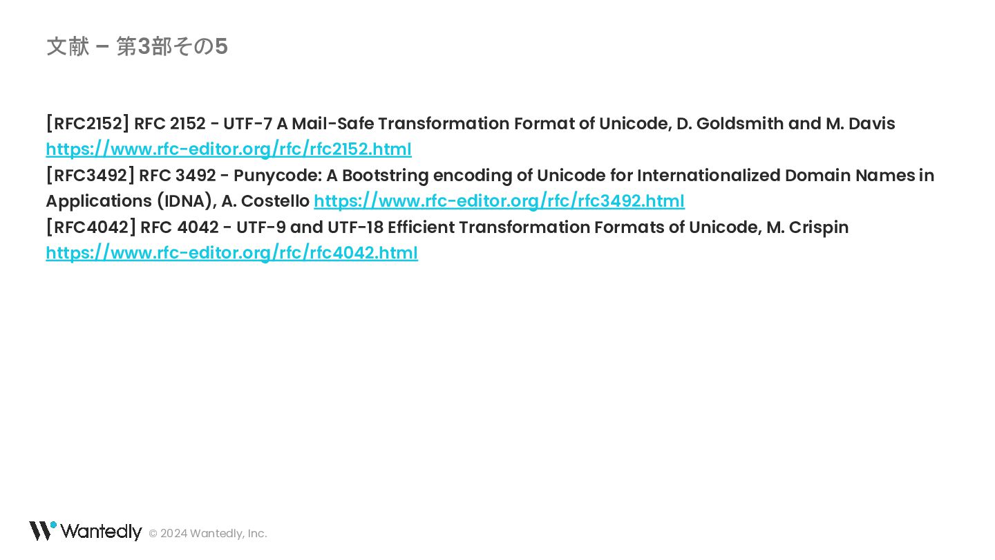 - UTF-7 A Mail-Safe Transformation Format of Unicode, D. Goldsmith and M. Davis https://www.rfc-editor.org/rfc/rfc2152.html [RFC3492] RFC 3492 - Punycode: A Bootstring encoding of Unicode for Internationalized Domain Names in Applications (IDNA), A. Costello https://www.rfc-editor.org/rfc/rfc3492.html [RFC4042] RFC 4042 - UTF-9 and UTF-18 Efficient Transformation Formats of Unicode, M. Crispin https://www.rfc-editor.org/rfc/rfc4042.html
