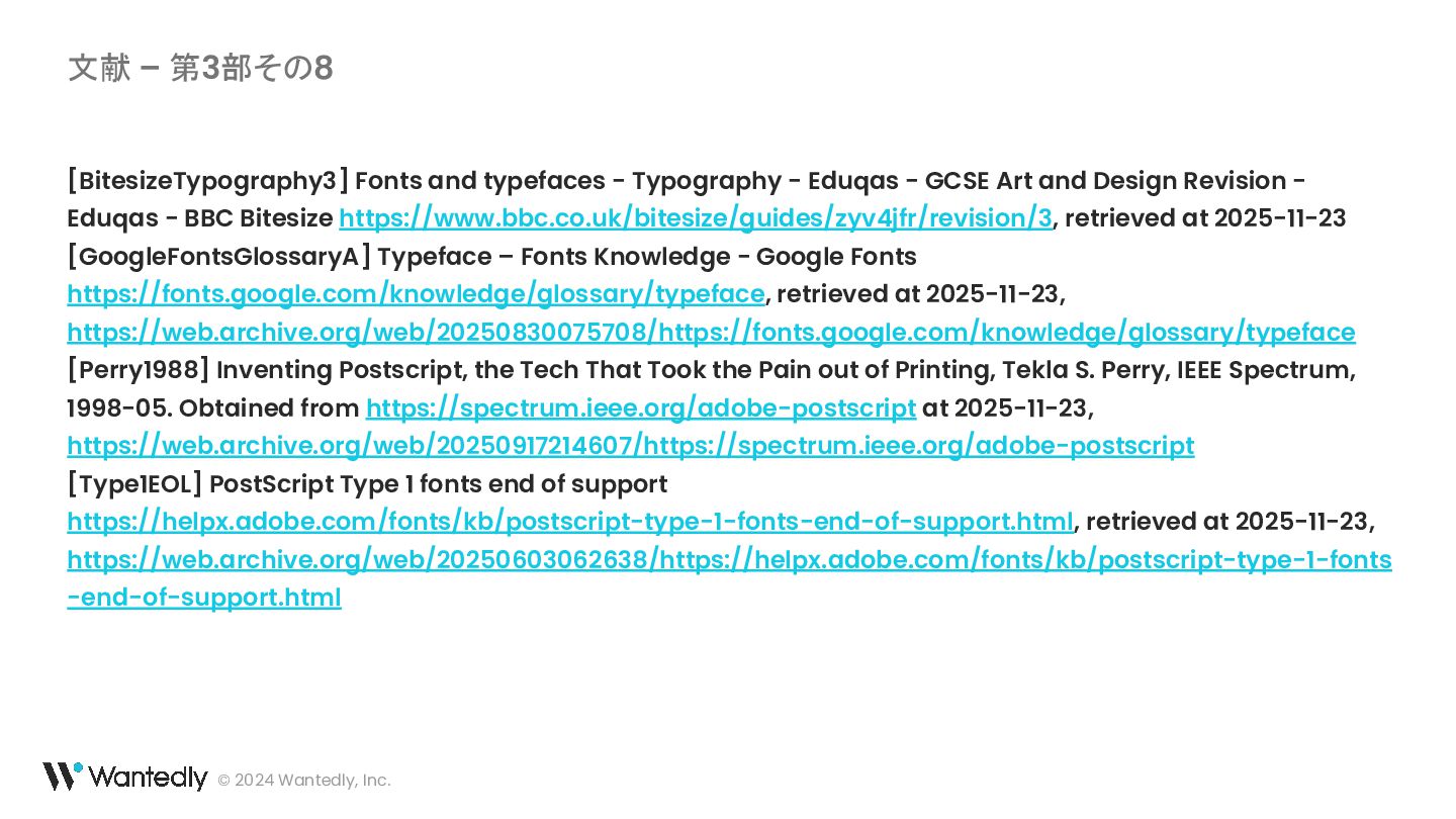 typefaces - Typography - Eduqas - GCSE Art and Design Revision - Eduqas - BBC Bitesize https://www.bbc.co.uk/bitesize/guides/zyv4jfr/revision/3, retrieved at 2025-11-23 [GoogleFontsGlossaryA] Typeface – Fonts Knowledge - Google Fonts https://fonts.google.com/knowledge/glossary/typeface, retrieved at 2025-11-23, https://web.archive.org/web/20250830075708/https://fonts.google.com/knowledge/glossary/typeface [Perry1988] Inventing Postscript, the Tech That Took the Pain out of Printing, Tekla S. Perry, IEEE Spectrum, 1998-05. Obtained from https://spectrum.ieee.org/adobe-postscript at 2025-11-23, https://web.archive.org/web/20250917214607/https://spectrum.ieee.org/adobe-postscript [Type1EOL] PostScript Type 1 fonts end of support https://helpx.adobe.com/fonts/kb/postscript-type-1-fonts-end-of-support.html, retrieved at 2025-11-23, https://web.archive.org/web/20250603062638/https://helpx.adobe.com/fonts/kb/postscript-type-1-fonts -end-of-support.html