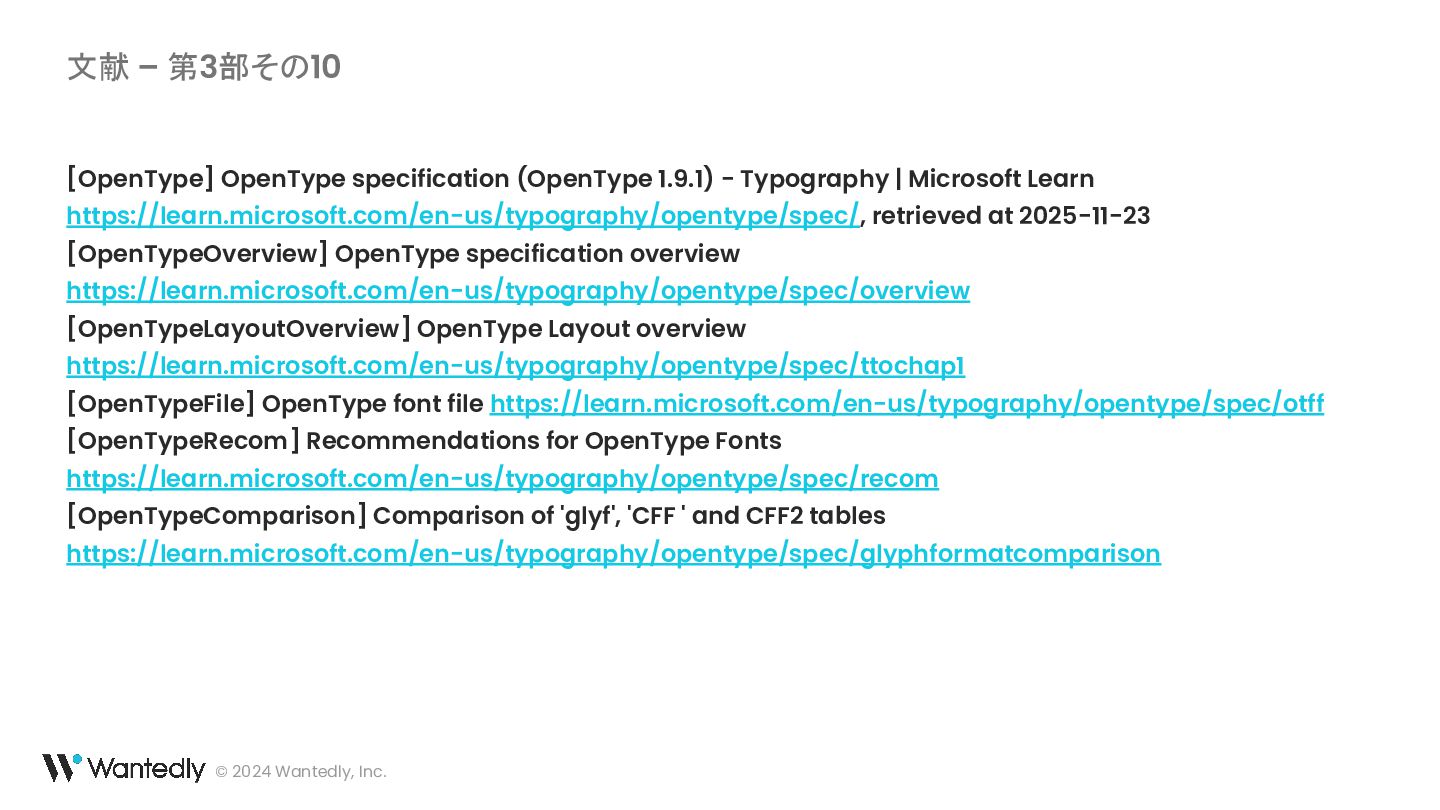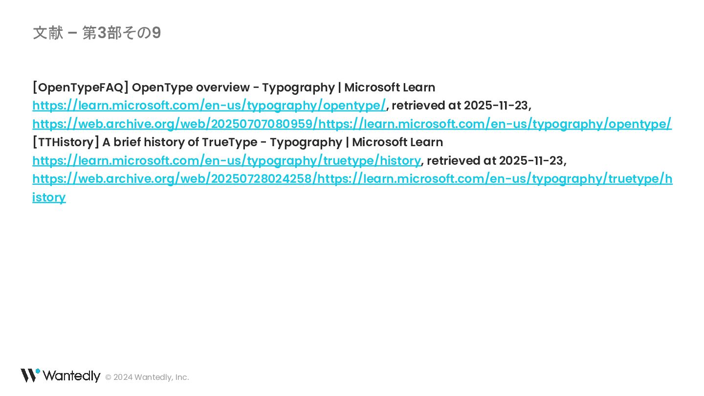 - Typography | Microsoft Learn https://learn.microsoft.com/en-us/typography/opentype/, retrieved at 2025-11-23, https://web.archive.org/web/20250707080959/https://learn.microsoft.com/en-us/typography/opentype/ [TTHistory] A brief history of TrueType - Typography | Microsoft Learn https://learn.microsoft.com/en-us/typography/truetype/history, retrieved at 2025-11-23, https://web.archive.org/web/20250728024258/https://learn.microsoft.com/en-us/typography/truetype/h istory