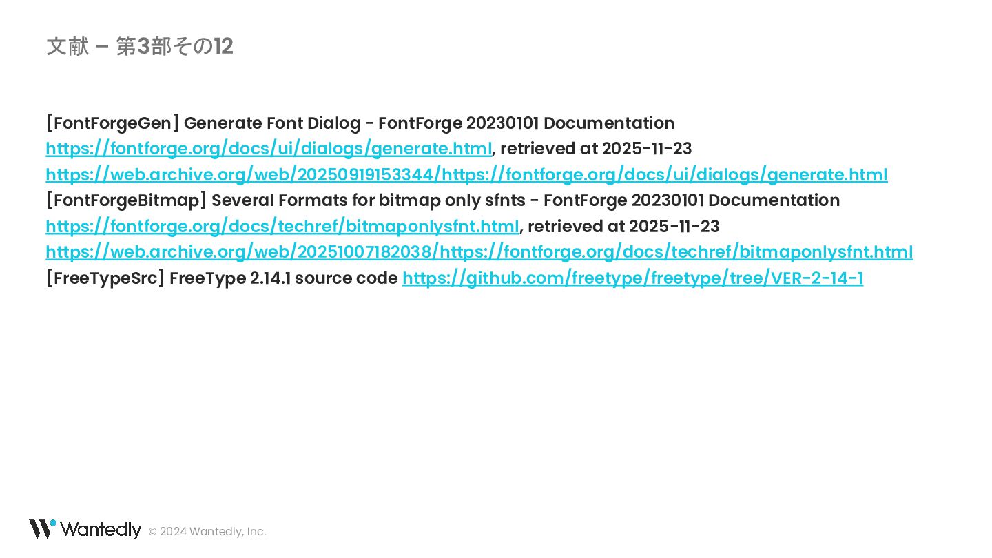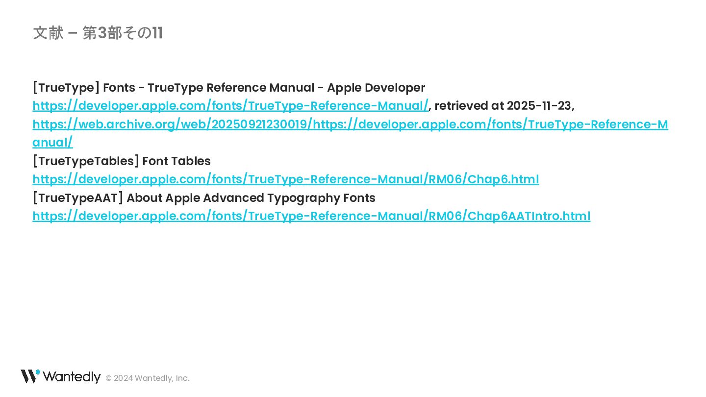 TrueType Reference Manual - Apple Developer https://developer.apple.com/fonts/TrueType-Reference-Manual/, retrieved at 2025-11-23, https://web.archive.org/web/20250921230019/https://developer.apple.com/fonts/TrueType-Reference-M anual/ [TrueTypeTables] Font Tables https://developer.apple.com/fonts/TrueType-Reference-Manual/RM06/Chap6.html [TrueTypeAAT] About Apple Advanced Typography Fonts https://developer.apple.com/fonts/TrueType-Reference-Manual/RM06/Chap6AATIntro.html