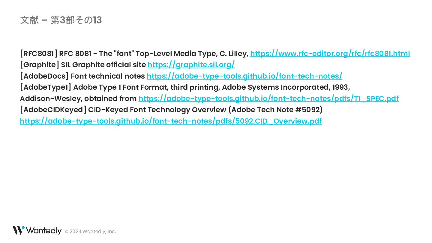 - The "font" Top-Level Media Type, C. Lilley, https://www.rfc-editor.org/rfc/rfc8081.html [Graphite] SIL Graphite official site https://graphite.sil.org/ [AdobeDocs] Font technical notes https://adobe-type-tools.github.io/font-tech-notes/ [AdobeType1] Adobe Type 1 Font Format, third printing, Adobe Systems Incorporated, 1993, Addison-Wesley, obtained from https://adobe-type-tools.github.io/font-tech-notes/pdfs/T1_SPEC.pdf [AdobeCIDKeyed] CID-Keyed Font Technology Overview (Adobe Tech Note #5092) https://adobe-type-tools.github.io/font-tech-notes/pdfs/5092.CID_Overview.pdf