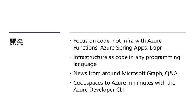 Azure Spring Apps, Dapr Infrastructure as code in any programming language News from around Microsoft Graph, Q&A Codespaces to Azure in minutes with the Azure Developer CLI
