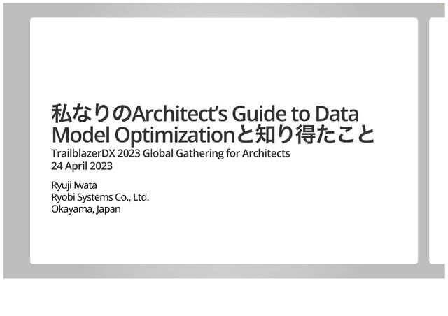 2023年4月24日(月)に東京とオンラインにて開催された「TrailblazerDX 2023 Global Gathering for Architects」での私の発表資料「私なりのArchitect’s Guide to Data Model Optimizationと知り得たこと」です。セッション動画のデータモデル最適化ガイドに私の所感を交えた形でご紹介させて頂きます。