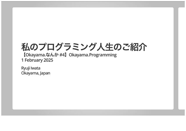 2025年2月1日(土)に岡山県倉敷市で開催された「【Okayama.なんか #4】Okayama.Programming」での私の登壇資料「私のプログラミング人生のご紹介」です。学生時代から社会人そして現在まで私が触ってきたプログラミング言語とそこから得られたモノについてご紹介させて頂きました。