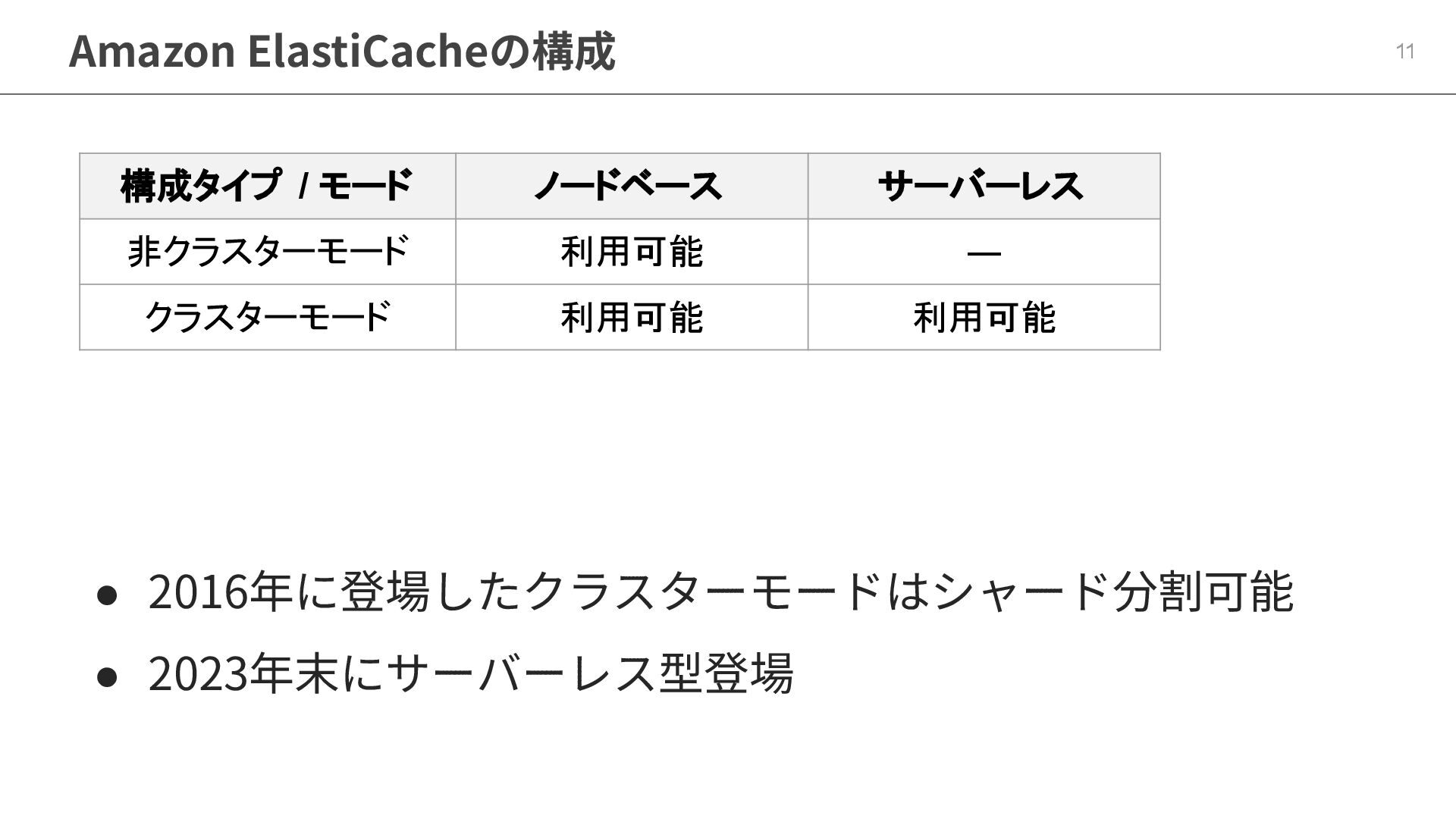 4. Amazon ElastiCacheの構成 10 • 2016年に登場したクラスターモードはシャード分割可能 • 2023年末にサーバーレス型登場 構成タイプ / モード