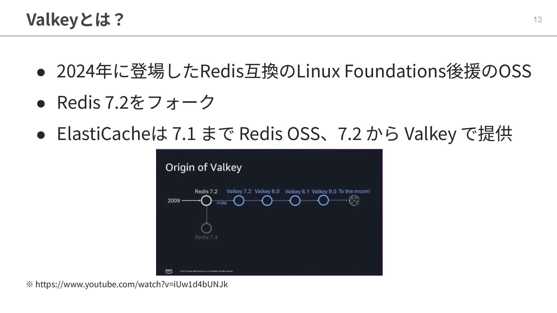 5. Valkeyとは? 12 • 2024年に登場したRedis互換のLinux Foundations後援のOSS • Redis 7.2をフォーク • ElastiCacheは