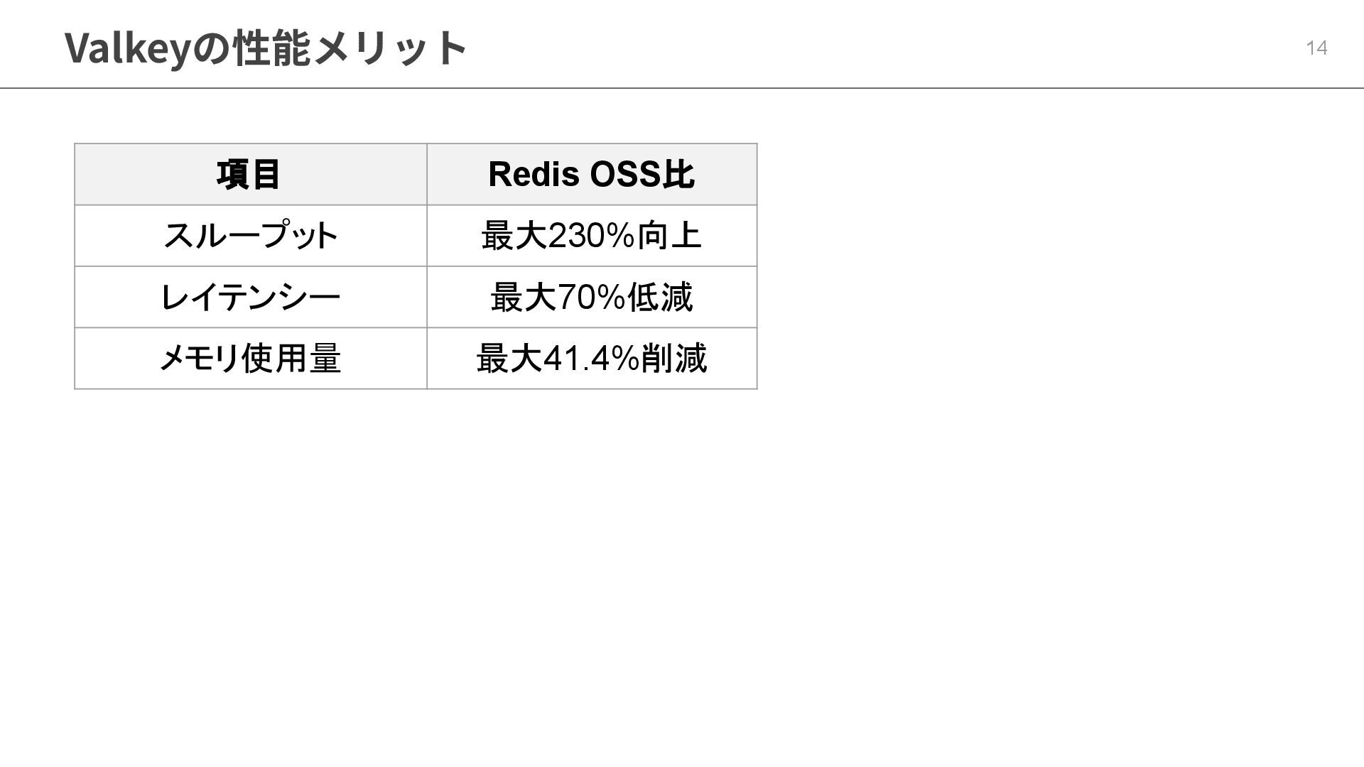 新機能やパフォーマンス改善の恩恵 ▪ Valkey • スループット : 最⼤230%向上 • レイテンシー : 最⼤70%低減 • メモリ使⽤量 : 最⼤41.4%削減