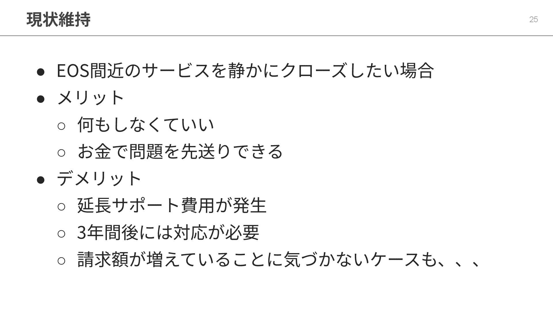 • デメリット ◦ 延⻑サポート費⽤が発⽣ ◦ 3年間後には対応が必要 ◦ 請求額が増えていることに気づかないケースも、、、