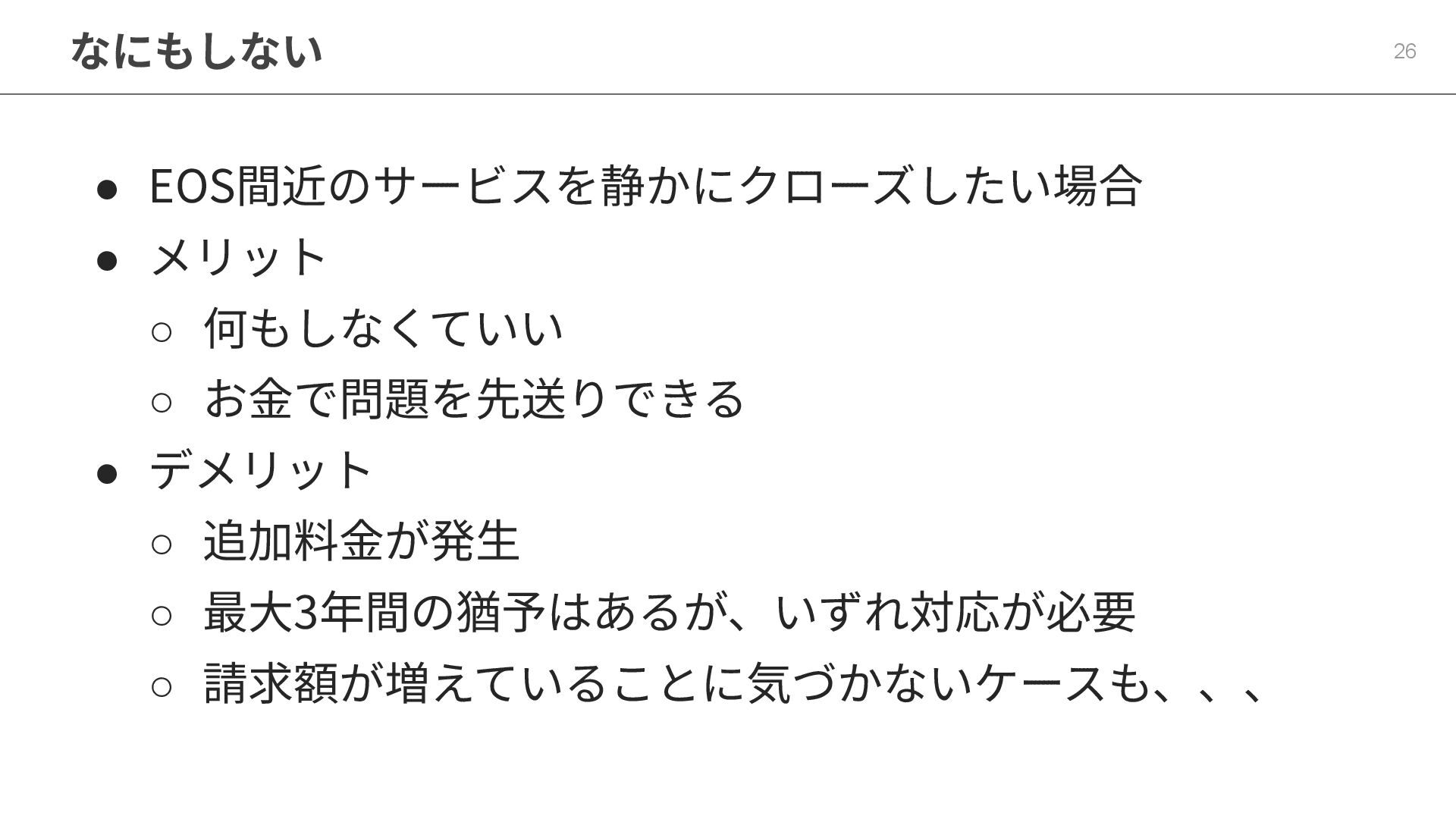 6. 現状維持 25 • EOS間近のサービスを静かにクローズしたい場合 • メリット ◦ 何もしなくていい ◦ お⾦で問題を先送りできる